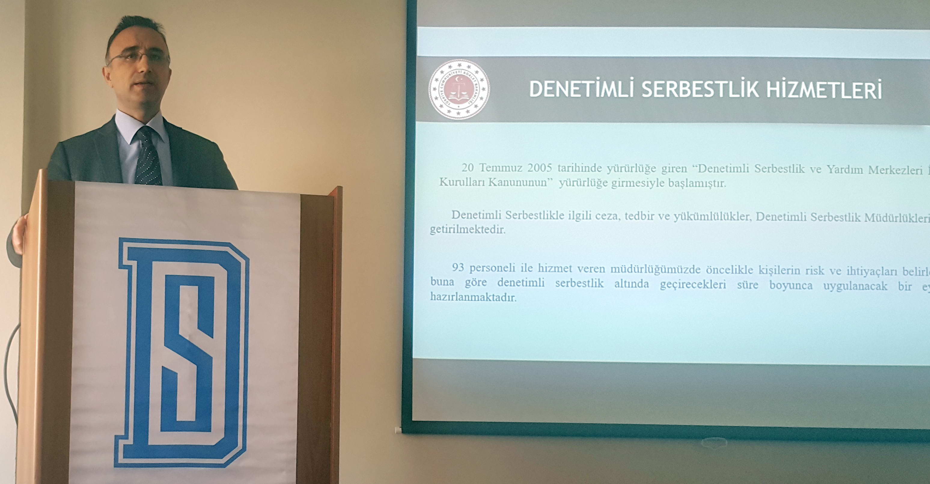 Teknik gezi kapsamında, Gaziantep Denetimli Serbestlik Müdürü Taylan Beydoğan ve Denetimli Serbestlik Uzmanı Aydın Ökçüntekle tarafından öğrencilere Gaziantep Denetimli Serbestlik Müdürlüğünde yapılan faaliyetler tanıtıldı. Daha sonra Denetimli Serbestlik Müdürlüğü’nün konferans salonunda Denetimli Serbestliğin amacı ve yapılan faaliyetlerle ilgili bir sunum yapıldı. Gaziantep Denetimli Serbestlik Müdürü Beydoğan yaptığı sunumda şunları söyledi: “Mahkemeler, Denetimli Serbestlik kararı verdiğinde bu karar Denetimli Serbestlik Müdürlükleri tarafından kamuya yararlı ücretsiz bir işte çalıştırma, konutta denetim ve gözetim altında bulunma, belirlenen yerlere imza yükümlülüğü, programlara katılma, belirli bir süre tedaviye tabi tutma şeklinde icra edilir. Denetimli Serbestlik Müdürlüğü olarak bizler birçok Sivil toplum kuruluşuyla, Gaziantep Üniversitesi, belediyeler gibi kamu kurum ve kuruluşlarıyla ortaklaşa projeler geliştirmekteyiz. Bu amaçla çeşitli seminerler, grup çalışmaları, sosyal faaliyetler, kurslar düzenleyerek eğitim ve iyileştirme faaliyetleri icra etmekteyiz. Buradaki amaç bu denetimlere tabi tutulan kişilerin takip ve iyileştirilmesi ve tekrar topluma kazandırılmasıdır.”