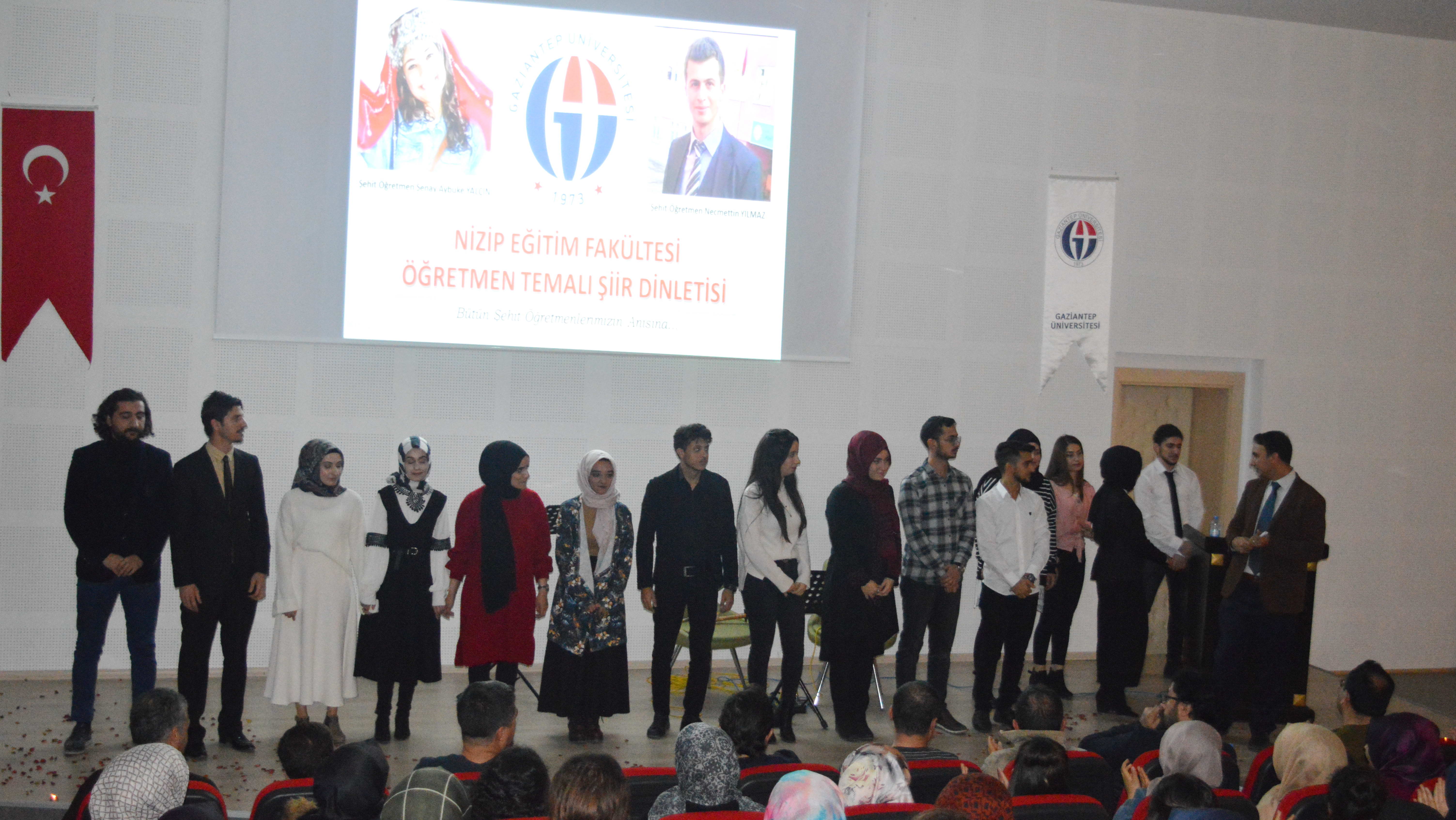 Gaziantep Üniversitesi (GAÜN) Nizip Eğitim Fakültesi’nde şehit öğretmenler anısına şiir dinletisi gerçekleşti. Öğrencilerin sosyal ve kültürel yönlerini geliştirmek, öğretmenlik mesleğinin önemini vurgulamak, öğretmenlik mesleğine ilişkin bilinç aşılamak ve kişisel özelliklerini geliştirmek amacıyla şehit öğretmenler anısına Dr.Öğr.Üyesi Cafer Çarkıt ve Dr.Öğr.Üyesi MevlütKara'nın denetiminde akademik ve idari personel ile öğrencilerin katılımıyla "Öğretmen” temalı şiir dinletisi gerçekleştirildi.