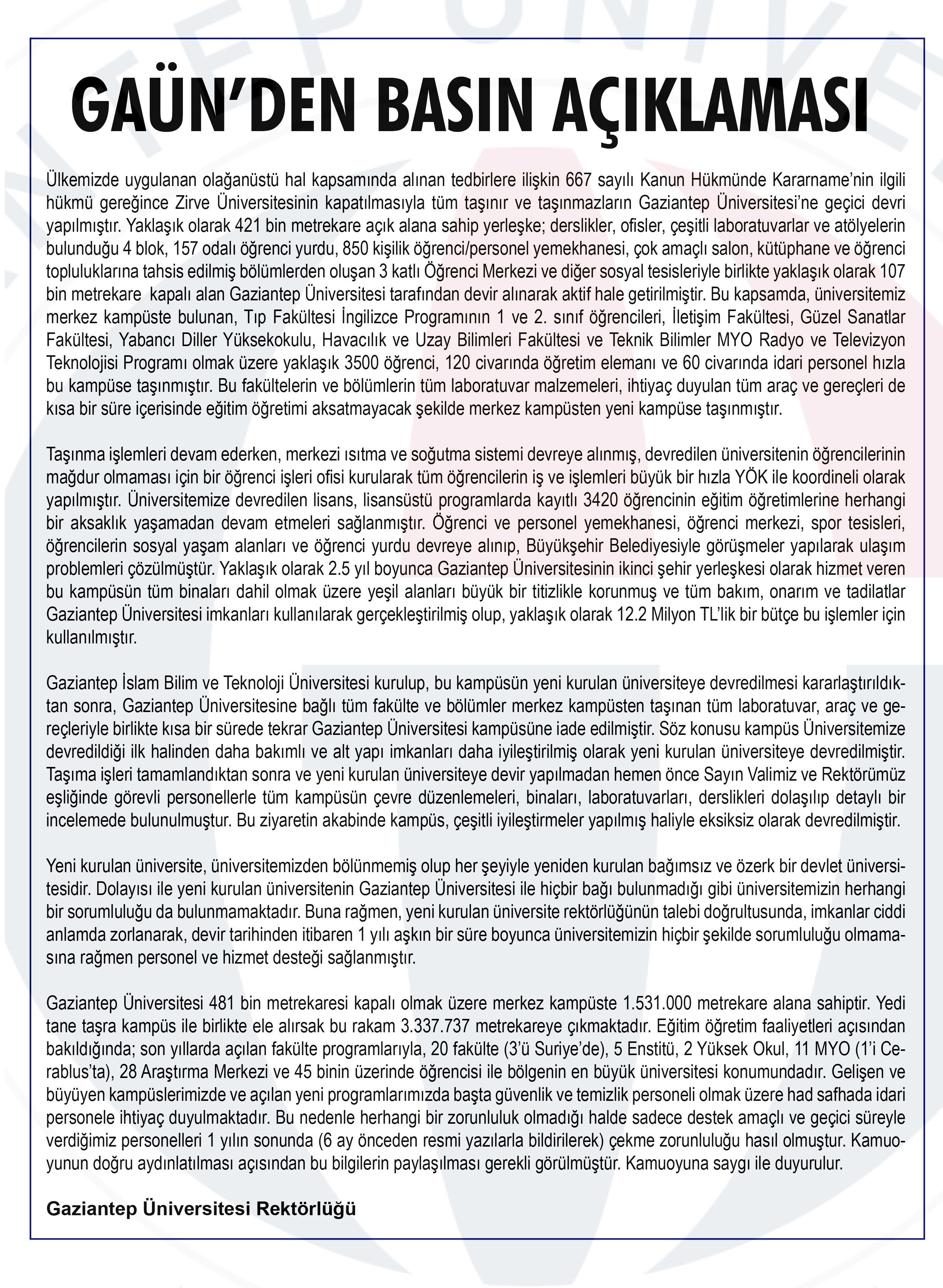 Gaziantep Üniversitesi Rektörü Prof. Dr. Ali Gür, sosyal medyada şahsı ve GAÜN ile ilgili dolaşan iddiaları sert bir dille cevaplandırdı. Gür, "3.5 yıllık rektörlük dönemimde hak ve adaletten ayrılmadan, açık ve şeffaf bir yönetim sergiledim. Yanlışa bulaşmadım. Veremeyeceğim hiç bir hesabım yok. Üniversitede akademik ve idari kadroda tek bir yakınım çalışmıyor. Üniversitemize hayırsever ve iş adamları tarafından bağış yapılmamaktadır. Yani,…