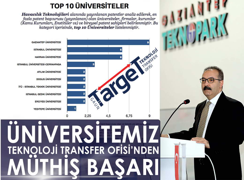 Gaziantep Üniversitesi Teknoloji Transfer Ofisi’nin başarılı çalışmaları sonucu özellikle patent ve lisanslama konusunda son derece önemli bir başarı sağlandığını belirten GAÜN Rektörü Prof. Dr. Ali Gür, “GAÜN Target TTO daha önce de Girişimci ve Yenilikçi Üniversite Endeksi’nde Fikri ve Sınai Mülkiyet Hakları Havuzu’nda birinciliği tam puan ile kazanırken, Sanayi ve Teknoloji Bakanlığı’nın En Hızlı Gelişim Gösteren 2. Teknoparkı olmayı da başarmıştı. Teknoparkımız, bu başarısından dolayı, Sanayi ve Teknoloji Bakanımız Sayın Mustafa Varank Bey tarafından plaketle ödüllendirilmişti” dedi. Türkiye’de faaliyet gösteren yerli firmalar, kurumlar, üniversiteler ve kişiler tarafından yapılan patent başvurularından yayınlanan başvuruların sahiplerinin değerlendirildiği 7Birinci Top 10 üniversiteler’ listesinde 71 başvuruyla 7. Sırada yer almayı başardığını kaydeden Rektör Prof. Dr. Gür, “Başvuru sıralamasında il olarak DA Gaziantep ise 10. sırada listeye girdi” diye konuştu.