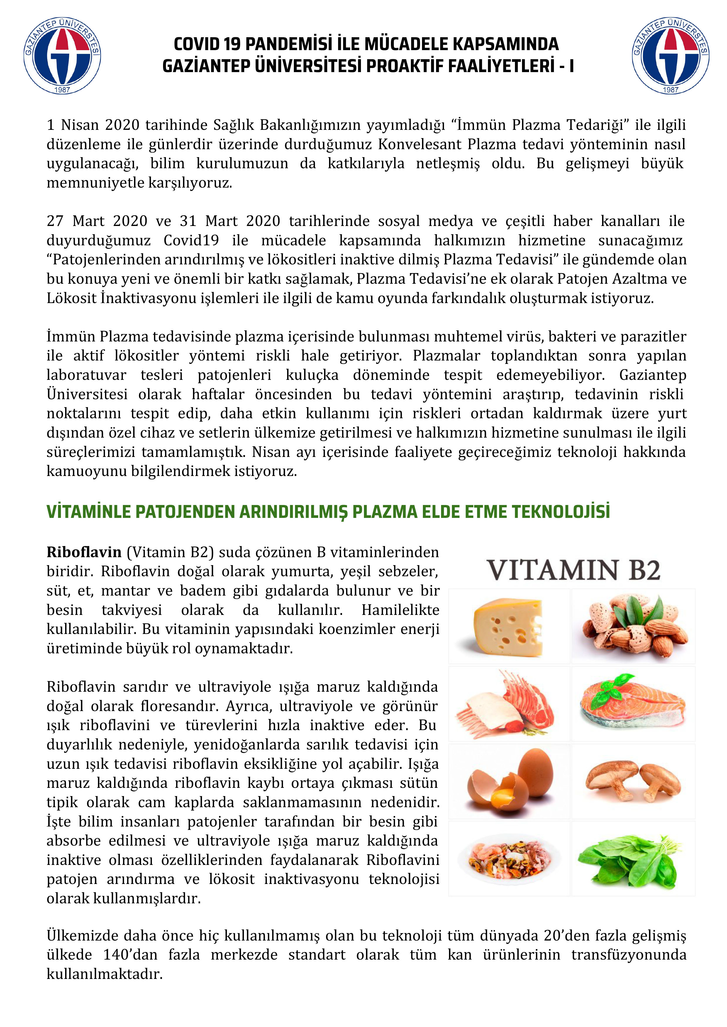 Dünyayı kasıp kavuran COVID-19 pandemisiyle mücadele için ilk olarak KONVELASAN İMMUN PLAZMA tedavisinin Türkiye’de uygulanmasını gündeme getiren ve bu konuda süratli bir çalışma başlatan Gaziantep Üniversitesi, söz konusu yöntemin sırrını kamuoyuyla paylaştı. Rektör Prof. Dr. Ali Gür, gündeme getirdikleri tedavi yönteminin ana ilkesinin iyileşen COVID-19 hastalarından alınan plazmanın, 7 dakikada B2 vitaminiyle ve Ultraviyole Işınları ile patojenlerden arındırılıp, hastaya nakletmek olduğunu söyledi.
