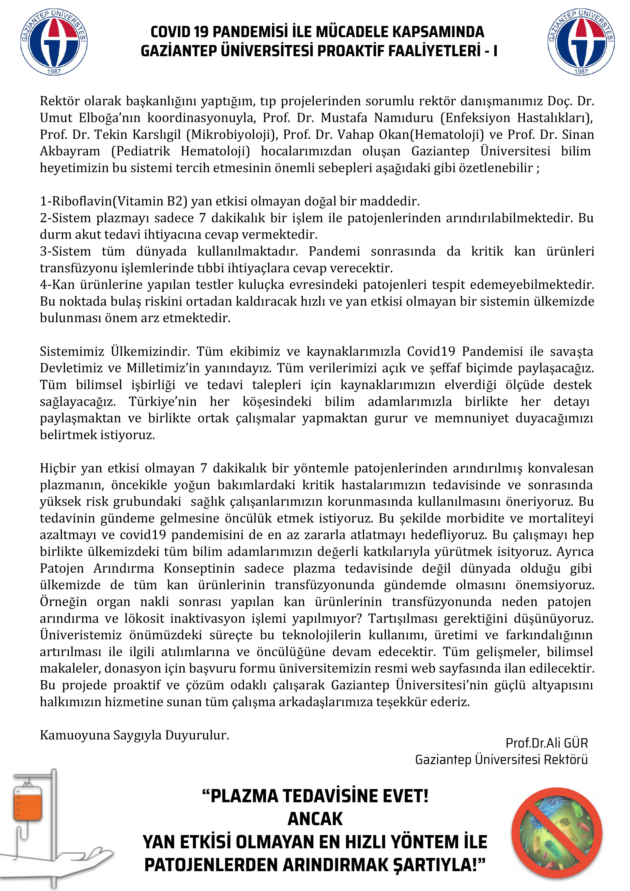 Bu amaçla kendisinin başkanlığında, Rektör Danışmanı ve Nükleer Tıp Anabilim Dalı Öğretim Üyesi Doç. Dr. Umut Elboğa’nın koordinasyonunda Prof. Dr. Mustafa Namıduru (Enfeksiyon Hastalıkları), Prof. Dr. Tekin Karslıgil (Mikrobiyoloji), Prof. Dr. Vahap Okan (Hematoloji) ve Prof. Dr. Sinan Akbayram’dan (Pediatrik Hematoloji) oluşan Bilimsel Kurul’un yoğun bir çalışma sürecine girdiğini kaydeden Rektör Prof Dr. Ali Gür açıklamasını şöyle sürdürdü: “Yaptığımız araştırmalar, Dünya’da, özellikle Çin’de yapılan tedavilere ilişkin rehberler, haberler, yayınlar ve pandemi ile mücadelede geçmişe ait bilimsel veriler bizi iyileşmiş hastalardan elde edilen KONVALESAN PLAZMA tedavisine götürdü. KONVALESAN PLAZMA hem kritik hastaların tedavisinde, hem de sağlık çalışanları gibi yüksek risk grubunda olanlarda koruyucu olarak kullanılabilmekteydi.   Ülkemizde daha önce hiç kullanılmamış olan teknolojiyle KONVALESAN PLAZMA tedavisini vermek için kolları sıvadık. Bu teknoloji Patojen Arındırma Teknolojisi idi. Bu işlemi dünyada yapabilen sistemleri araştırdık. Araştırmalarımız bize en hızlı ve en güvenilir olanın; B2 vitaminiyle alınan plazmayı işlemden geçiren ve sonrasında ultraviyole ışınları ile ışınlayan sistem olduğunu gösterdi. Az sayıda olan diğer patojenden arındırma teknolojisinin ise neden tercih edilmediği sorusunun yanıtı detaylı kıyaslama yapan yayınlarla Gaziantep Üniversitesinin bu tedavi için oluşturacağı web sitesinde sizlerle paylaştık. Şunu söylemeliyiz ki bizim tercihimizin diğerlerinden en büyük farkı herhangi toksit etkisi olmayan bir madde ile plazmanın işlem görüyor olması ve 7 dakika gibi kısa bir sürede tüm patojen arındırma işleminin sonlanıyor olmasıydı. Türkiye’de ilk kez üniversitemizce kurulacak patojenlerinden arındırılma sistemi en geç Nisan ayının sonunda güvenilir ve hızlı KONVALESAN PLAZMA tedavilerine imkan sağlayacaktır.”