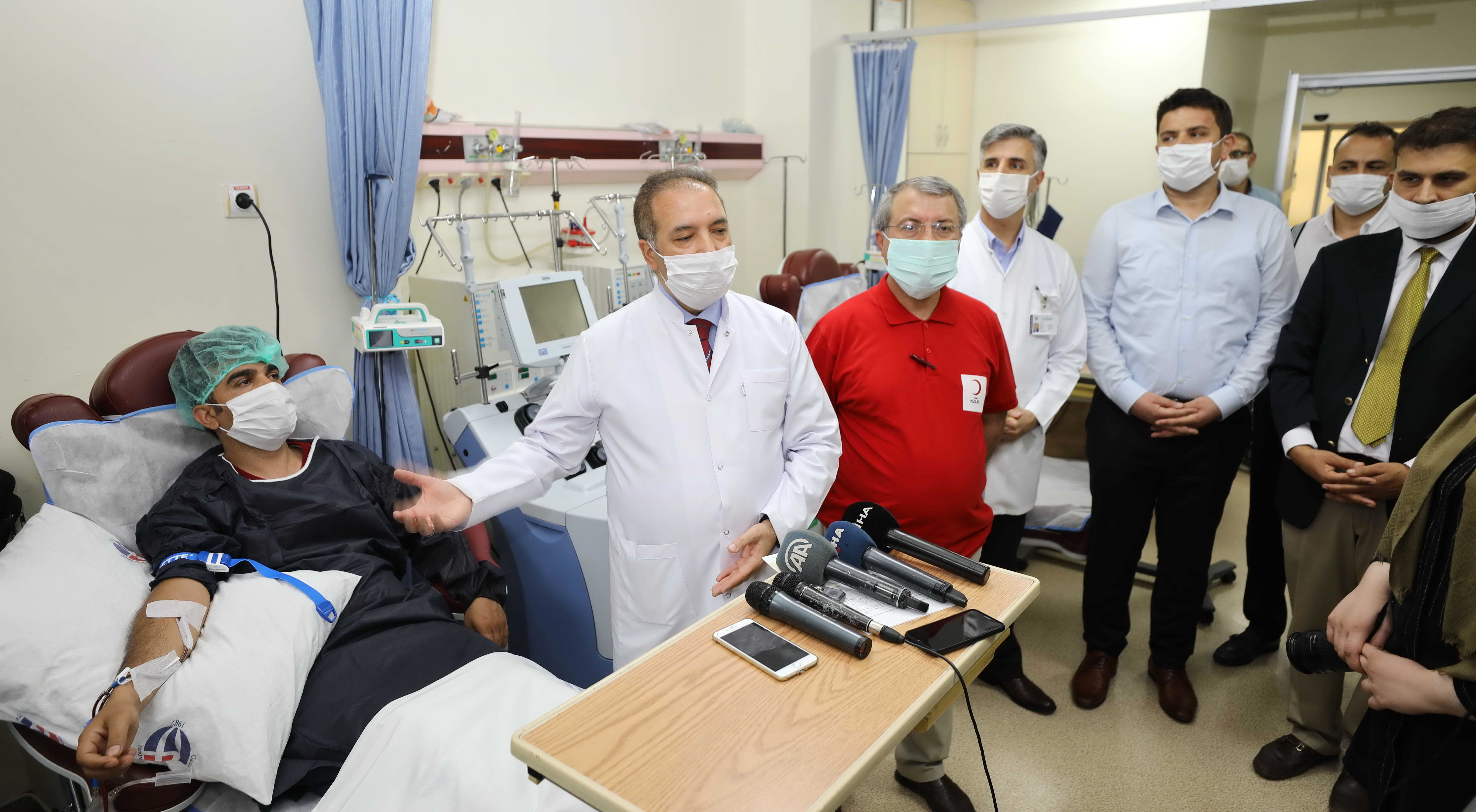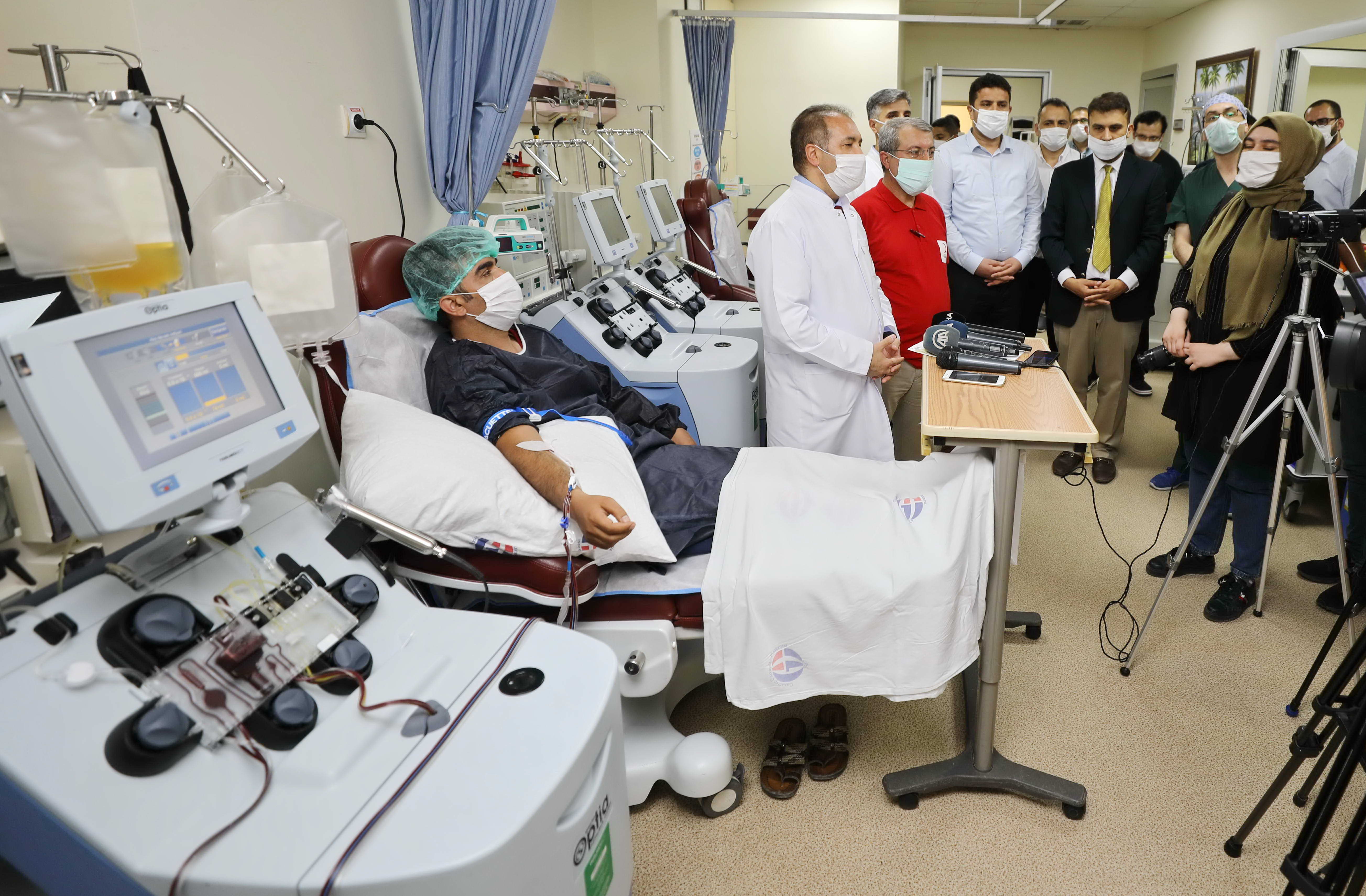 Patojenlerden Arındırılmış İmmün Plazma Üretim Sistemi için hastalığı yenip, vücudunda antikor oluşan kişilere kan bağışı çağrısında bulunan Rektör Prof. Dr. Ali Gür açıklamasını şöyle sürdürdü: “Şu anda yoğun bakımdaki hastalarımız için kullanacağımız kanı veren hastamız 35 yaşındaki Hasan Çokgezici bir fabrika işçisi, hastalığı dayısı ile birlikte yendikten sonra 23 Nisan 2020’de hastanemizde plazma bağışında bulunmuştu. Şimdi yeniden ihtiyaç olduğunu belirterek aradığımızda iş çıkışı evine bile gitmeden hastanemize geldi. Kendisini kutluyor ve diğer iyileşen hastalarımıza da umut olmasını diliyoruz. Şu aşamada plazma bağışı çok önemli. Unutmamalıyız ki yoğun bakım ya da solunum cihazına bağlı olarak tedavi edilmeye çalışılan hastalar hepimizin yakını olabilir. Bu vesileyle toplumda COVİD geçirmiş olan uygun donör hastalarımızın mutlaka verici olmasının kendileriyle beraber ailelerine ve topluma fayda vereceğini söylemek istiyoruz. Donörlerden plazma alınmadan önce bunların gerekli COVID 19 plazma bağışçısı kurallarına uygunluğu dikkatli bir şekilde test ediliyor. Her hastadan ortalama 600 mililitre plazma alınıyor ve bu plazma 200 ml. halinde 3 COVİD hastasına verilebiliyor. Plazmanın patojenlerden arındırılma işlemi ortalama 7 dakika sürüyor.”