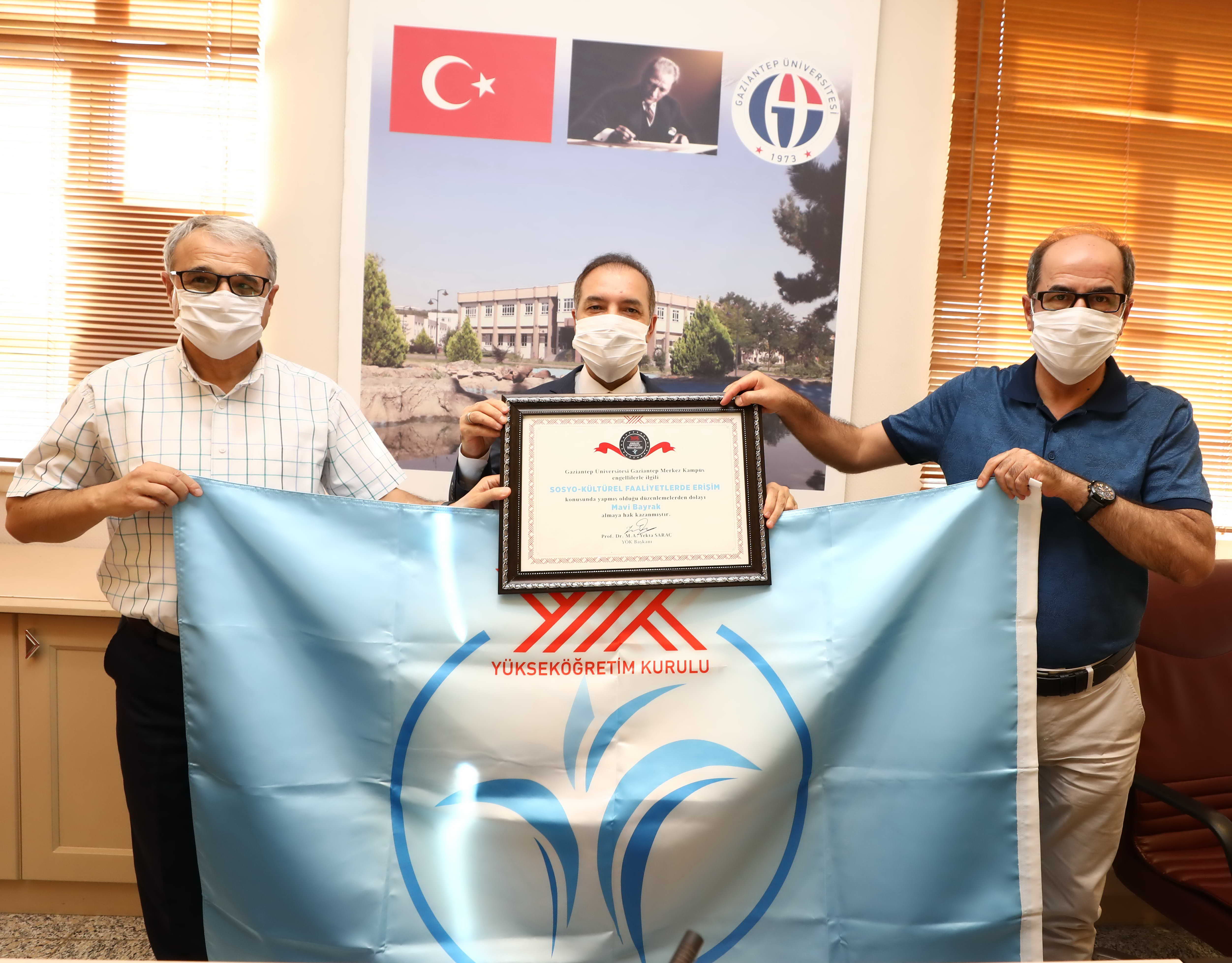 YÖK’ün Engelsiz Üniversite Yarışması’nda dereceye giren fakülte ve birimlerin belgeleri GAÜN Rektörlük Senato Salonunda Rektör Prof. Dr. Ali Gür, Rektör Yardımcısı Prof. Dr. Metin Bedir, Genel Sekreter Doç. Dr. Ayhan Doğan, Engelli Birim Müdürü Dr. Öğretim Üyesi Fatih Demir, Engelli Birim çalışanı Serdar Oymacı ve Kalite Birimi Sorumlusu Öğr. Gör. Derya Özçalışkan’ın katılımıyla gerçekleştirildi. Törende konuşan GAÜN Rektörü Prof. Dr. Ali Gür, bayrak ve belge almaya hak kazanan tüm birimleri tebrik etti. Gaziantep Üniversitesi olarak engelli dostu bir kampüse sahip olmanın önemini bildiklerini söyleyen Prof. Dr. Gür, mekanda erişim konusunda kazanılan Turuncu Bayrak için, kampüsün sadece engelli öğrencilere değil, engelli personele de hizmet verdiğini bu nedenle kampus erişilebilirliğini artırmayı yönelik çalışmaların devam ettiğini ifade etti. Prof. Dr. Gür, “Sosyo-Kültürel alanda kazanılmış olan Mavi Bayrak için; tüm kampüsteki sosyal ve kültürel faaliyetler yürütülüyor. Mavera Kongre ve Kültür Merkezi, Amfi Tiyatro, Atatürk Kültür Sahnesi, konferans salonları ve diğer spor kompleksleri tüm öğrencilerimizin erişimine açık hale getirilmiştir. Bu alanlar, pandemi sürecinden önce ortalama yıllık bin civarında etkinliğe ev sahipliği yapmaktaydı” dedi.