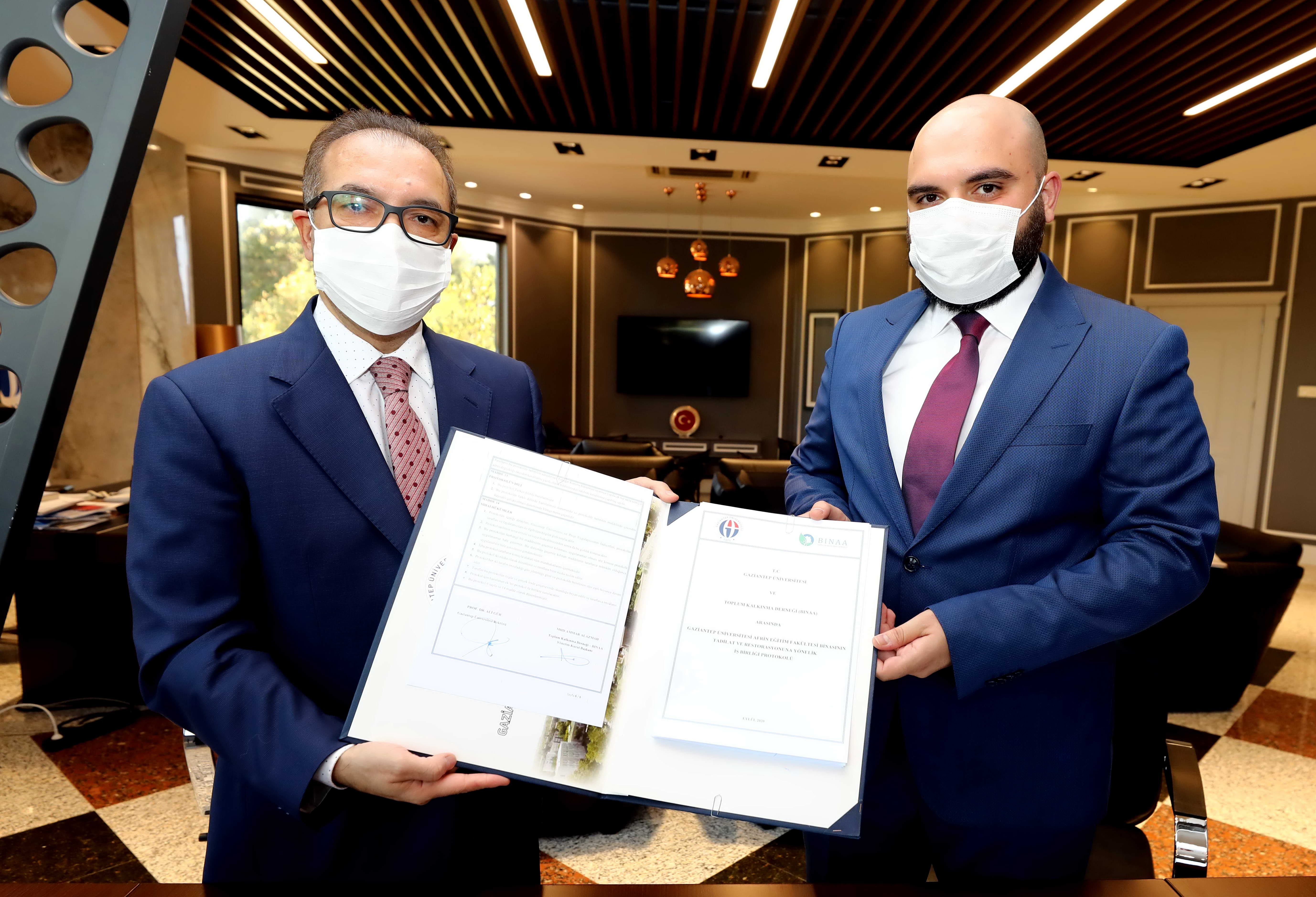 Gaziantep Üniversitesi (GAÜN) ile BİNAA Toplum Kalkınma Derneği arasında, Afrin Eğitim Fakültesi Binası’nın tadilat ve restorasyonuna yönelik iş birliği protokolü imzalandı.