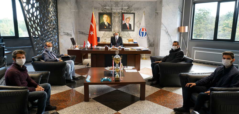 TEKNOFEST 2020’de TÜBİTAK Uluslararası İnsansız Hava Araçları Yarışması’nda ‘Sabit Kanat’ kategorisinde 55 finalist takım içerisinde mansiyon ödülünü kazanan Gaziantep Üniversitesi (GAÜN) Elektrik Elektronik Mühendislik Bölümü öğrencilerinden oluşan ‘Hidden Danger’ takımı, Rektör Prof. Dr. Arif Özaydın’ı makamına ziyaret etti.