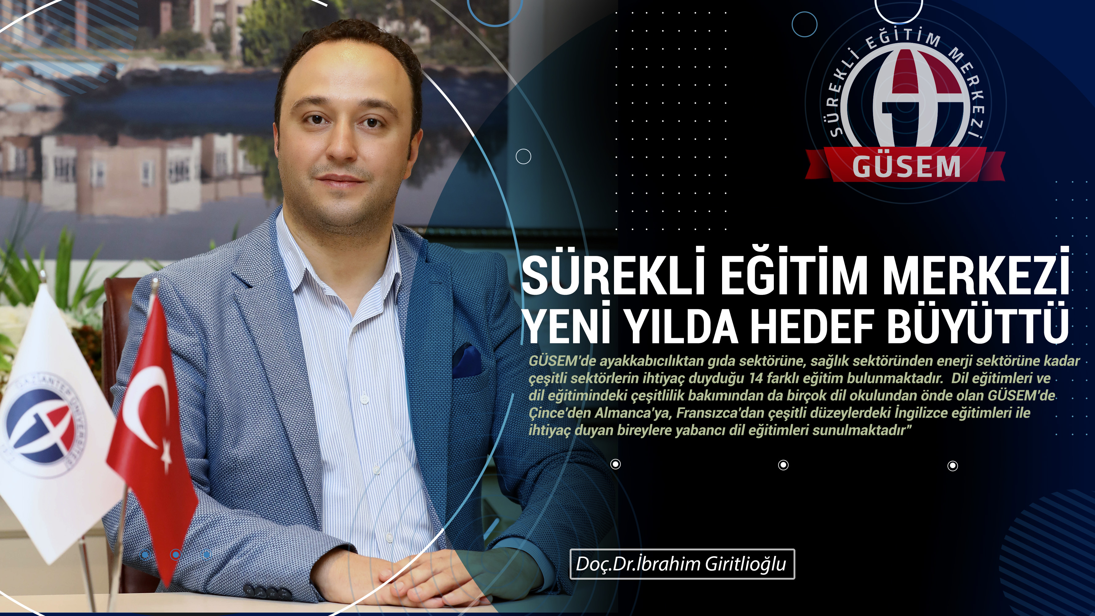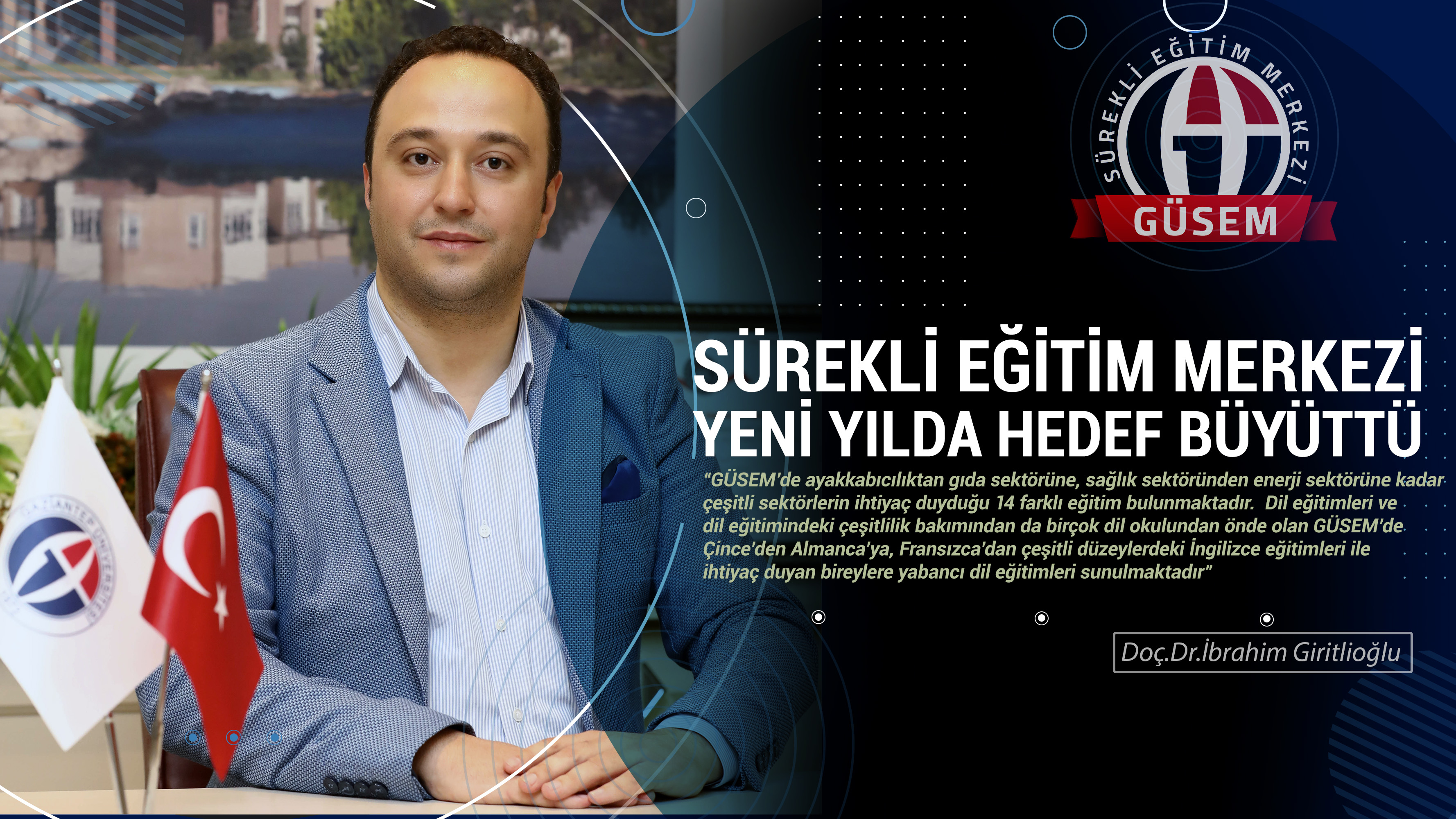 GÜSEM’in çalışmaları hakkında bilgi veren Sürekli Eğitim Merkezi Müdürü Doç. Dr. İbrahim Giritlioğlu, geçtiğimiz yıl kasım ayından bu yana önemli dönüşümler gerçekleştirdiklerini ifade etti. Doç. Dr. Giritlioğlu; “Bu kapsamda içsel süreçlerin dijitalleştirilmesi, online eğitimlerde yenilikçi yaklaşımlar ve talep-ihtiyaç odaklı çeşitli eğitimlerin geliştirilmesi en temel uygulamalarız oldu. Gaziantep sanayisi ve yerel halkın ihtiyaç duyduğu tüm eğitimleri ilgili paydaşlarla istişare ederek geliştirme eğilimindeyiz. GÜSEM olarak yenilik temelli uygulamalara çok ciddi şekilde önem veriyoruz. Sürekli gelişim odaklı ve her kesime uygun eğitimler GÜSEM bünyesinde açıldı. Bundan sonra da bu eğitimleri hem içerik hem de çeşitlilik olarak daha fazla arttıracağız.”