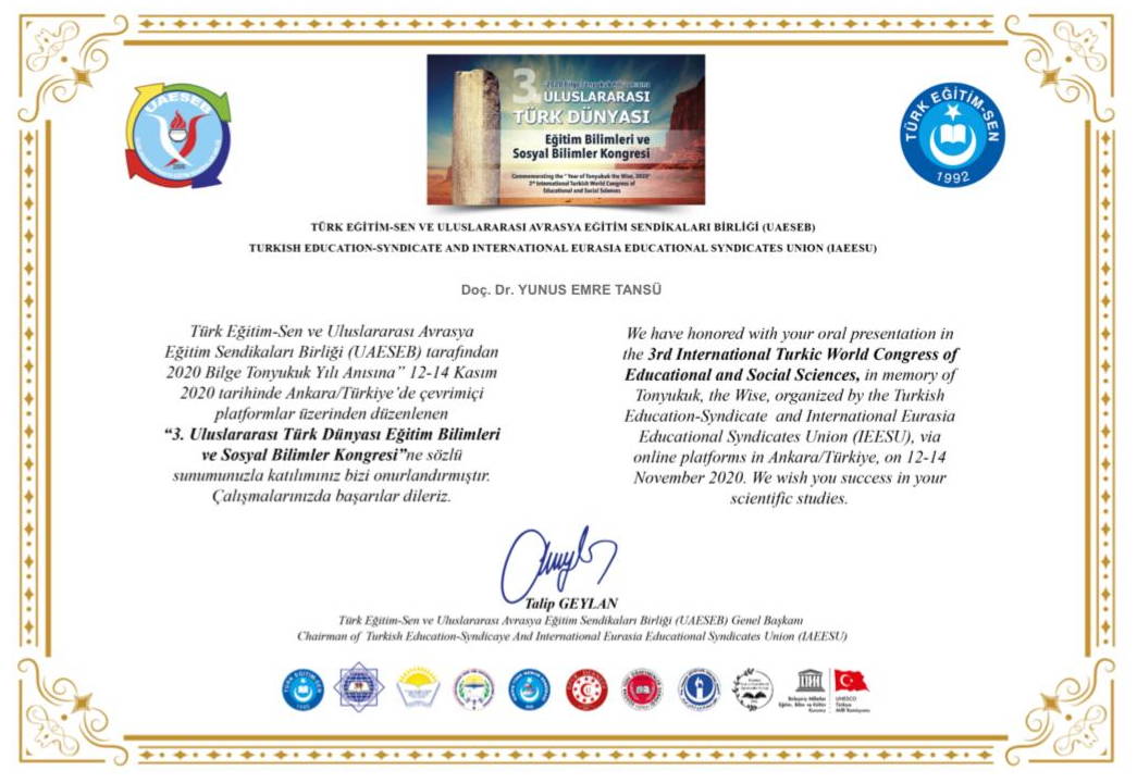 2020 yılının UNESCO tarafından Bilge Tonyukuk Yılı ilan edildiğini ve bu münasebetle Bilge Tonyukuk Başarı Ödülü’nü almaktan gurur duyduğunu ifade eden Doç. Dr. Yunus Emre Tansü, “Daha önce de Dede Korkut Araştırma Teşvik Ödülü almıştım. Bilge Tonyukuk ve Dede Korkut gibi Abidevi Türk büyükleri adına aldığım ödüller ve İKSAD Bilim Ödülü benim için övünç kaynağı. Beni bu ödüllere layık görenlere teşekkürlerimi sunuyorum” dedi.