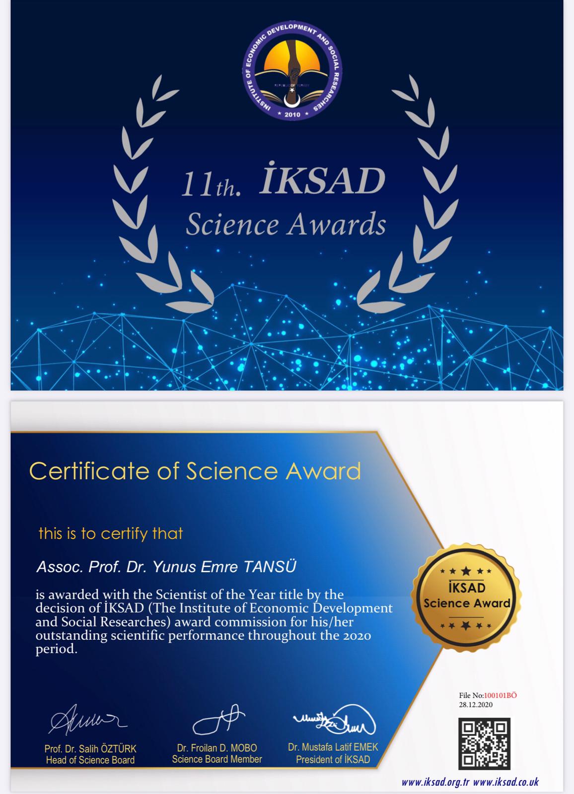 Doç. Dr. Tansü, İKSAD 11. Bilim Ödülü’nü Gaziantep Üniversitesi Fen Edebiyat Fakültesi’nde İKSAD Başkanı Mustafa Latif Emek ile İKSAD Başdanışmanı ve Murahhas Üye Sefa Salih Bildirici’nin elinden aldı.  Doç. Dr. Yunus Emre Tansü, 2020 yılında İKSAD tarafından “Yılın Bilim İnsanı” seçilmekten ve 11. Bilim Ödülü’ne seçici kurul tarafından layık görülen bilim insanları arasında yer almaktan onur duyduğunu belirtti.