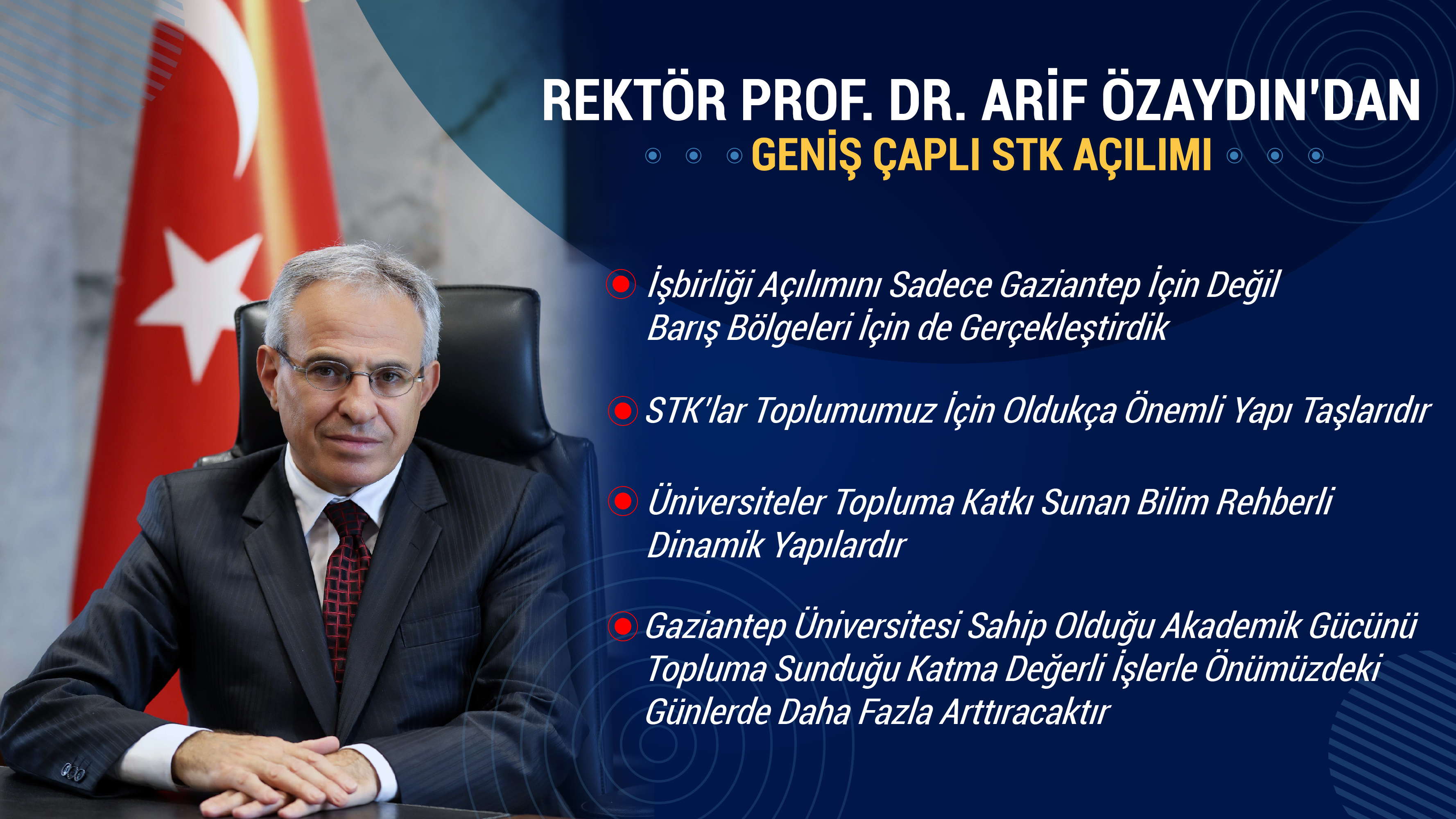 Gaziantep Üniversitesi olarak şehrimize ve bölgemize önemli düzeyde katkılar sunduğunu belirten Rektör Prof. Dr. Özaydın şu ifadelerde bulundu:  “GAÜN olarak araştırma hastanemiz, GÜSEM, TARGET ve TEKNOPARK’ımız topluma ilişkin işbirlikleri kapsamında ihtiyaç odaklı faaliyetlerimizle şehrimize ve bölgemize her geçen gün daha geniş perspektiften önemli katkılar sunmaktayız. Sahip olduğumuz akademik yapı ve yenilikçi yönetim uygulamalarıyla Toplumsal Duyarlılık Merkezi Programı (TDP) kapsamında halkımıza gönülden dokunabilecek projeler geliştirirken bazı ulusal ve uluslararası kurum ve kuruluşlardan aldığımız çeşitli büyüklükteki projeler ile bölgemizin ihtiyaç duyduğu uygulamaları hayata geçiriyoruz.” GAÜN Rektörü Prof. Dr. Özaydın, her zaman yenilikçi ve güncel bir bakışa sahip olduğunu vurgulayarak, GAÜN olarak halkımız ve sanayimizin ihtiyaç duyduğu tüm uygulamaları üniversite bünyesinde geliştirmeyi vizyon edindiklerini belirtti.