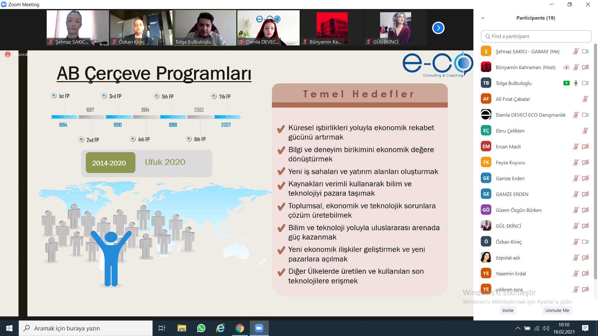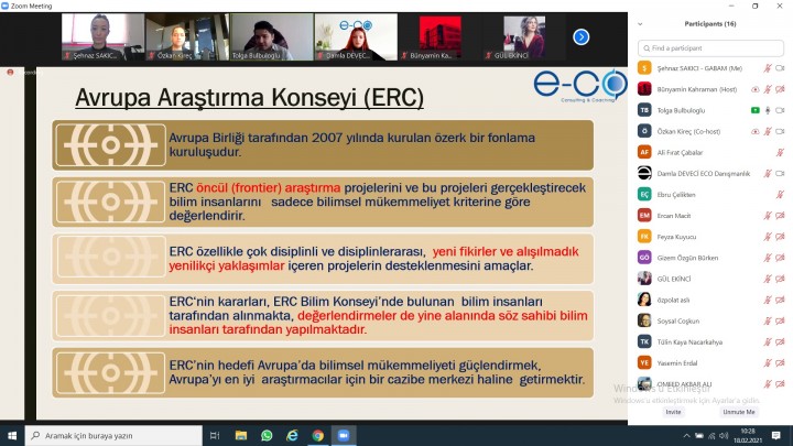 Etkinlik programı kapsamında, E-CO Consulting&Coaching firması uzman ekibi tarafından Horizon Europe ve ERC genel bilgiler, programın amaç ve hedefleri, başarı öyküleri, başvuru form ve eklerinin incelenmesi, başarılı projenin hazırlık ve yazım aşamasında göz önüne alınması gereken önemli hususlar, başvuru sistemi ve süreçler hakkında, araştırmacılara bilgiler ve işbirliği süreçleri ile ilgili paylaşımlar sunuldu.