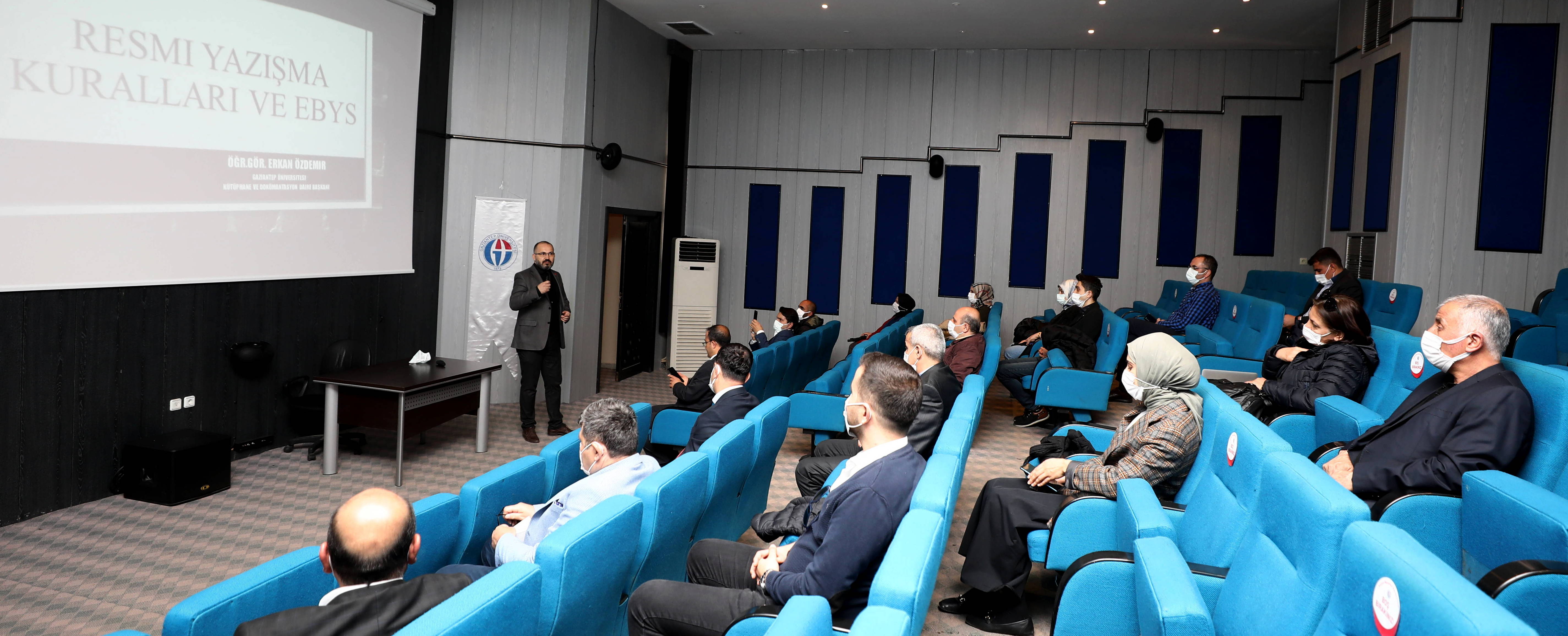 GAÜN Cep Sineması’nda 2 oturum şeklinde düzenlenen seminerde, Kütüphane ve Dokümantasyon Daire Başkanı Öğretim Görevlisi Erkan Özdemir tarafından katılımcılara, “Resmi Yazışma Kurallarında Gerçekleşen Değişiklikler ve Değişikliklerin Elektronik Ortama Yansıması ve Meslek Etiği” eğitimi verildi.
