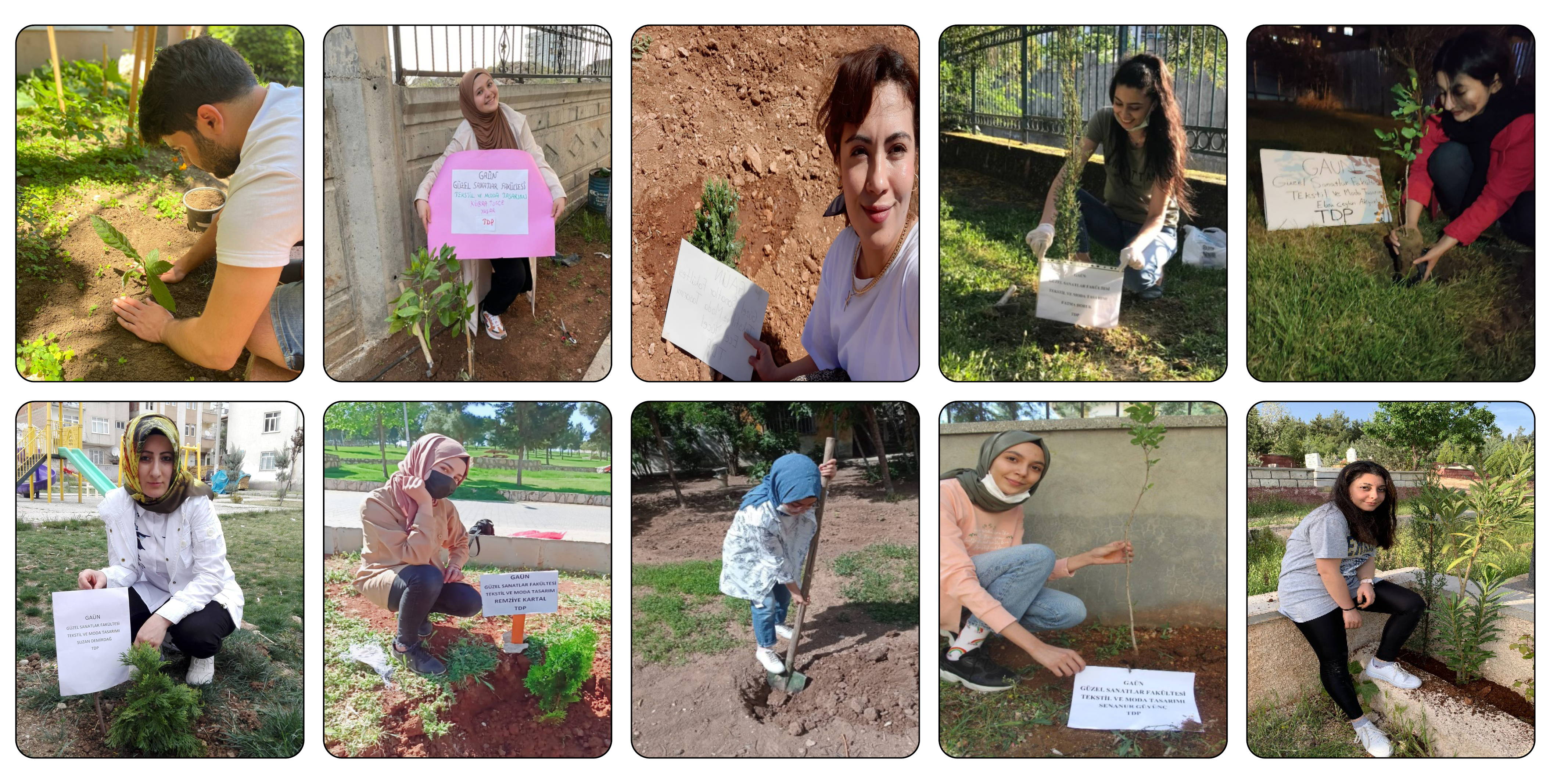 Pandemi şartları nedeniyle öğrencilerin bulunduğu şehirlerde gerçekleştirilen; GAÜN Öğretim Üyesi, Proje Yürütücüsü Doç. Dr. Nazan Avcıoğlu Kalebek ve 61 öğrencinin katıldığı etkinlik ile Türkiye’nin farklı şehirlerinde park, bahçe, tarla ve mezarlık gibi farklı mekânlarda 100 adet fidan dikildi.