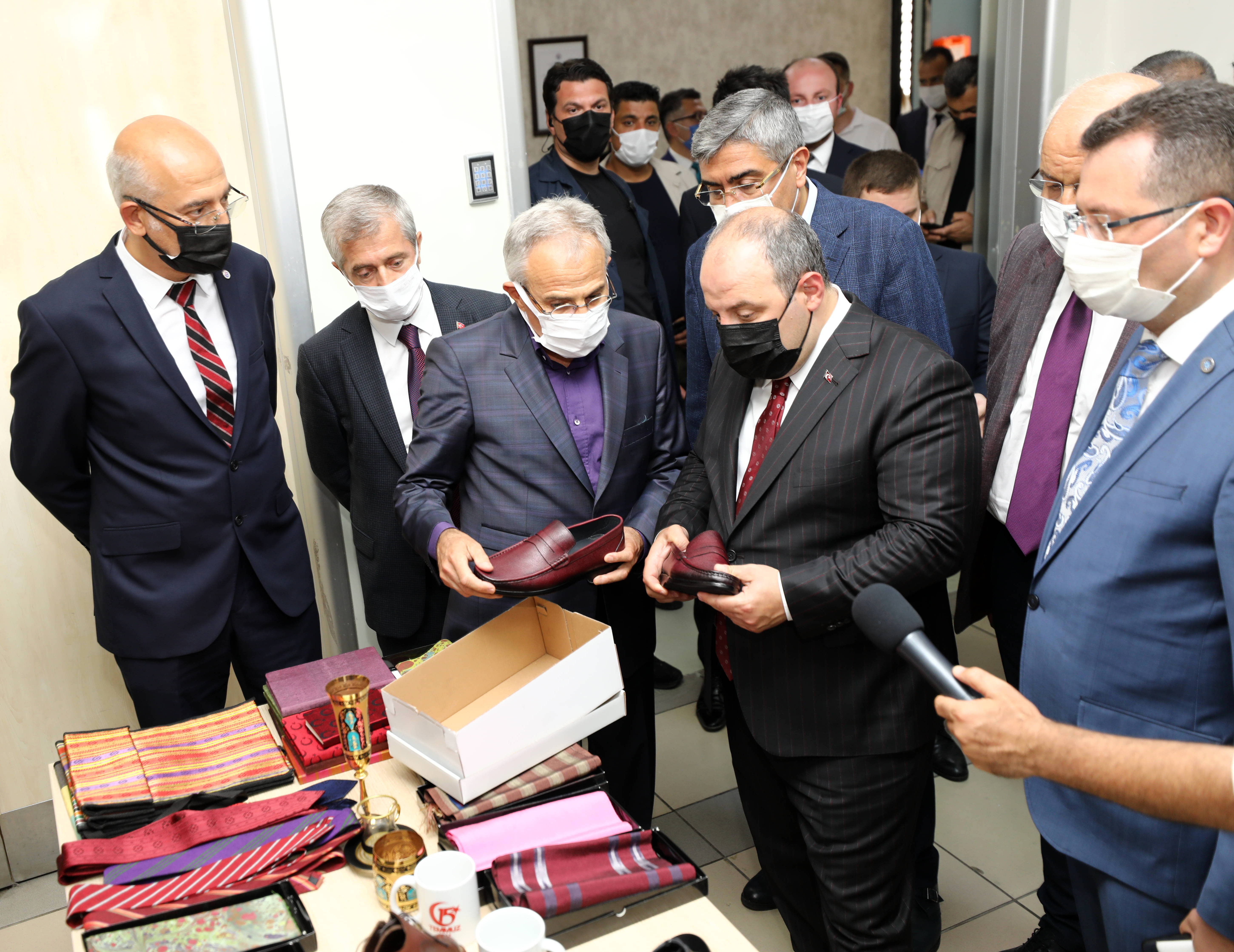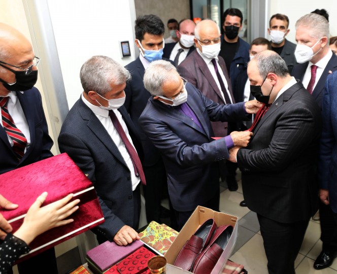 Ayakkabı Test ve Akreditasyon Merkezi incelemeleri sonrası GAÜN Rektörü Prof. Dr. Arif Özaydın, Sanayi ve Teknoloji Bakanı Mustafa Varank’a, GAÜN Naci Topçuoğlu MYO tarafından üretilen ayakkabı ve Selçuklu motifleriyle hazırlanmış Tabaklı Platin Takımını hediye etti.