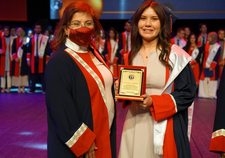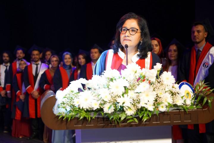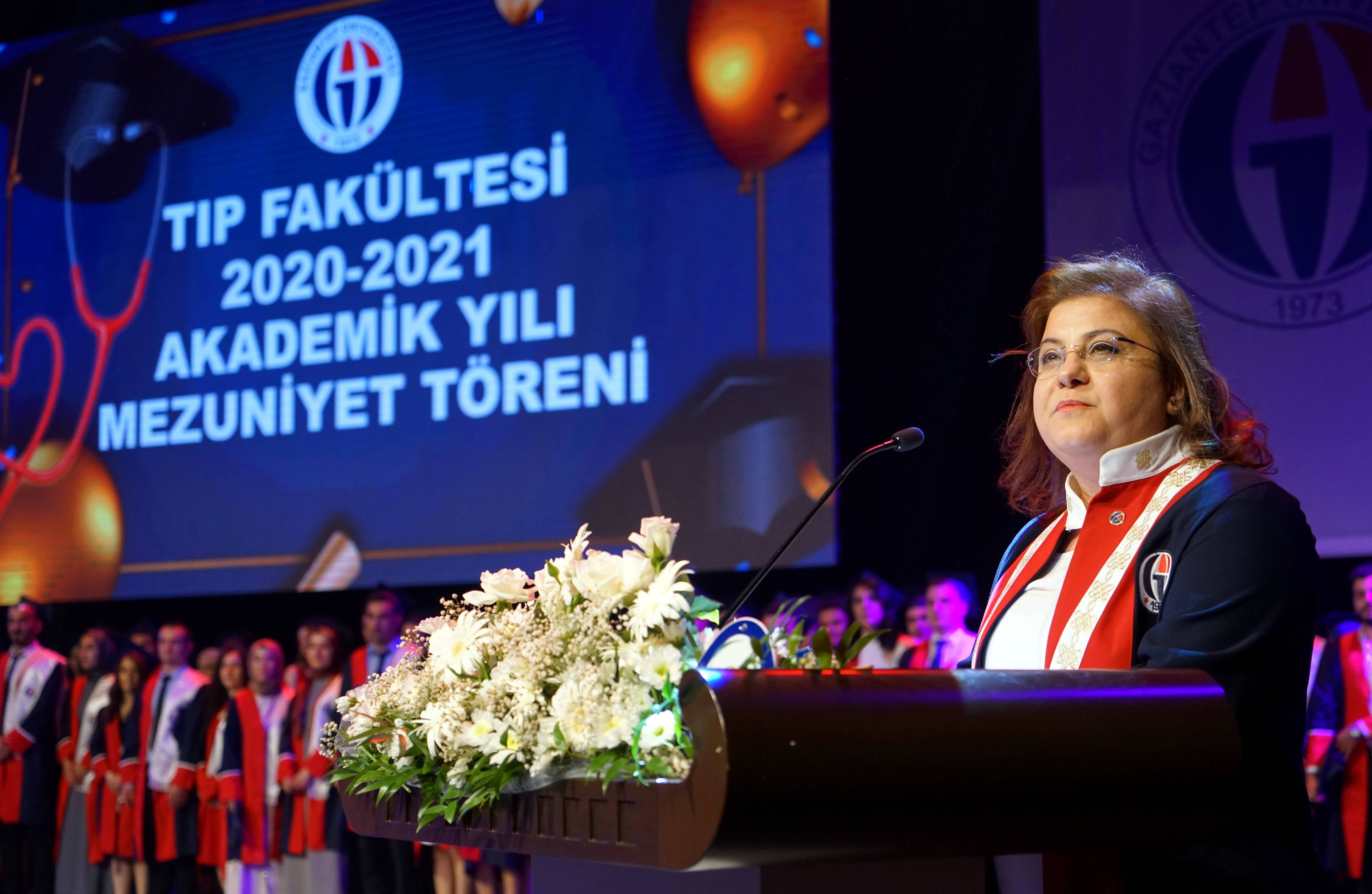 Mezun öğrenciler adına bir konuşan Fakülte birincisi Dr. Yeter Yavuzatmaca da GAÜN Tıp Fakültesinden mezun olmanın gururunu yaşadığını belirterek, konuşmasının devamında şunları söyledi: “Fakültemizin 2021 mezunu genç, dinamik, çalışkan ve hepsi birbirinden değerli hekim arkadaşlarımı temsilen bu konuşmayı yapmaktan onur duyuyorum. Bize her türlü imkânı sağlayan, bugün bu noktaya gelmemizde en çok payı üstlenen ailelerimize ve her zaman olduğu gibi bugün de bizi yalnız bırakmayan eğitim hayatımız boyunca en büyük rolleri üstlenen kıymetli hocalarımıza minnettarız. Heyecanlıyım çünkü bugün bizzat Mustafa Kemal Atatürk tarafından üzerimize yüklenen büyük bir sorumluluğun altına giriyoruz. ‘Beni Türk hekimlerine emanet ediniz’ derken artık o kast edilen hekimlerin bir parçasıyız.”