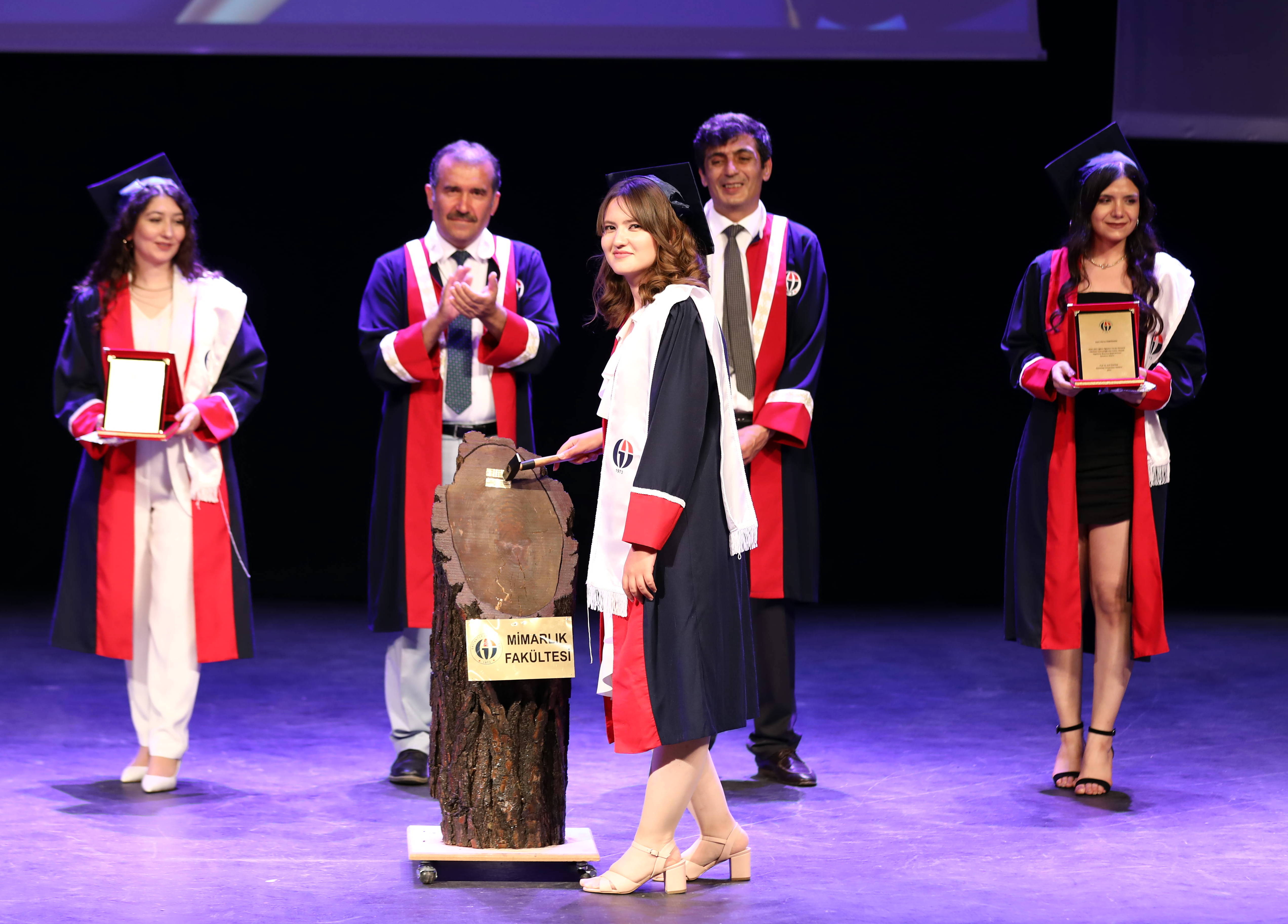Prof. Dr. Özakça, öğrencilere seslendiği konuşmasında öğrencilere bilgi, beceri ve yetkinlik noktasında daima en iyi eğitimi vermenin azmi ve gayreti içerisinde olduklarını ifade ederek, “Sizleri zaman zaman yorduk, sıkıştırdık, zorladık; gayemiz kedine güvenen bilgi-beceri ve ahlaki değerlerle donatılmış yetkin birer mimar olmanızdı. Şimdi ise, alın teri ve göz nuruyla hak ettiğiniz mezuniyet belgelerinizi birazdan gururla alacaksınız. Bugün, bir bitişin değil birçok başlangıcın yaşandığı gündür. Bugünden itibaren hayat mücadelesi başlıyor. Fakültemizin temsilcileri olarak başarı öyküleri yazmaya başlayacaksınız. Sizden sonraki mezunlara kucak açacak, önderlik yapacak, hep birlikte geleceğin liderleri, geleceğin Türkiye’si olacaksınız” diye konuştu.