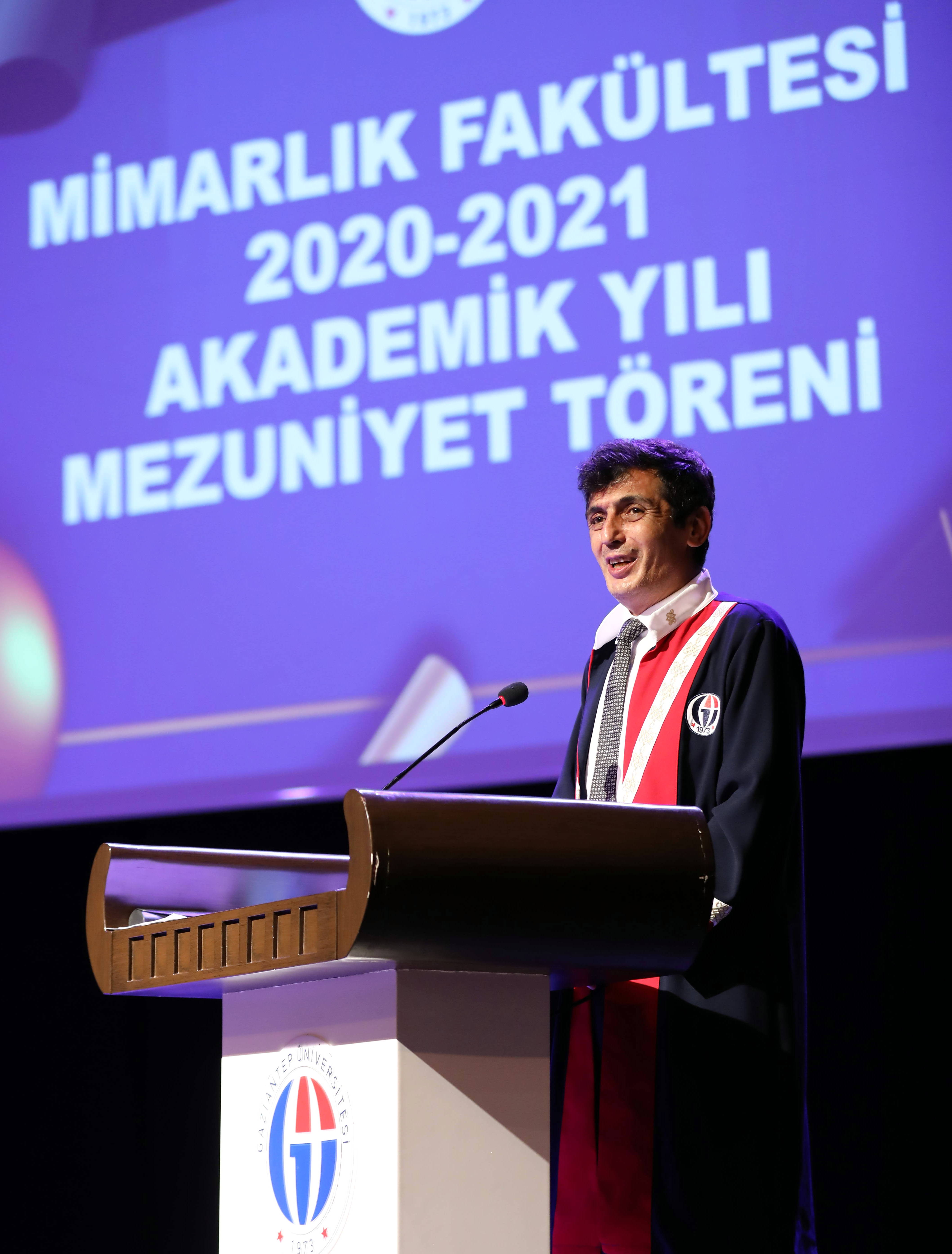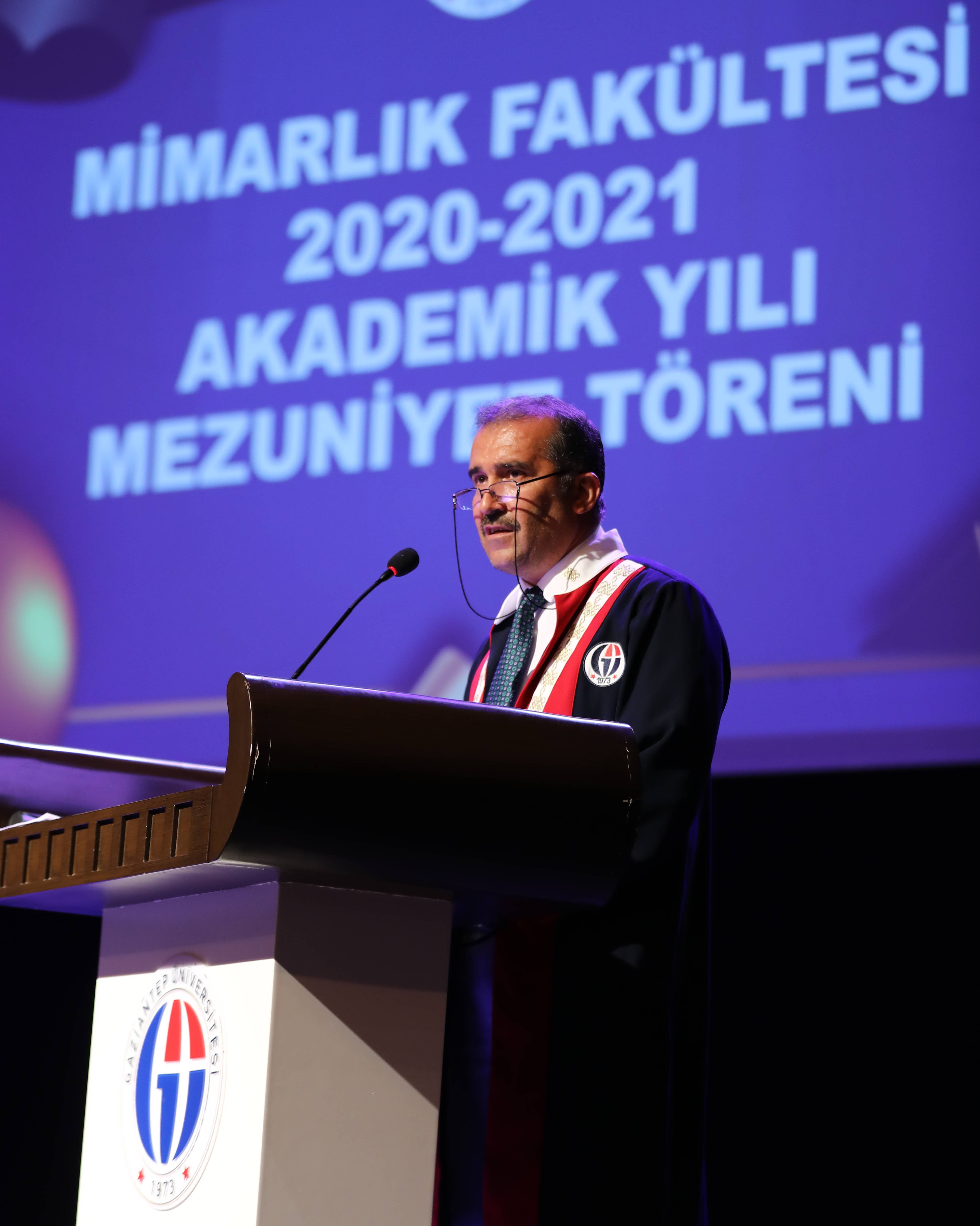 Prof. Dr. Recep Yumrutaş, “Bizim üniversitede varlık sebebimiz siz değerli öğrencilerimiz içindi. Sizlerin varlığı ile bizim varlığımız anlam kazanıyor. Sizlerin yokluğu bizleri üzdü ve mahsunlaştırdı. Şükürler olsun ki, şu sıralar salgın aşının da etkisi ile azalmaya başladı ve yasaklar kalktı. Bu münasebetle siz gençlerimizi, mimarlarımızı onurlandırmak, hak ettikleri diplomalarını vermek, diploma töreninde güzel anılar edinmenizi sağlamak üzere dar kapsamlı bir mezuniyet töreni hazırladık. Umarım hem sizler, hem aileleriniz hem de biz hocalar olarak memnun kalacağımız bir mezuniyet töreni yaparız” dedi.
