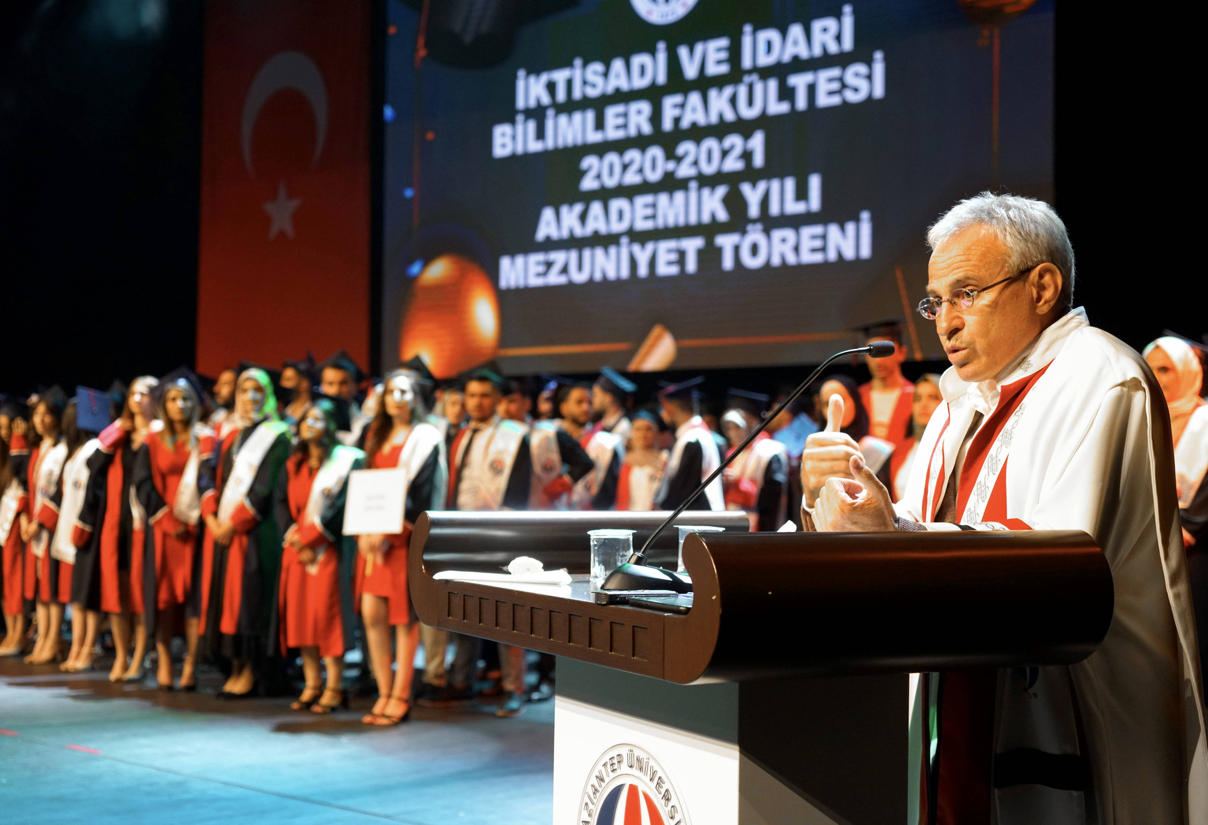 İktisadi ve İdari Bilimler Fakültesinde 61 akademisyenin eğitim verdiğini belirten Fakülte Dekanı Prof. Dr. Yakup Bulut, yeni bölüm ve akademisyenlerle daha da etkin hale gelmeyi hedeflediklerini ifade ettiği konuşmasında, öğrencilere tavsiyelerde bulunarak şunları söyledi: “Mezun olup giderken hocanız olarak şunu ifade etmek isterim ki, hepinizi çok seviyoruz. Belirlediğiniz ve amaçladığınız hedeflere ulaşacağınızı düşünüyoruz. Sizler bu bilinç ve iradeyi gösterecek güçtesiniz. Önünüze belki bir sürü engel çıkabilir. Ancak sizler bu engelleri aşabileceksiniz. Umutsuzluk asla elinizi tutmasın. Ancak başarı merdivenlerinin de eli cebinde çıkılamayacağını bilmeniz gerekiyor. Ahlak, adalet, istikamet içinde olmalısınız. Bunlar sadece birey olarak bizlerin değil toplumun da bizden beklediği temel değerleridir. Unutmayalım ki, toplumlar yoksulluktan değil ama ahlaksızlıktan çökebiliyor. Sizlere tavsiyem her zaman müspet hareket etmeyi temel prensip olarak kabul etmelisiniz. Anlamlı ve anlaşılır olmalısınız. Çünkü birbirleriyle çatışanlar hiçbir zaman birbirlerini anlayamazlar ve kazanamazlar. Kazanmak için çalışmak ve birbirine katkı sağlamak gerekiyor. Buradan aldığınız eğitimle her yerde birçok toplumun hastalığı olan cehalet, fakirlik ve gereksiz ihtilaflar sorununa çözüm getirmenizi diliyorum.”
