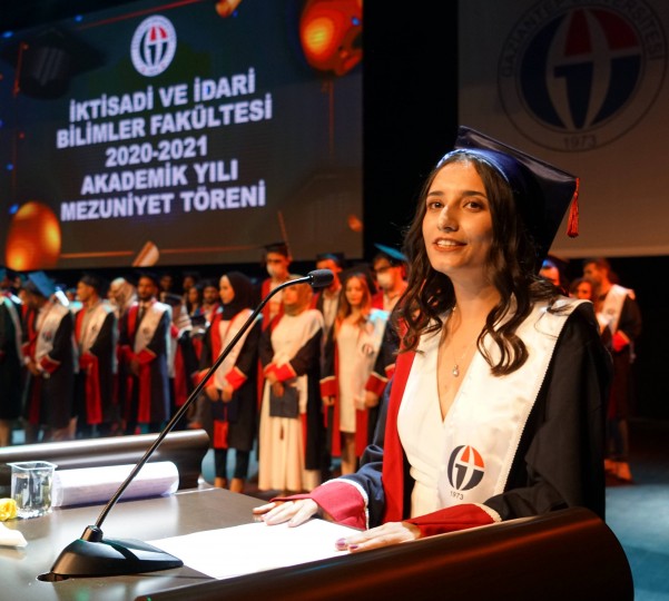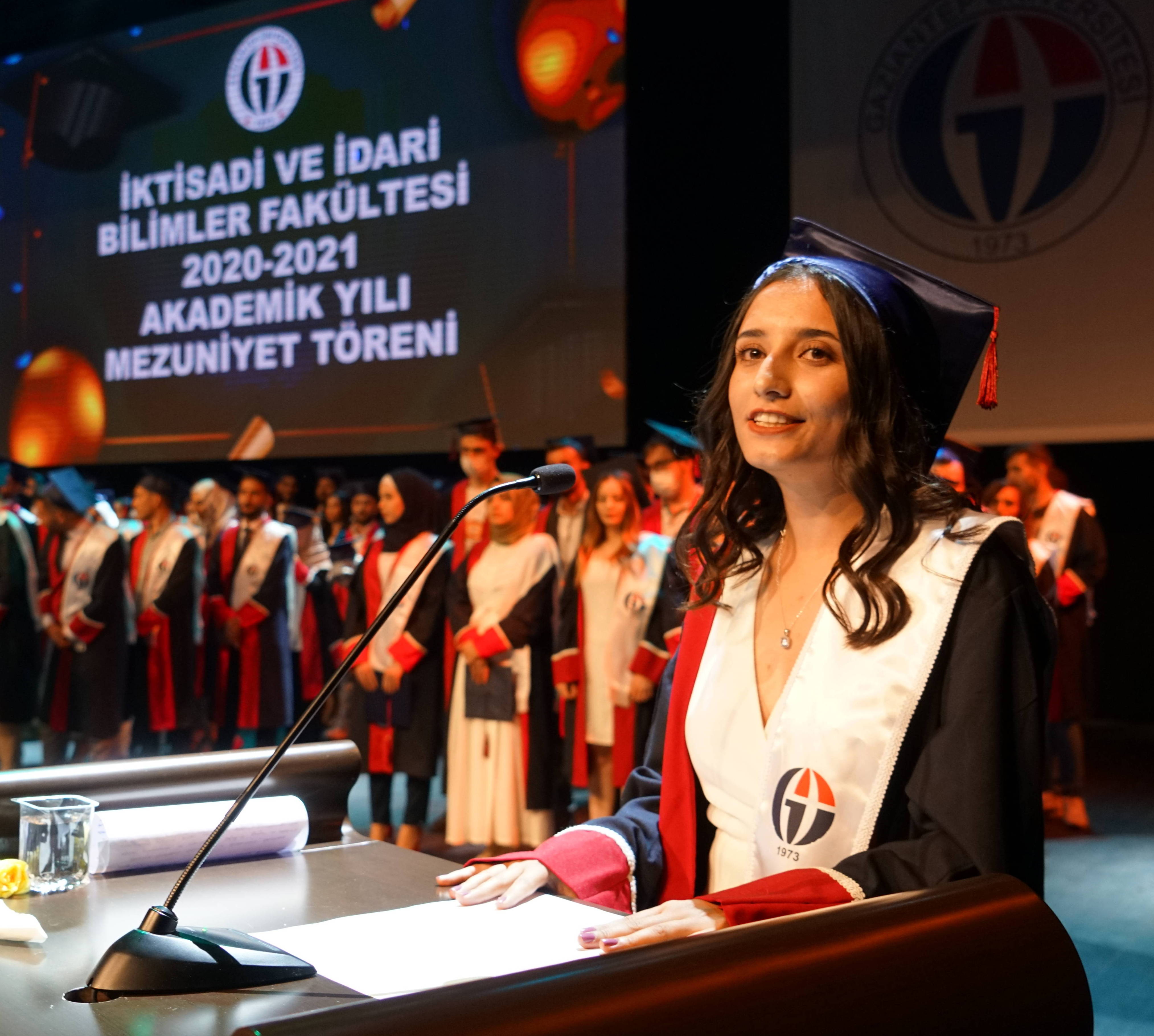 Mezunlar adına konuşan İktisat Bölümü öğrencisi Kader Kavak ise pandemi sürecinde kısıtlı ve zor şartlara rağmen mezuniyet töreni yaparak öğrencilerini unutmayan üniversite yönetimine teşekkür ederek Gaziantep Üniversitesini ve fakültelerini unutmayacaklarını vurguladı. Kader Kavak, “Günümüzün değişen ve gelişen şartları dikkate alındığında iktisadın, maliyenin, hukukun, işletmenin, muhasebenin vazgeçilmez birer unsur olduğunu ve yaşamımızın her yönünü etkilediğini görmekteyiz. Bu açıdan İİBF mezunları olarak kendimi ve tüm mezun arkadaşlarımı şanslı olarak gördüğümü belirtmek isterim. Ülkemize ve milletimize faydalı birer birey olmayı hedefliyoruz.” şeklinde konuştu.