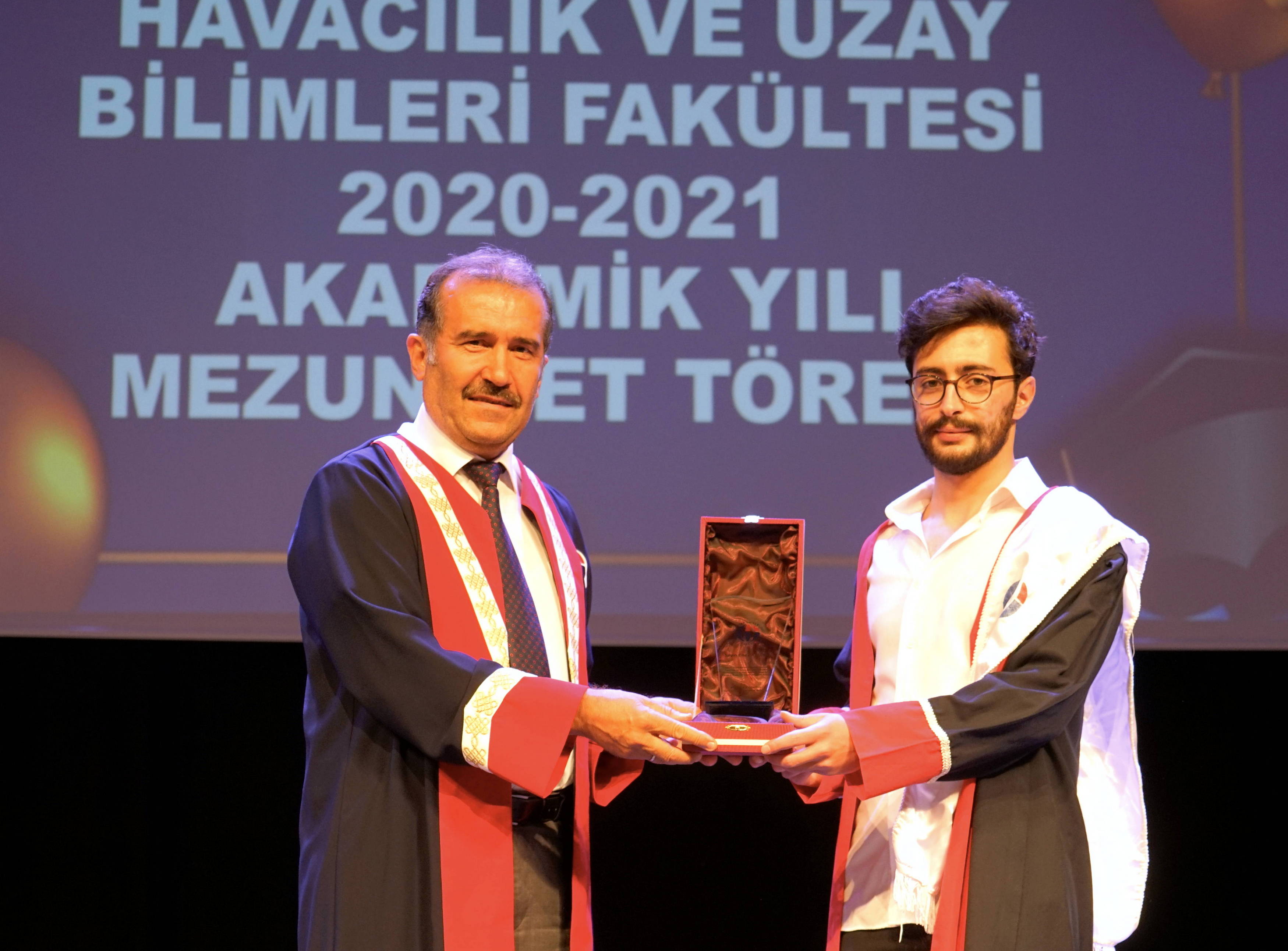 GAÜN Atatürk Kültür Sahnesi’nde gerçekleştirilen törende; Havacılık ve Uzay Bilimleri Fakültesi Birincisi Enes Arslan’a GAÜN Rektör Yardımcısı ve Havacılık ve Uzay Bilimleri Fakültesi Dekanı Prof. Dr. Recep Yumrutaş, İkinci Burak Güllü’ye Dekan Yardımcısı Doç. Dr. Eyüp Yeter ve Üçüncü Muhammed Salman Aktaş’a Bölüm Başkanı Doç. Dr. İbrahim Göv tarafından plaket ve hediye takdim edildi.