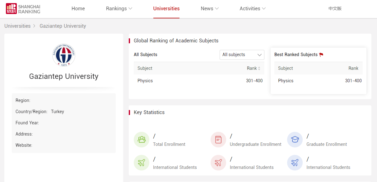 Dünya üniversiteleri akademik sıralamasının resmi yayıncısı olan ShanghaiRanking, 2021 Dünya Üniversiteleri Akademik Sıralaması (ARWU) – 2021 sonuçlarını açıkladı. Toplamda 2 binden fazla üniversitenin değerlendirildiği ve sadece en iyi bin sonucun yayınlandığı listede Gaziantep Üniversitesi (GAÜN), Fizik Mühendisliği Bölümü alanında dünyada ilk 301-400 bandına girmeyi başardı.
