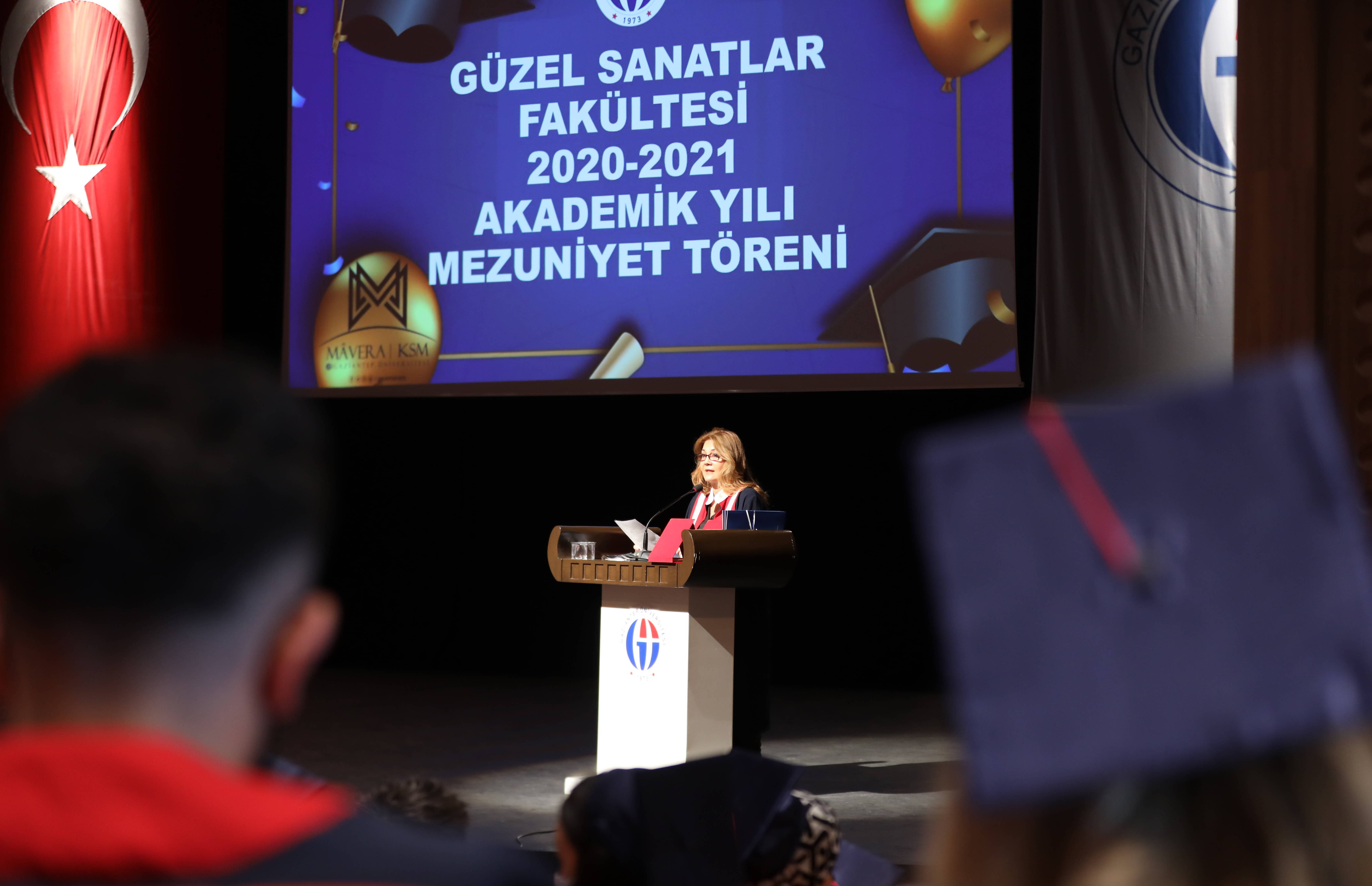 GAÜN Mavera Kongre ve Sanat Merkezinde gerçekleştirilen törenin açılışında konuşan Güzel Sanatlar Fakültesi Dekanı Prof. Dr. Selma Köksal, pandeminin yarattığı olumsuz etkilerinden bahsederek etkilerinin üzün süre daha devam edeceğini belirtti. Mezun öğrencilere seslenen Prof. Dr. Selma Köksal, “Sağlık, ekonomi, sosyal hayat, yeni yaşam biçimleri gibi alanlarda gençlerimizi farklı bir alan bekliyor. İnsan sağlığını ve verimlilik psikolojisini derinden etkileyen, pek çok sakıntıya ve acıya neden olan, ekonomileri derinden sarsan ve değiştiren bu süreçte öğrencilerimiz hem etkilerine maruz kaldı hem de büyük ölçüde yüz yüze eğitimden mahrum kaldılar. Tüm bu zorlukların karşısında akademisyenlerimizin üstün çabaları ve desteği, velilerimizin fedakârlıkları, öğrencilerimizin gayretleriyle eğitim süreçleri başarıyla tamamlandı. Genç arkadaşlarımıza meslek ve sanat hayatlarında başarılar ve esenlikler dilerim” şeklinde konuştu.