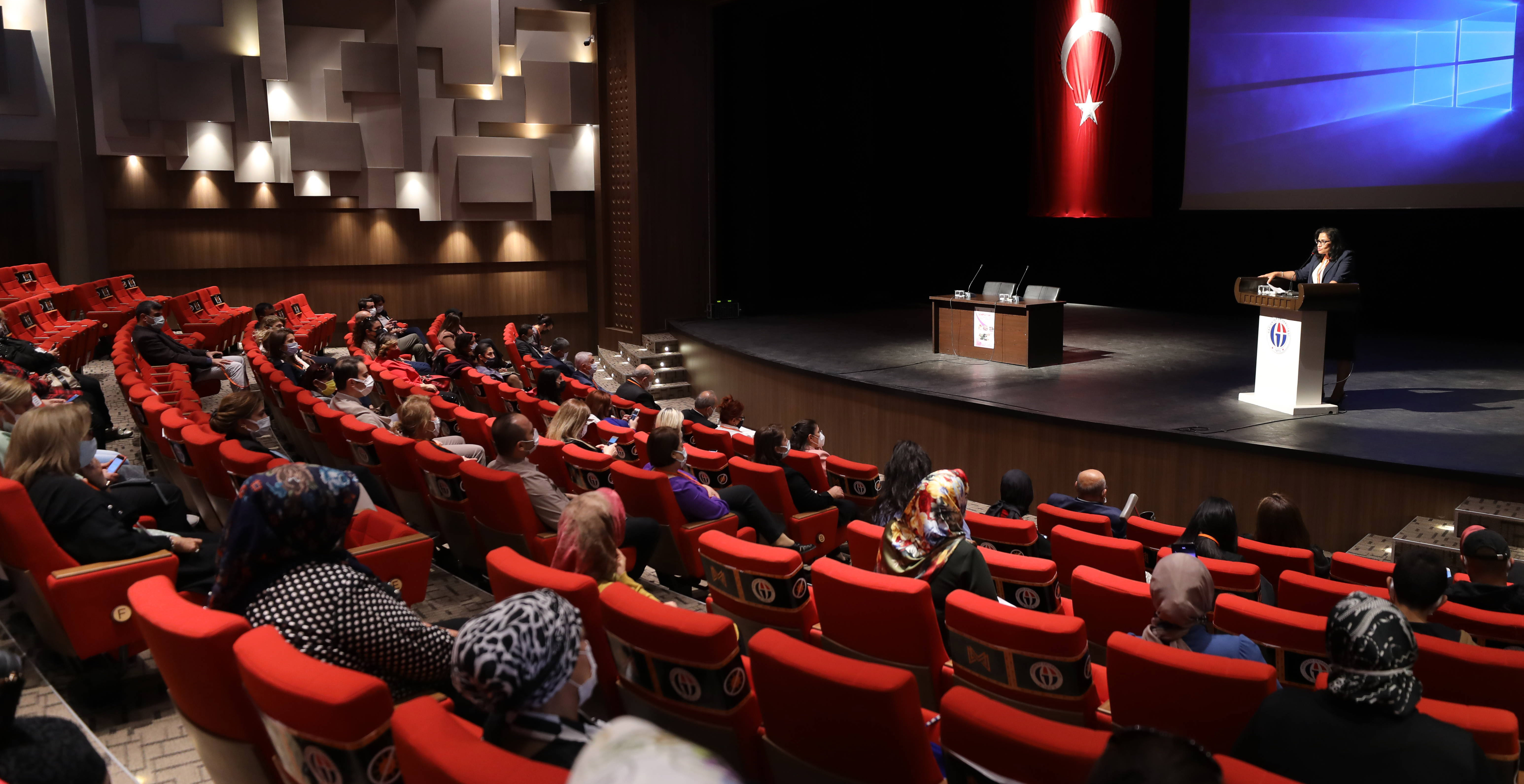 GAÜN Rektör Yardımcısı Prof. Dr. Ayşe Balat, sempozyumdaki konuşmaları sonrası Cumhurbaşkanlığı Sosyal Politikalar Kurulu Üyesi Prof. Dr. Edibe Sözen’e hediye takdim etti.