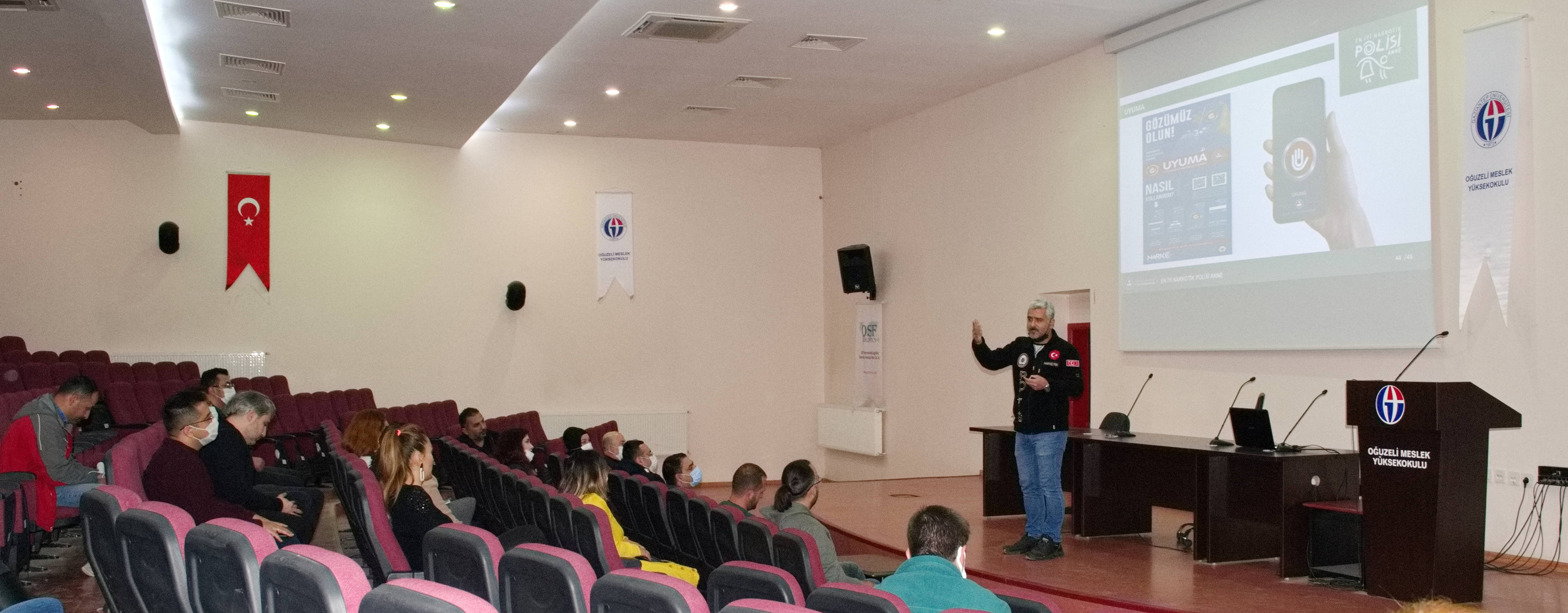 Meslek Yüksekokulu akademik ve idari personellerinin yoğun ilgi gösterdiği konferansa; İl Emniyet Müdürlüğü Narkotik Büro Amirliği ve Oğuzeli İlçe Emniyet Müdürlüğünde görevli polis memurları eşlik etti. Konferansa davetli olarak katılan narkotik büro görevlileri, uyuşturucu maddenin insana verdiği zararlar hakkında bilgi verildi. Özellikle ailelerin dikkatli olması gerektiği, madde bağımlılığının hangi yaş gruplarında ve hangi potansiyel gençler üzerinde başladığı, ailelerin kendi çocuklarını, çevrelerindeki gençleri ve geleceğimizi şekillendirecek yeni neslimiz olan gençleri nasıl korumamız gerektiği, bir madde bağımlısı şüphelisi kişiyi belli etmeden nasıl tespit edebileceği konularında bilgi verildi. Katılımcı görevliler iş hayatlarında yaşadıkları deneyimleri personellerle paylaşarak tecrübelerini aktardıktan sonra etkinliğin soru cevap kısmında yüksekokul personellerinin soruları yanıtlandı.