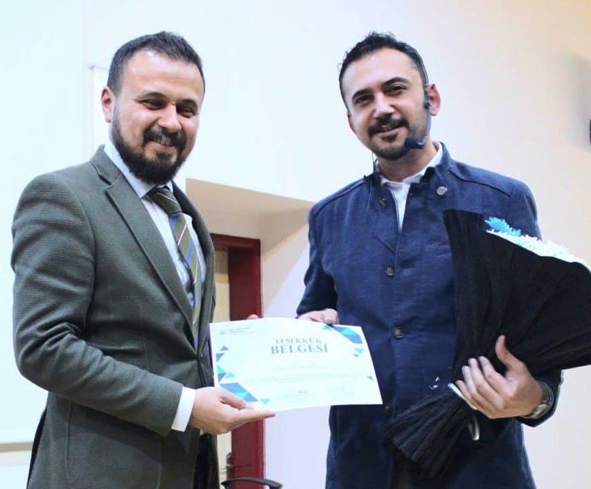 Etkinliğin sonunda GAÜN İletişim Fakültesi Dekan Yardımcısı Dr. Öğretim Üyesi Süleyman Şahan tarafından günün anısına Eğitmen Yazar Murat Koçyiğit’e hediye takdim etti.