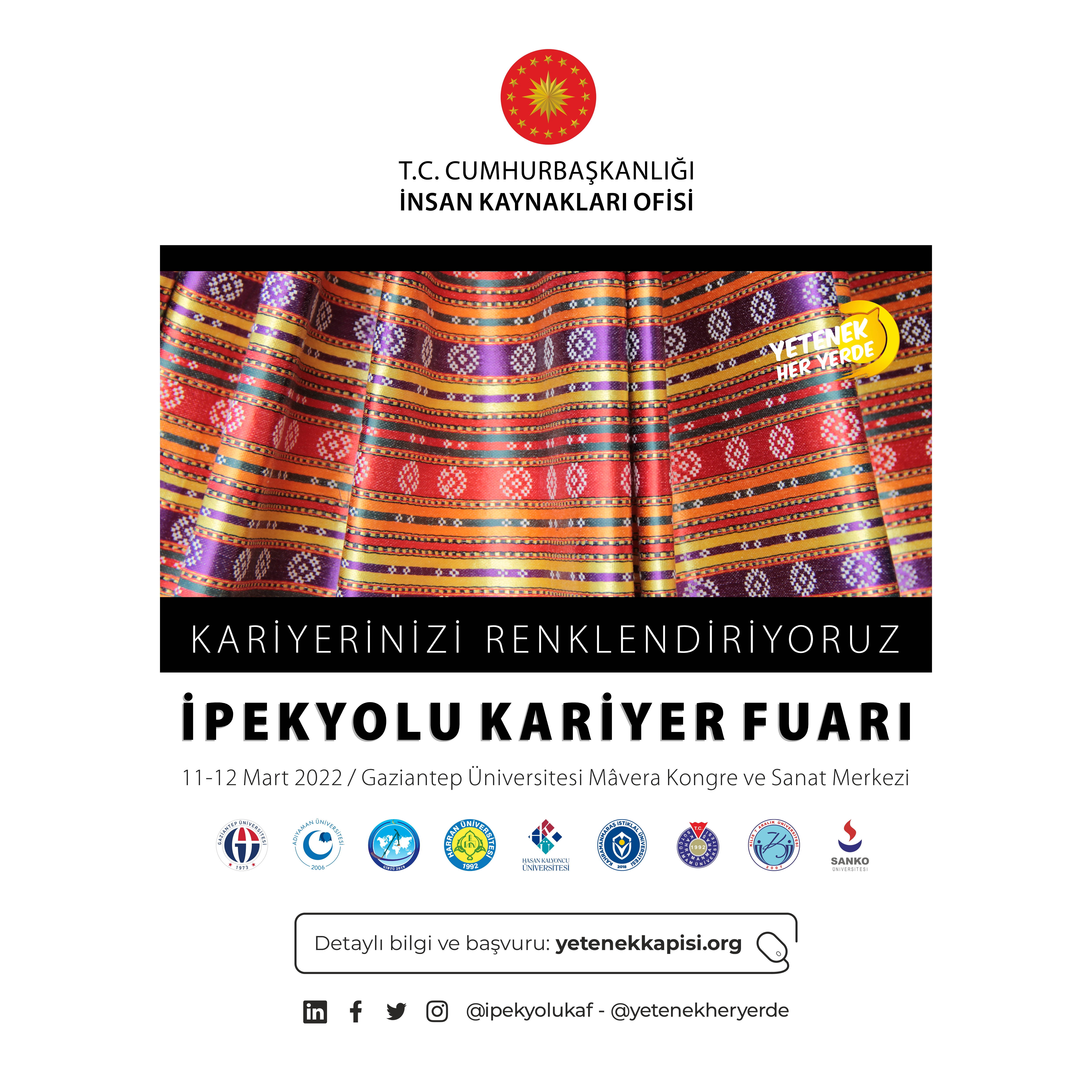Cumhurbaşkanlığı İnsan Kaynakları Ofisi koordinasyonunda düzenlenen İpekyolu Kariyer Fuarına Gaziantep Üniversitesi (GAÜN) ev sahipliği yapıyor. “Yetenek Her yerde” sloganıyla yola çıkılan Bölgesel Kariyer Fuarları ile Türkiye’nin önde gelen işverenleri, 11 – 12 Mart 2022 tarihlerinde 2 gün boyunca GAÜN Mavera Kongre ve Sanat Merkezinde gençlerle buluşacak.