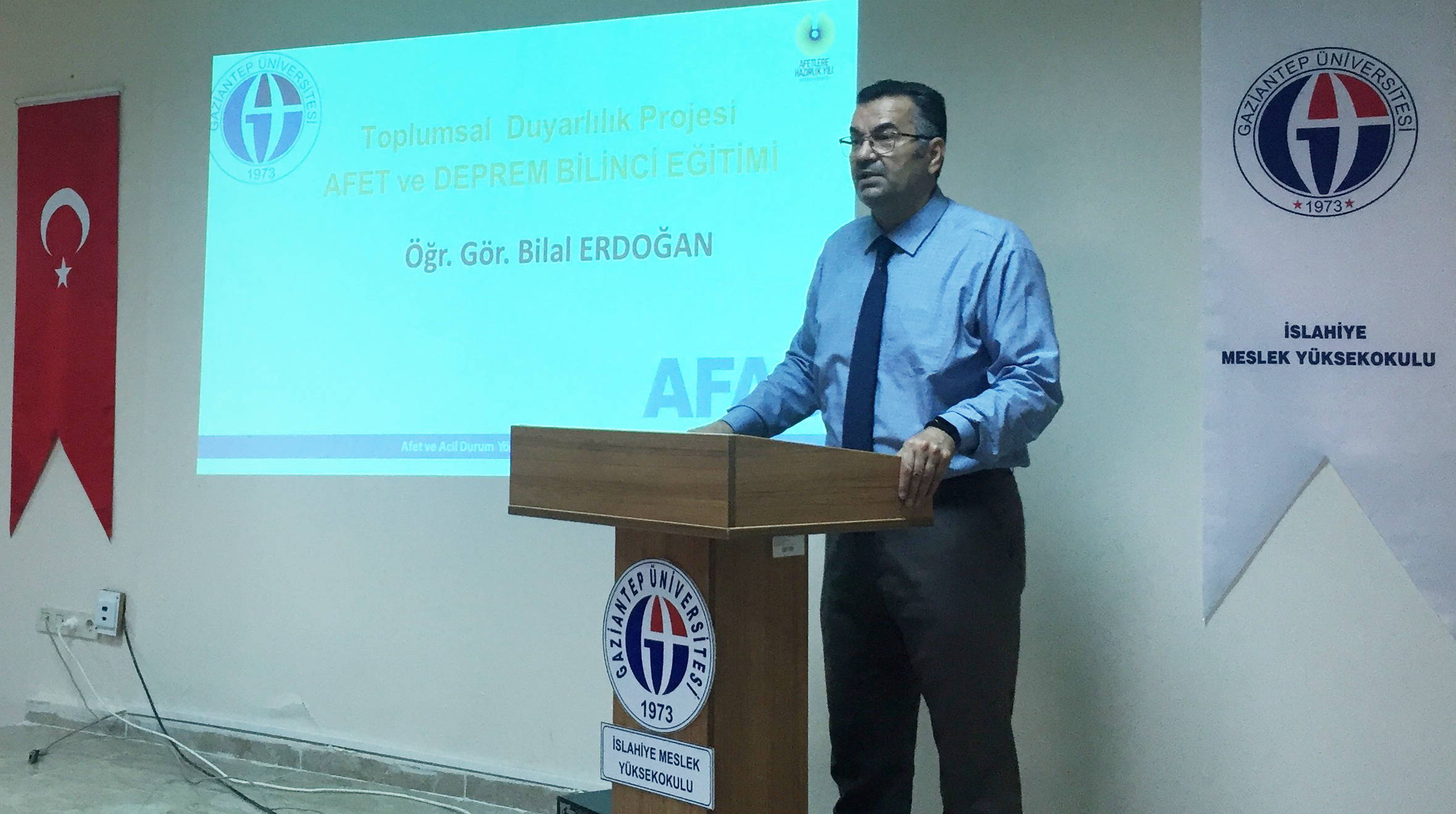 İslahiye Meslek Yüksekokulu Konferans Salonunda düzenlenen konferansa konuşmacı olarak katılan Öğr. Gör. Bilal Erdoğan afetler, afet bilinci ve depremden korunma yolları hakkında bilgi verdi.