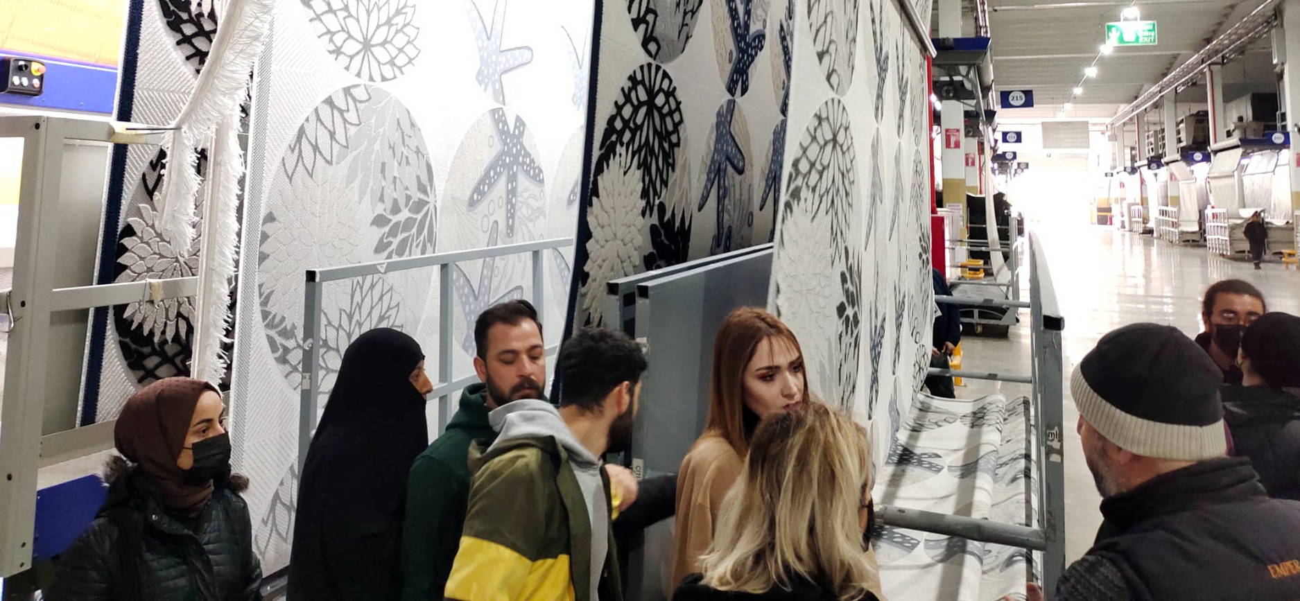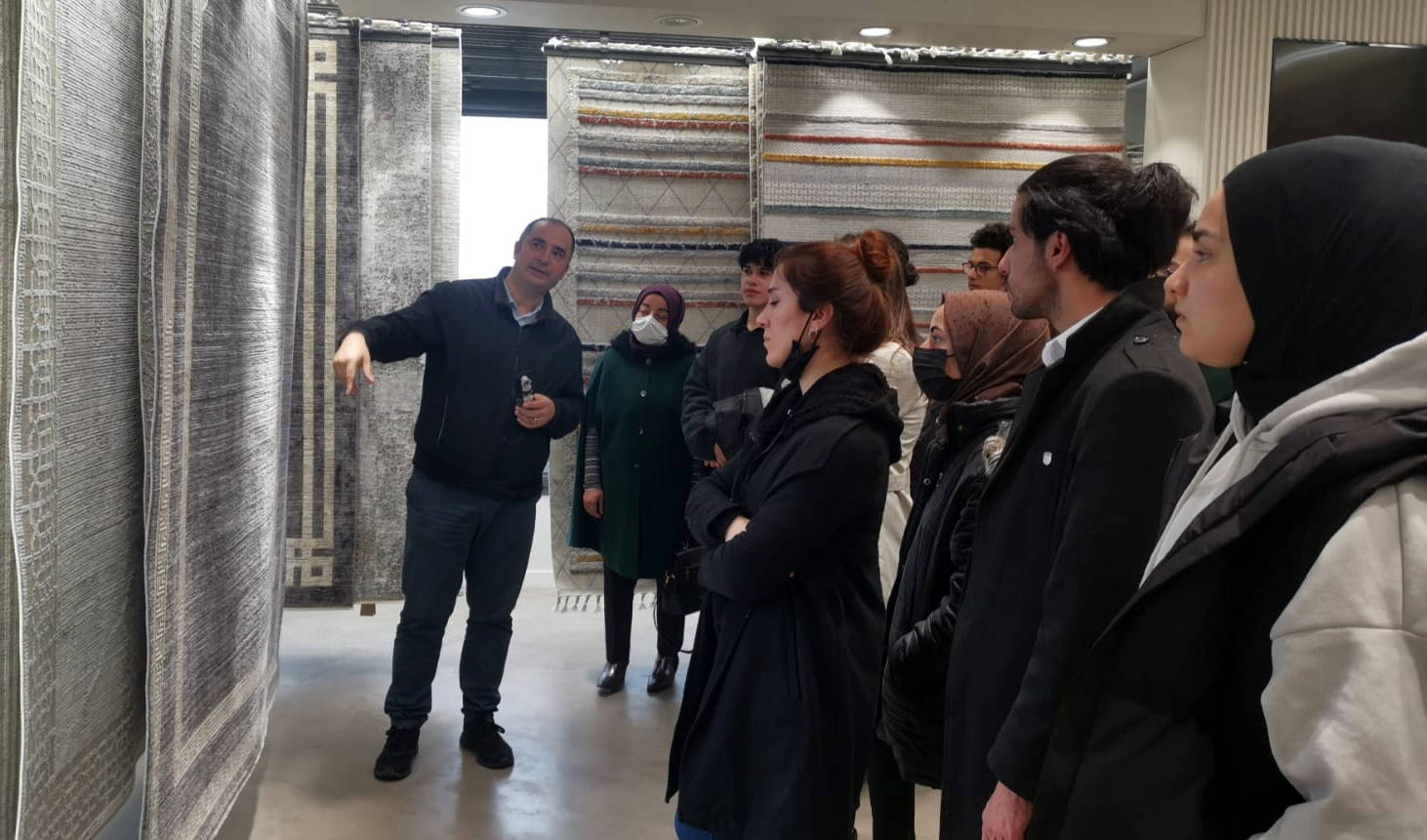 Halı üretim ve tasarım aşamalarının yerinde incelenerek öğrencilerin bilgi ve tecrübelerinin artırılması amacıyla düzenlenen geziye Halı Tasarımı Programı Bölüm Başkanı Doç. Dr. Nazan Avcıoğlu Kalebek ve Dr. Öğr. Üyesi Bünyamin Memik Üzümcü katıldı. Gezi kapsamında Empera Halı Firması Tasarım Direktörü Özgül Uşaklıgil ve Ar-Ge Müdürü Hacer Karakan, halı sektörünün iç ve dış piyasadaki payı, ihracat rakamları, halı tasarımı gerçekleştirilirken dikkat edilmesi gerekenler ve yeni trendler hakkında bilgi verdi.