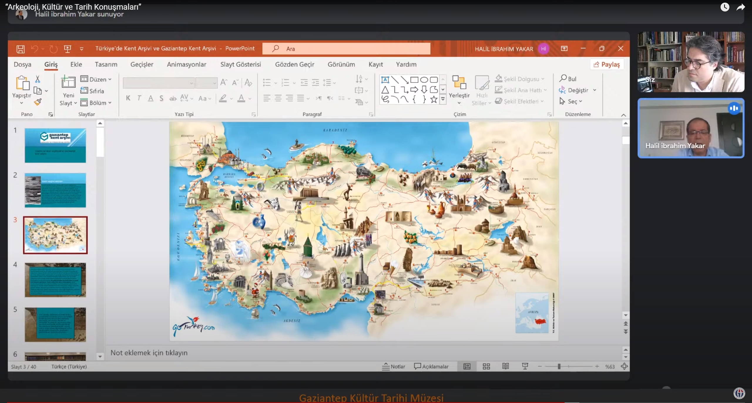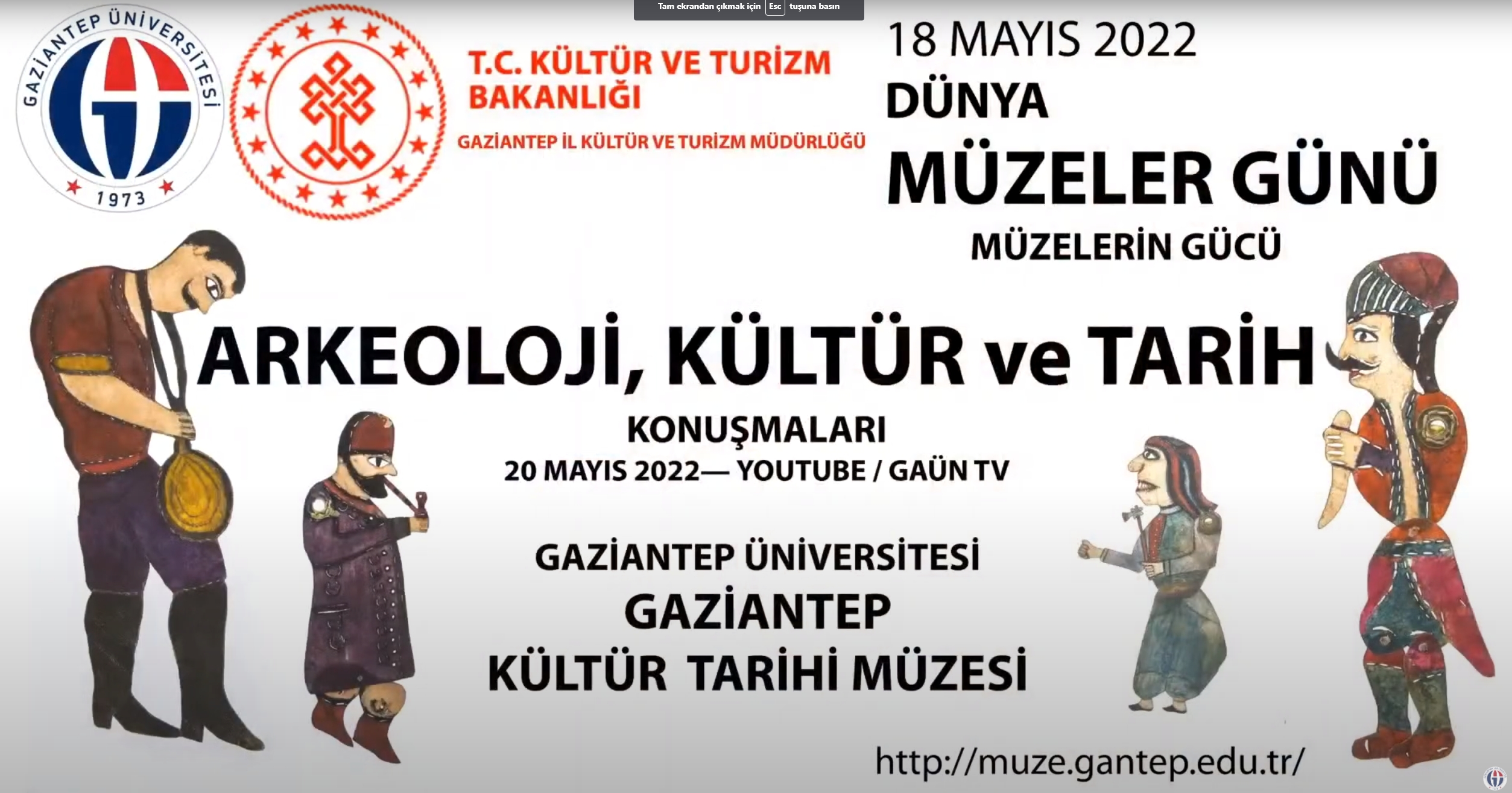 Gaziantep Üniversitesi (GAÜN) Gaziantep Kültür Tarihi Müzesi Koordinatörlüğünde “Arkeoloji, Kültür ve Tarih Konuşmaları” konusunda çeşitli sunumlar gerçekleştirildi. GAÜN Rektörlüğü ile Gaziantep İl Kültür ve Turizm Müdürlüğü ortaklığında gerçekleştirilen etkinlik, Youtube platformu üzerinde yer alan GAÜN TV’de canlı olarak yayımlandı.