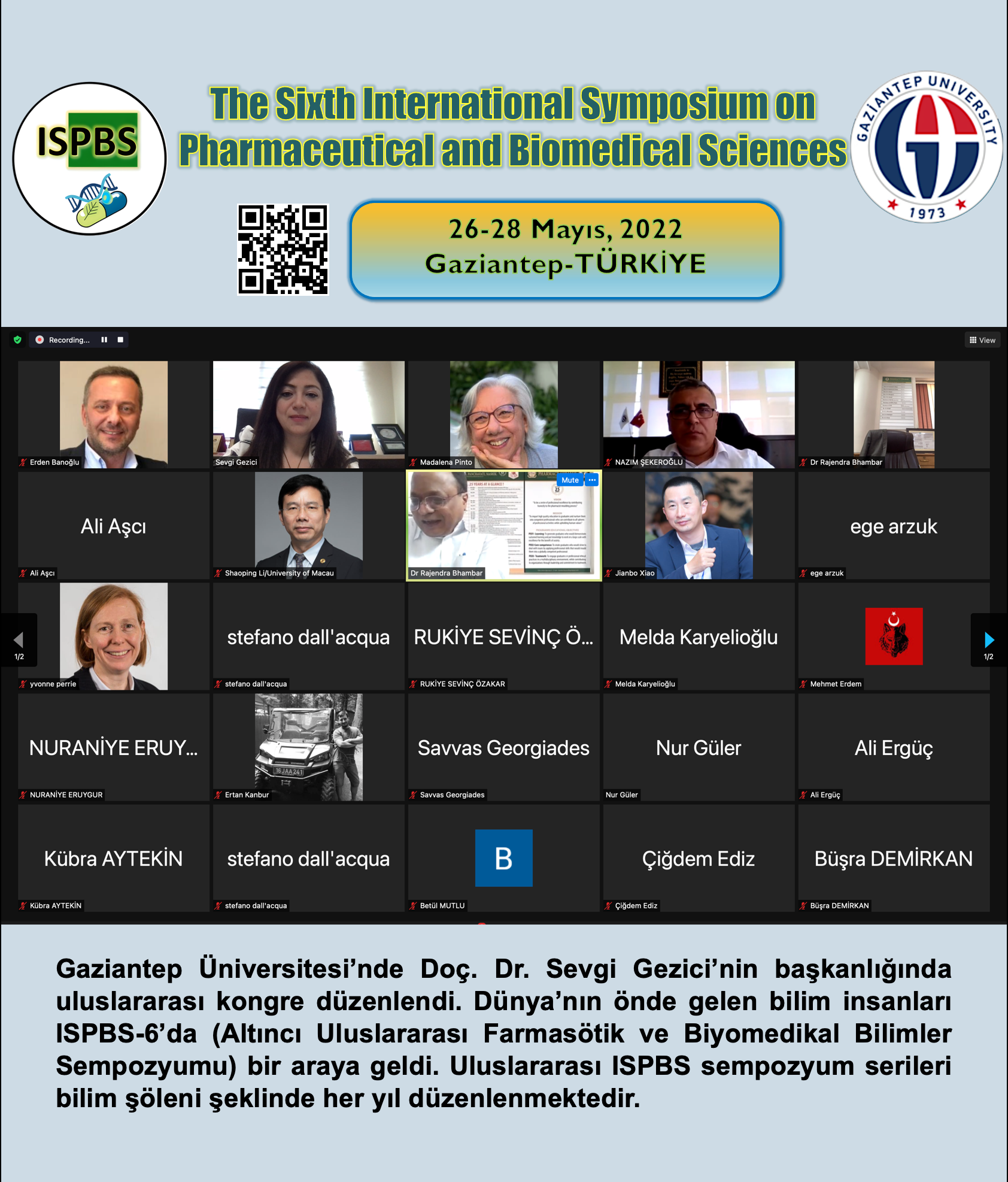 Gaziantep Üniversitesi (GAÜN) koordinatörlüğünde Uluslararası Farmasötik ve Biyomedikal Bilimler Sempozyumunun altıncısı “The Sixth International Symposium on Pharmaceutical and Biomedical Sciences (ISPBS-6)” online olarak gerçekleştirildi.