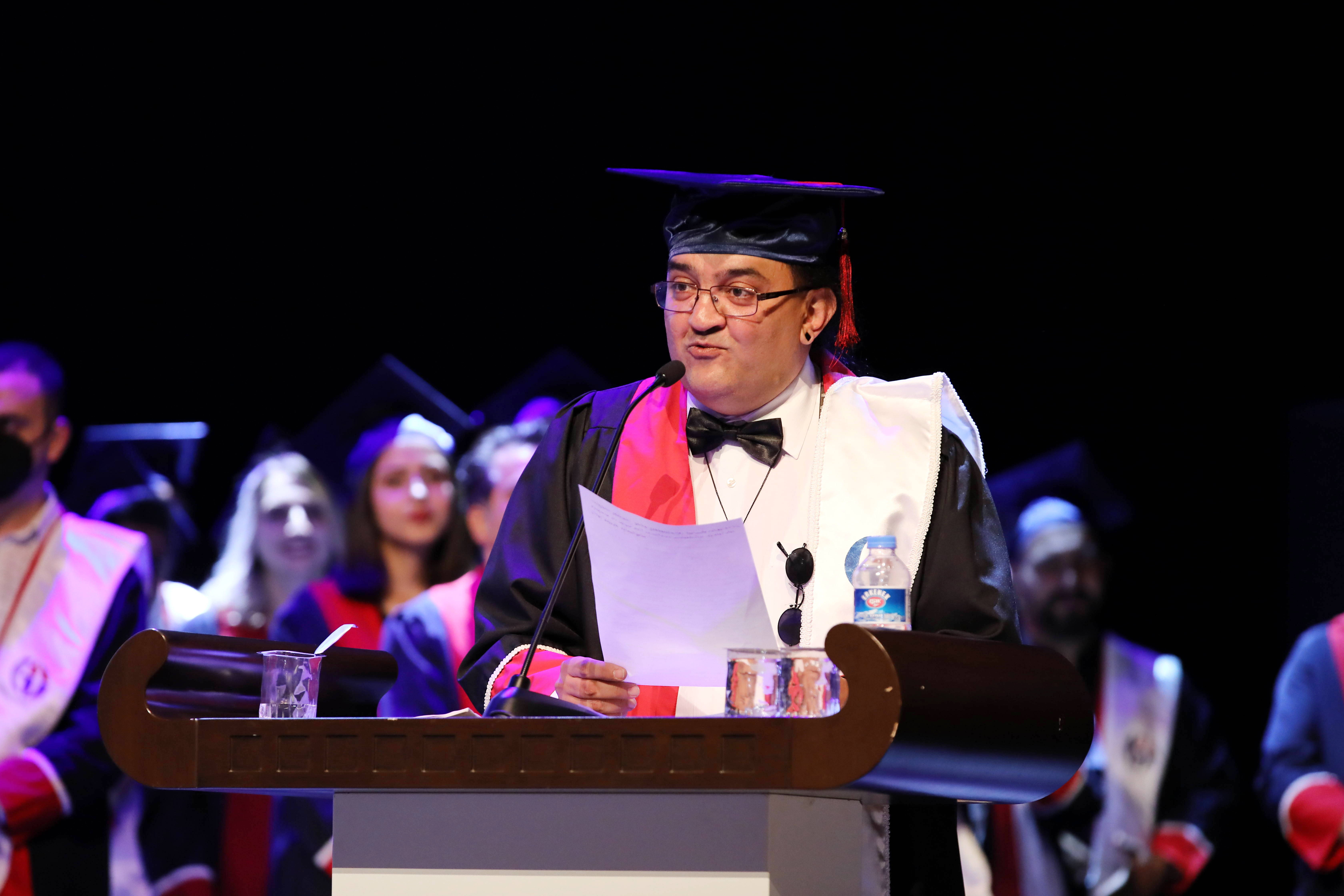 Fen Edebiyat Fakültesi öğrencileri adına konuşan Ali İslam, eğitim ve kariyer imkânlarından dolayı Gaziantep Üniversitesi mezunu olmasından dolayı gurur duyduğunu ifade etti. Ali İslam, “Öğrenimiz süresince bizleri geleceğe güvenle adım atacak bilimsel donanım kazandıran fakültemizin değerli hocalarına şahsım ve arkadaşlarım adına teşekkür ediyorum” dedi.