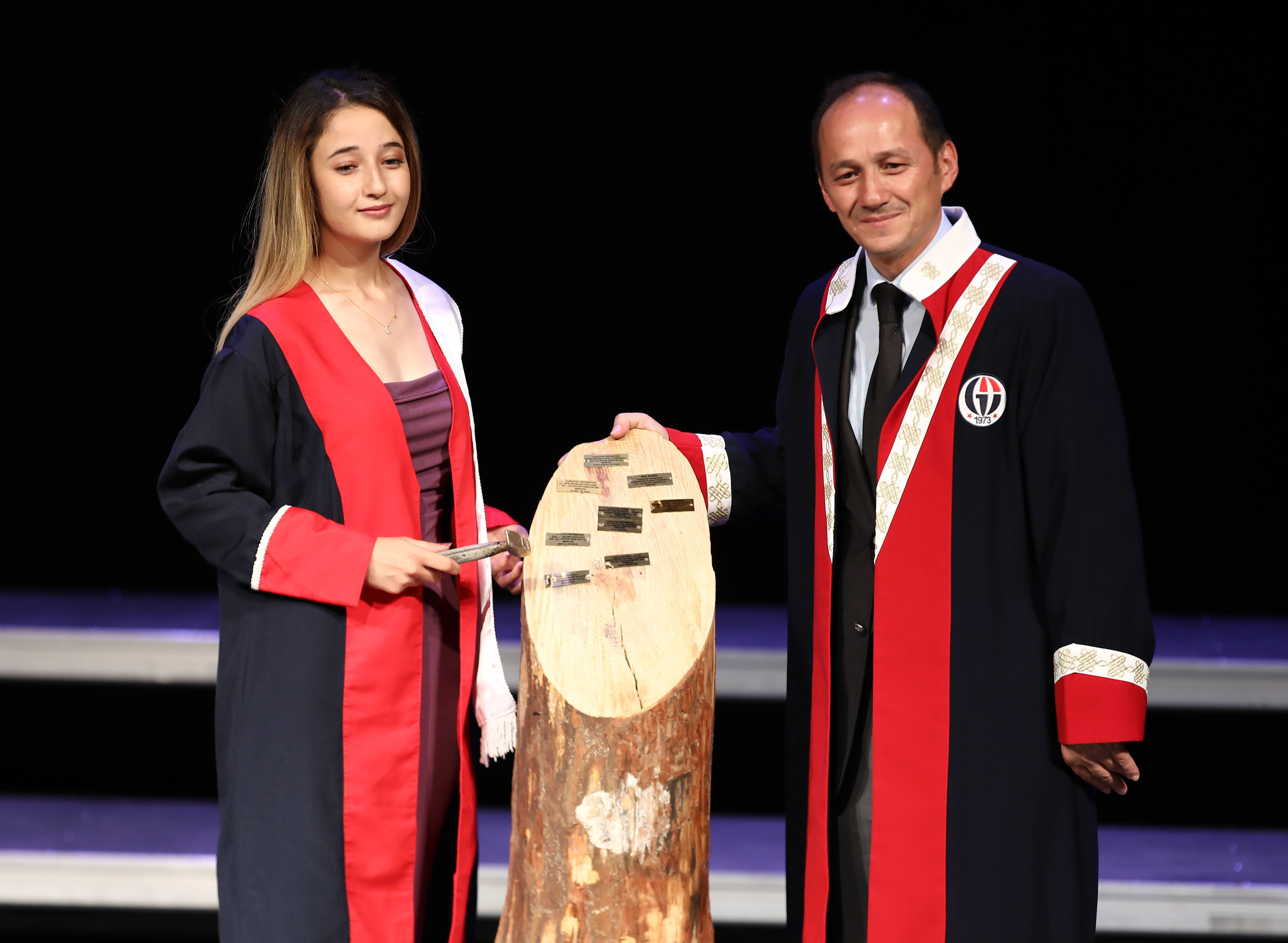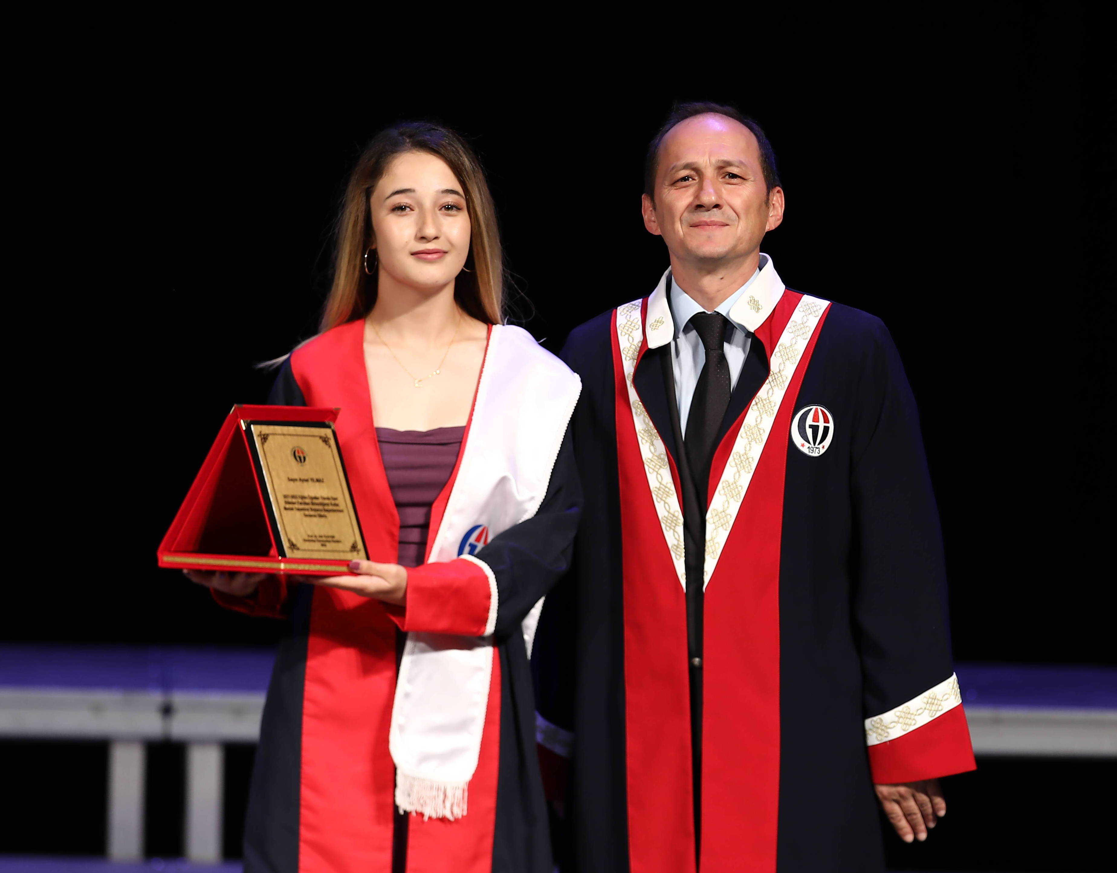 Fakülte Birincisi Aysel Yılmaz’ı temsilen Fakülte İkincisi Gizem Yılmazer’e Fakülte Dekanı Prof. Dr. Yavuz Saka tarafından plaketi takdim edilerek, yaş kütüğüne künyesini çaktırdı.