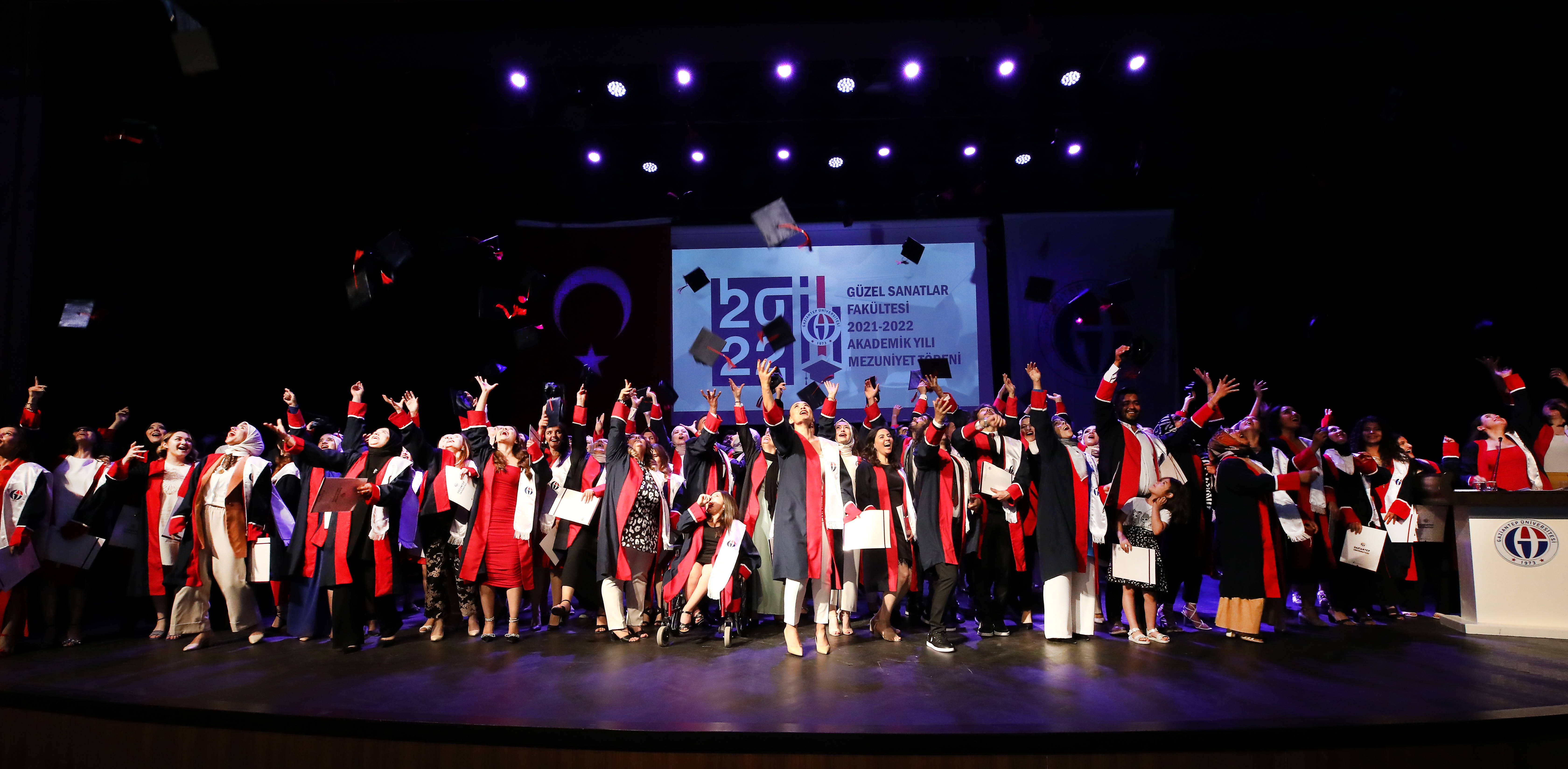 Gaziantep Üniversitesi (GAÜN) Güzel Sanatlar Fakültesi, 2021-2022 akademik yılı sonunda eğitimlerini başarıyla tamamlayan 96 öğrenci, mezuniyetlerini coşkulu bir törenle kutladı. Dört yıllık eğitimin ardından mezun olan öğrenciler, diplomalarını alarak meslek hayatına ilk adımlarını attı.