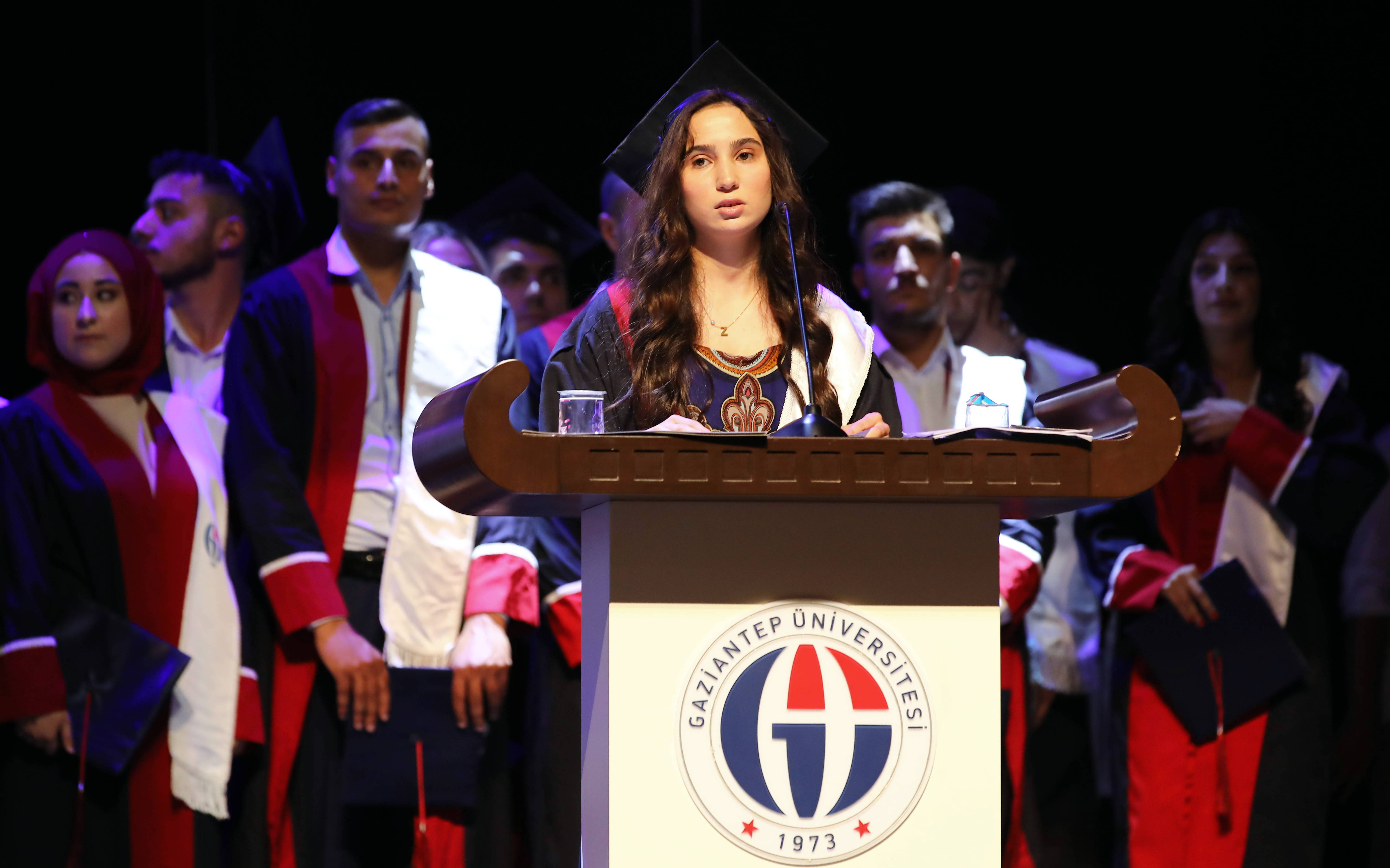 Mezunlar adına konuşan fakülte birincisi Zehra Yener ise “Üniversiteye başladığımızdan bu yana beklentilerimizin önemli ölçüde gerçekleştiğini düşünüyorum. Gaziantep Üniversitesi gibi sürekli yeniliğe kapı açan, kendini geliştiren, önemli ve nitelikli bir akademik kadroya sahip bir üniversiteden mezun olmaktan gurur duyuyorum. 4 Yıldan beri hayalini kurduğumuz bu mezuniyetin bizlere hayırlı olmasını diliyorum” ifadelerini kullandı.