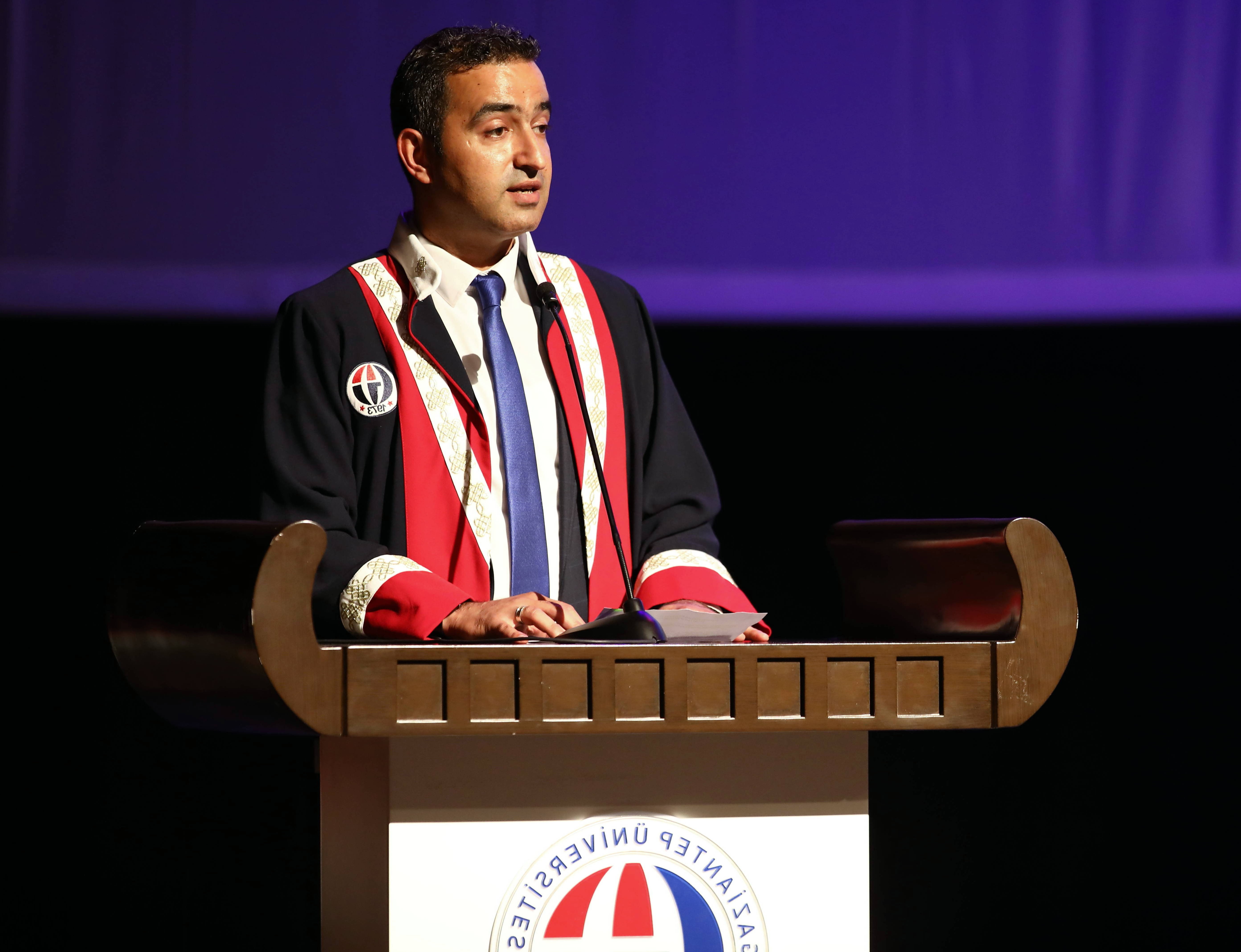 GAÜN Atatürk Kültür Sahnesinde gerçekleştirilen mezuniyet töreninin açılışında konuşan Havacılık ve Uzay Bilimleri Fakültesi Dekan V. Doç. Dr. Mehmet Hanifi Doğru, mezunlara seslenerek kendileri için yeni bir dönemin başladığını belirterek şunları söyledi: “Ülkemizin teknolojik olarak ilerlemesinde siz mühendislerimize çok önemli görev ve sorumluluklar düşüyor. Çalıştığınız birimlerde birçok problemlerle karşılaşacaksınız. Bu problemler ve güçlükler karşısında asla yılmayacağınıza ve aldığınız eğitimleri temel alarak bu sorunların üstesinden geleceğinize, ülkemizin ilerlemesi için yüreğinizi ortaya koyacağınıza gönülden inanıyorum.”
