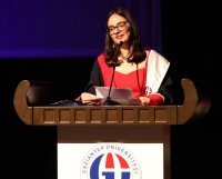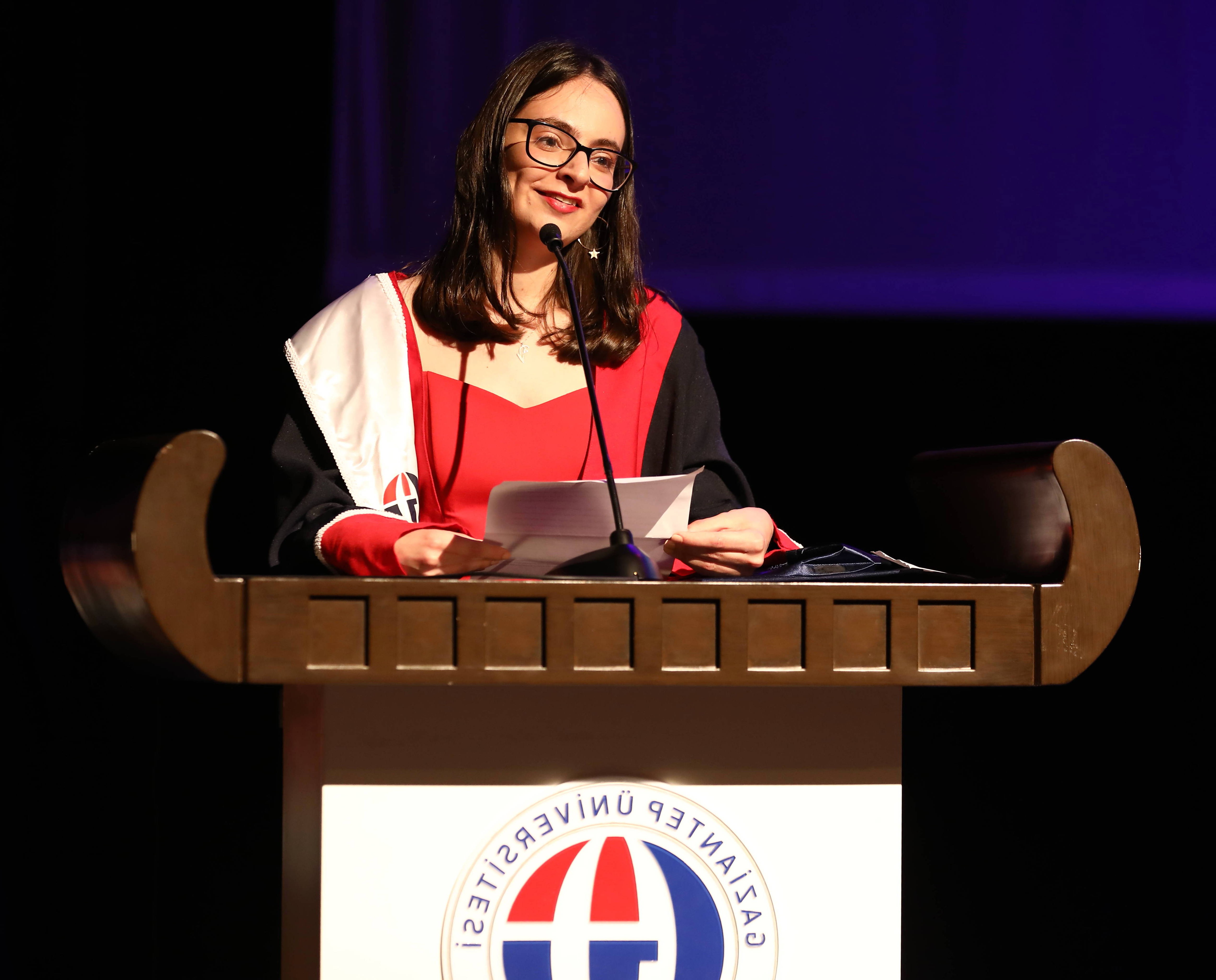 Mezunlar adına konuşan Fakülte Birincisi Kardelen Aygün ise fakülte birincisi olarak mezun olmanın haklı gururunu yaşadığını söyleyerek, “Hepimizin iyi bir gelecek için sürdürdüğü bu serüvende öğrendiği gibi kişi yaptığı işi en iyi ve en doğru şekilde ortaya koymalıdır. Bizler de aldığımız eğitimlerin ışığında yaptığımız işin en iyisini icra edeceğiz ve işin önemi ne olursa olsun o işi layığıyla yerine getireceğiz” dedi.