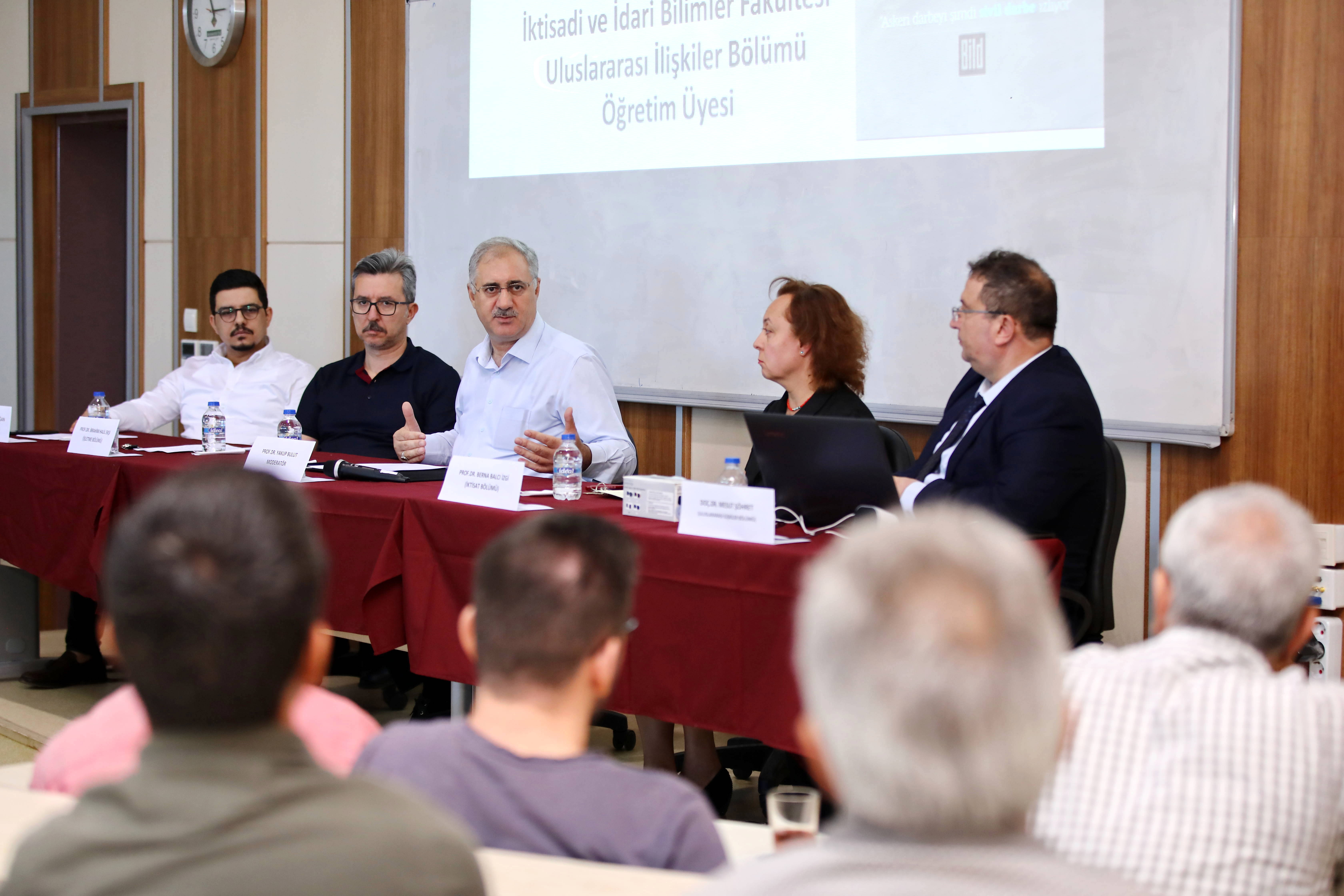 Panelin Moderatörü İktisadi ve İdari Bilimler Fakültesi Dekanı Prof. Dr. Yakup Bulut, 15 Temmuz Hain darbe girişiminin ekonomik ve siyasal yansımalarına değinerek, Türkiye darbeler sonucunda büyük acılar yaşadığını söyledi. Prof. Dr. Bulut sözlerine şöyle devam etti: “15 Temmuz FETÖ darbe girişiminin toplum tarafından püskürtülmesi önemli bir başarı olmakla beraber sosyal, kültürel ve siyasal boyutlarının hala toplumda yaşatmış oldukları travmalar görülüyor. Öz değerlerimiz olan cemaat, imam ve kardeşlik kavramlar belli bir grubun patentinde olan kavramlar değil, İslam’ın özünde var. İnsanlar bu kavramları kullanmaktan korkmaya başladı. Kötü niyetli olan bir takım komitelerde bu tür durumları fırsat bilerek hak yolunda vatanına hizmet etmek isteyen kesimleri de zan altında bırakıyor. Bütün bunlar toplumda travmalar yaşattı. Bu tür kalkışmaların veya darbelerin belli bir zaman diliminde yapıldı ve bitti diyemiyorsunuz. Darbelerin etkileri uzun süre devam edebilir.”
