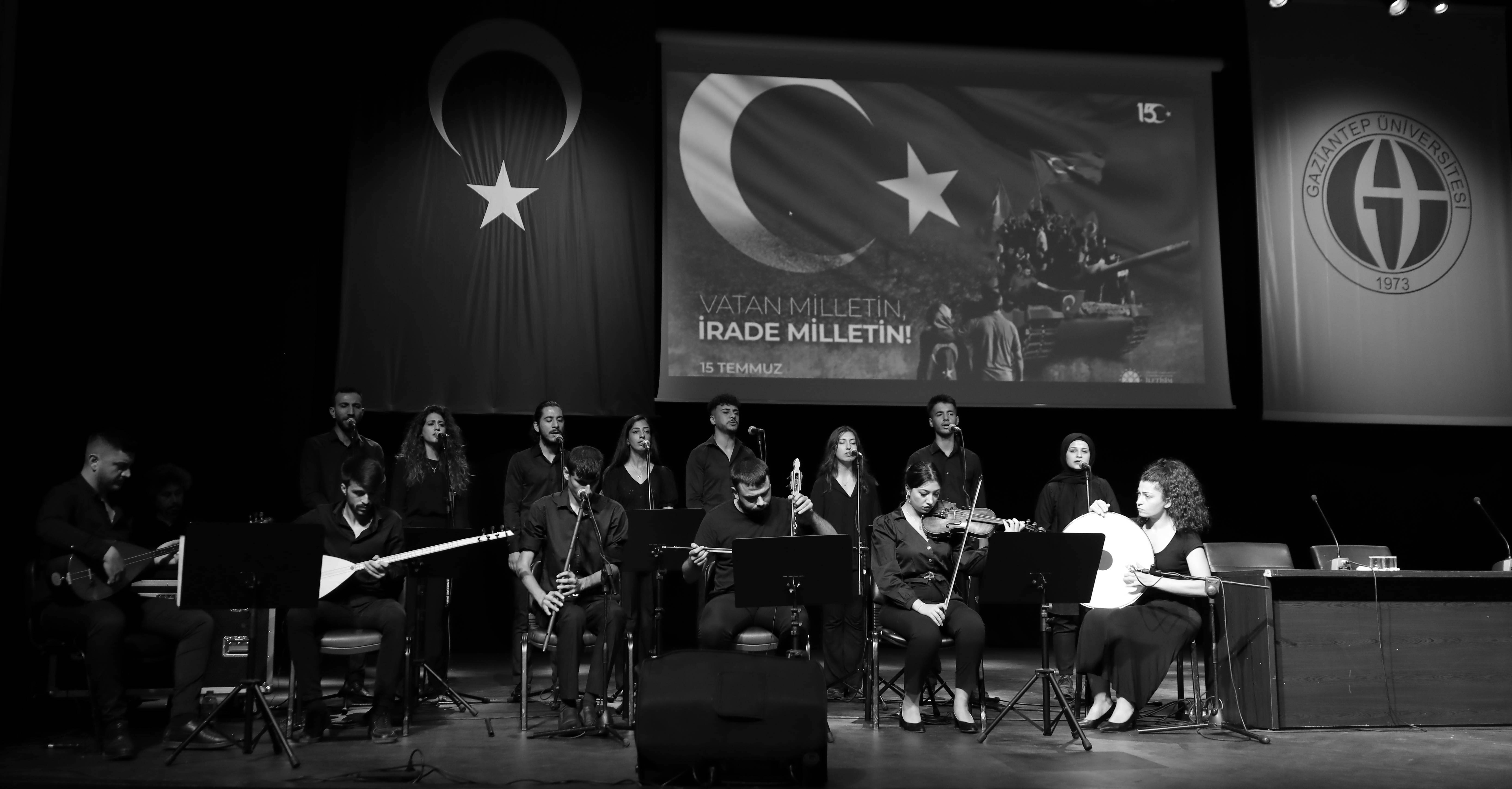 Ülgen Konukoğlu Cami İmam Hatibi Hafız Musa Bilir tarafından Kur’an-ı Kerim Tilaveti ve Gaziantep İl Müftüsü Dr. Hüseyin Hazırlar tarafından şehitlerimize edilen dua ile başlayan etkinlik, Güzel Sanatlar Fakültesi Dekanı Prof. Dr. Mustafa Cevat Atalay koordinasyonunda hazırlanan “15 Temmuz Fotoğrafları Gösterimi” ile devam etti. Fotoğraf gösteriminden sonra koordinatörlüğünü Öğr. Gör. Adil Çete’nin yaptığı Türk Musikisi Devlet Konservatuarı öğretim elemanları ve öğrencileri tarafından hazırlanan “Kahramanlık Türküleri ve Ağıtlar” müzik dinletisi sunuldu.