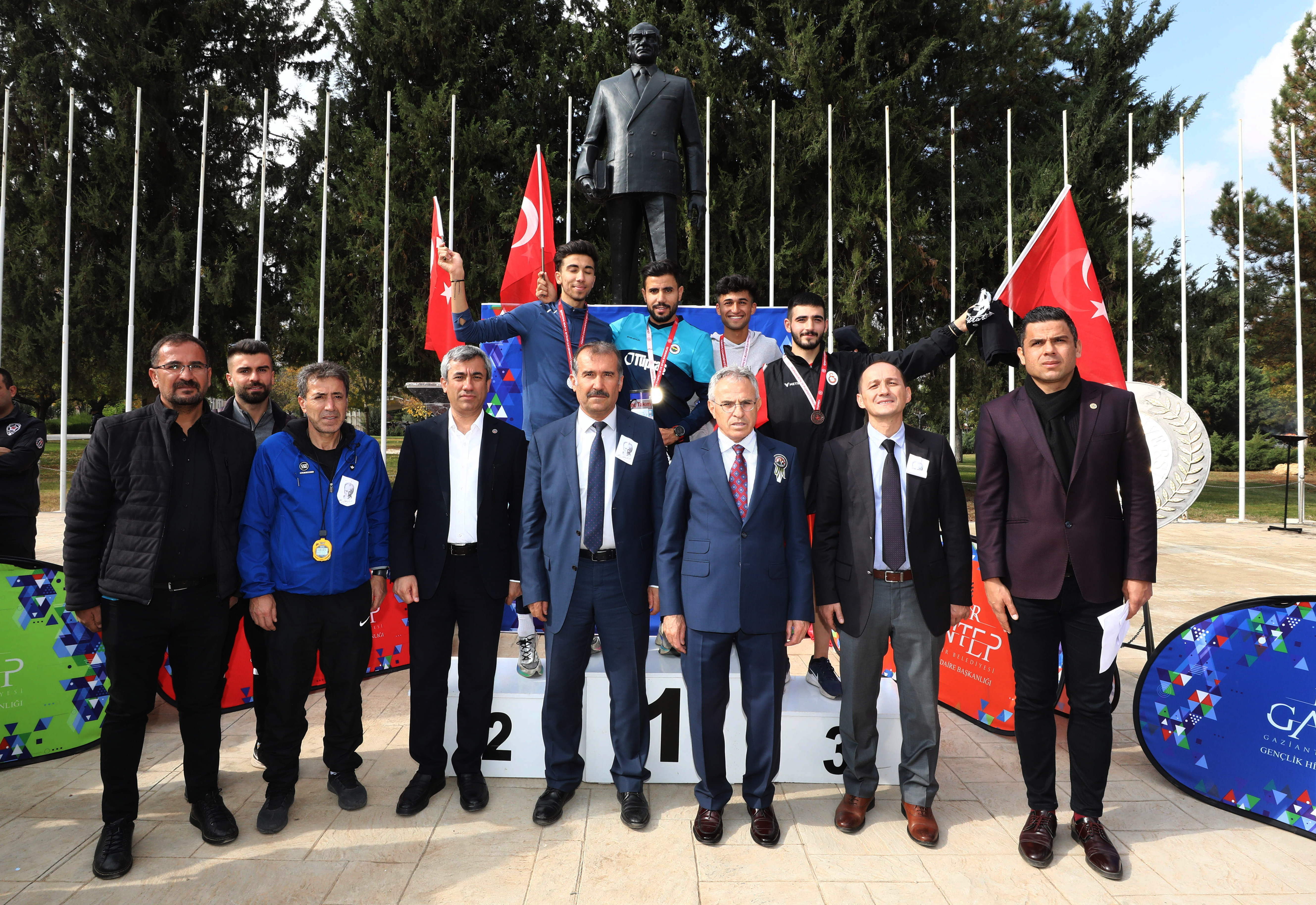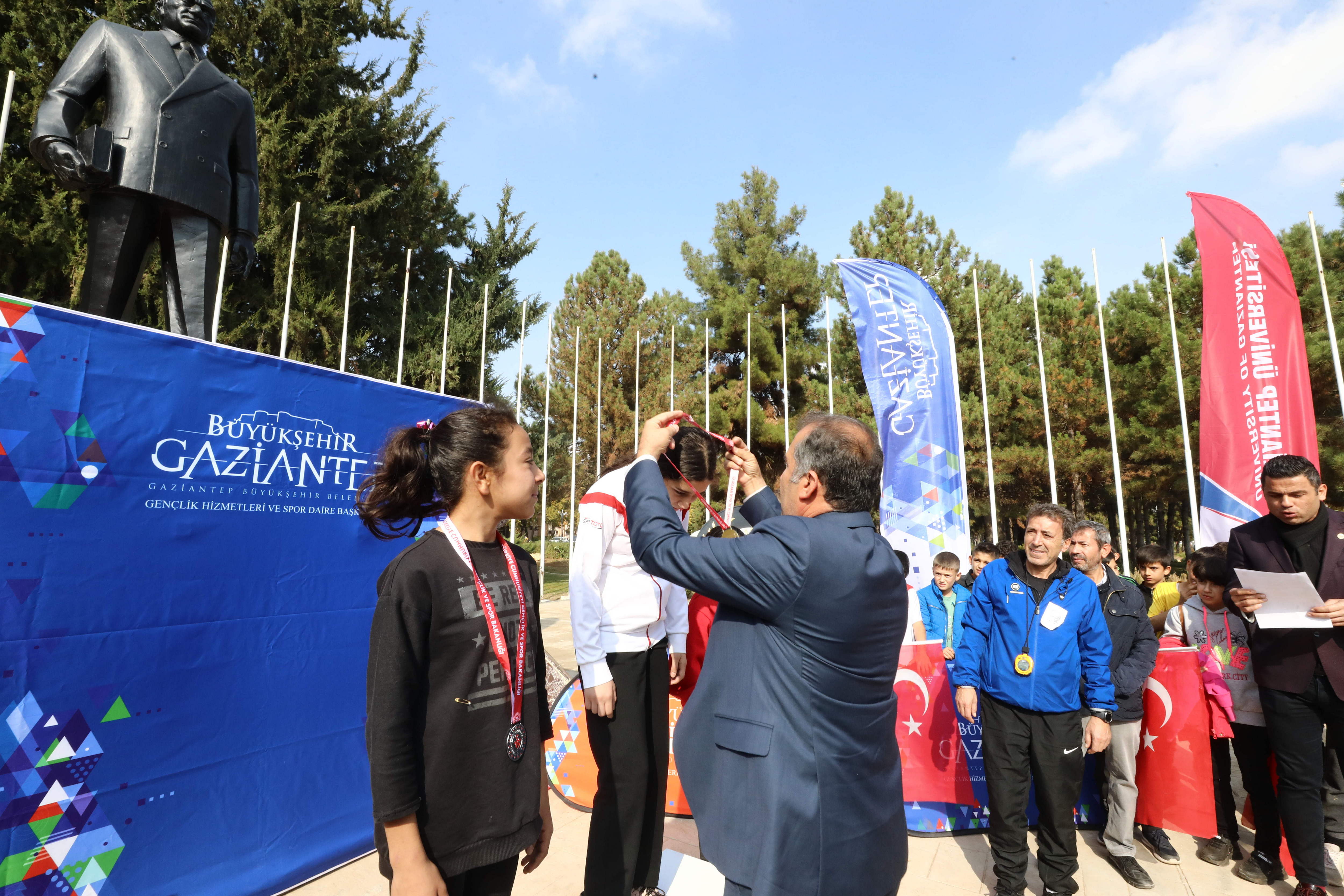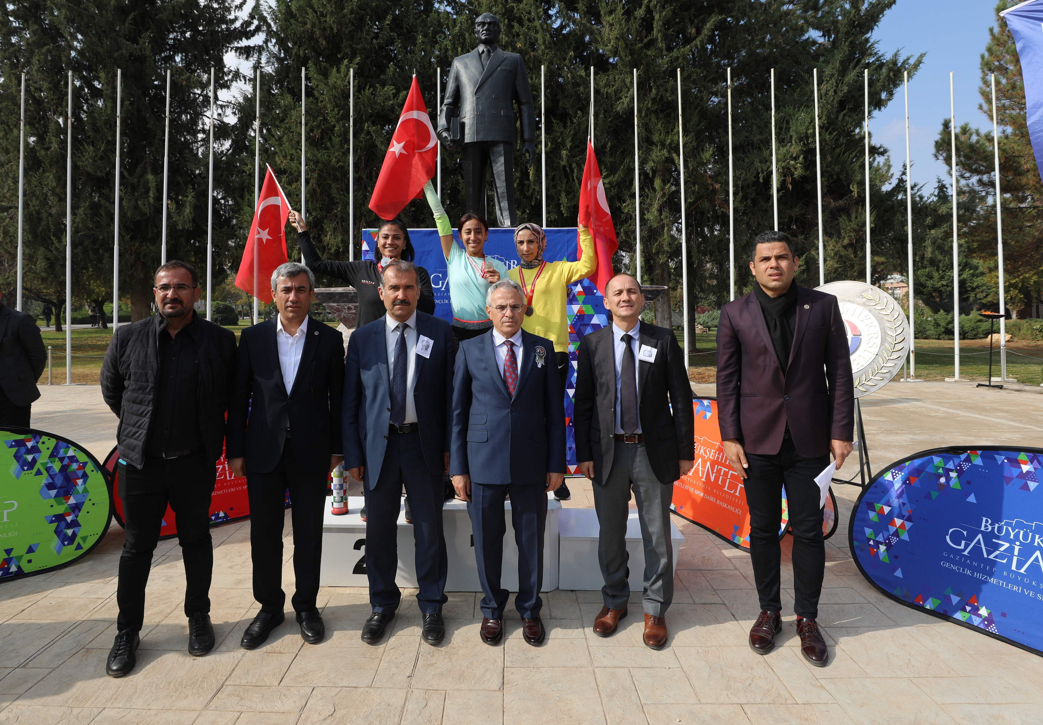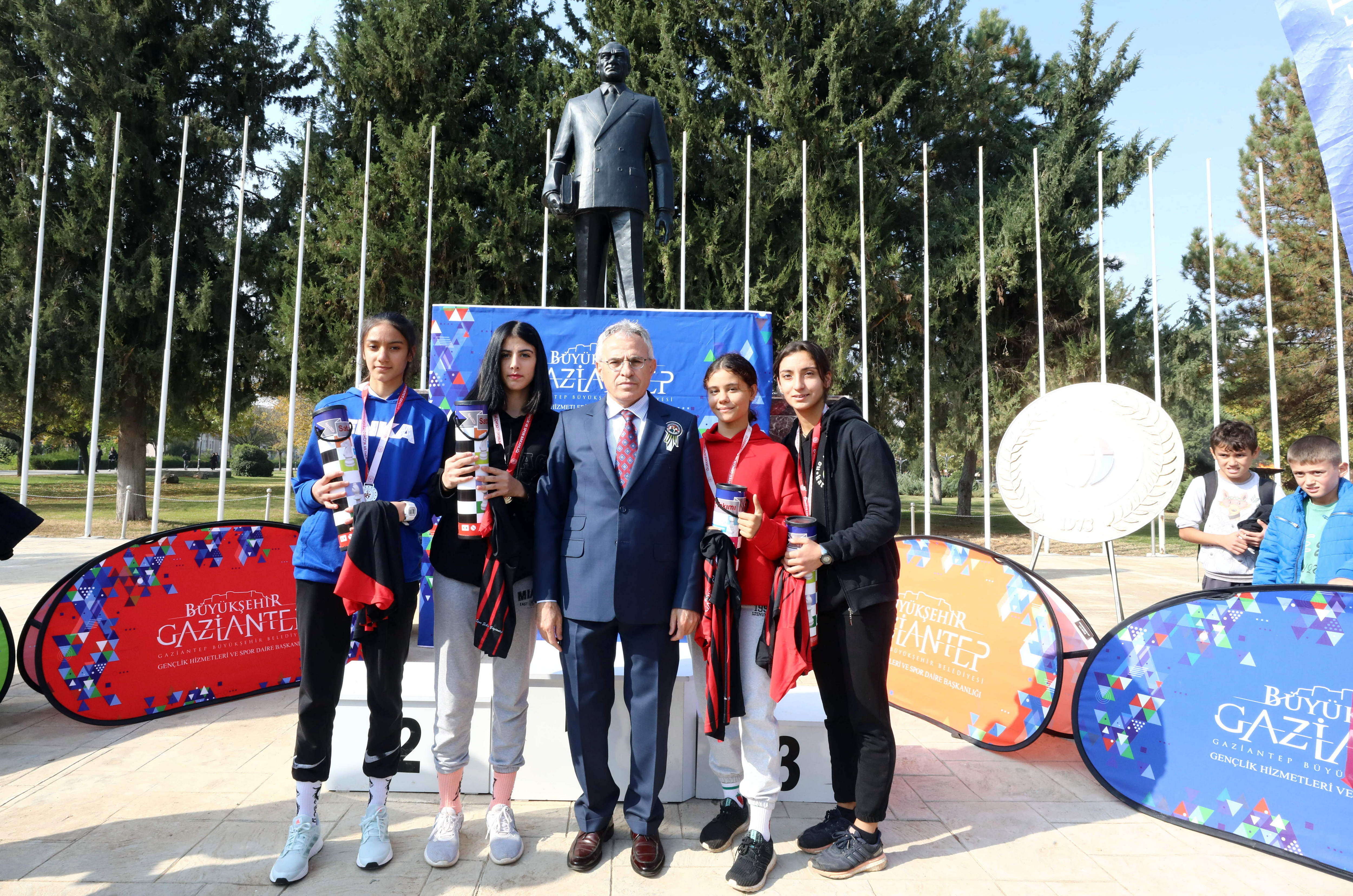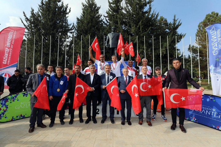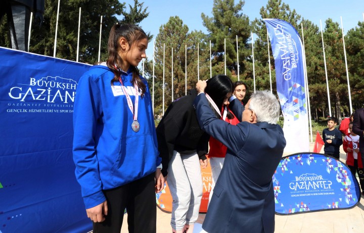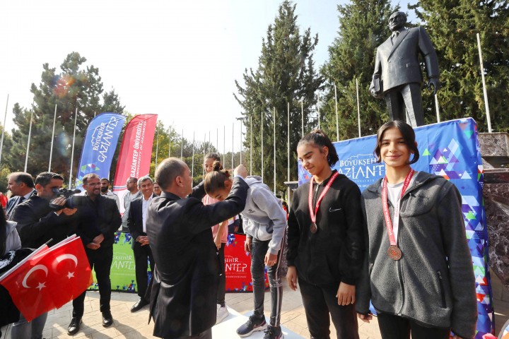 Koşuda dereceye girenlere madalya ve hediyelerini GAÜN Rektörü Prof. Dr. Arif Özaydın, Rektör yardımcıları; Prof. Dr. Recep Yumrutaş, Prof. Dr. Ayşe Balat ve Spor Bilimleri Fakültesi Dekanı Prof. Dr. Yavuz Saka tarafından verildi.