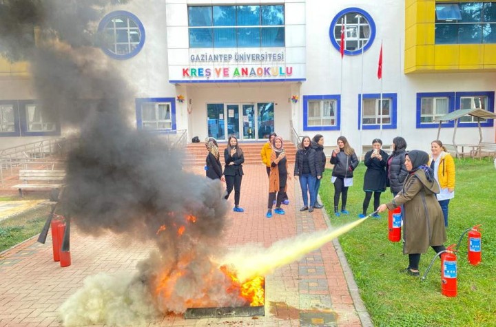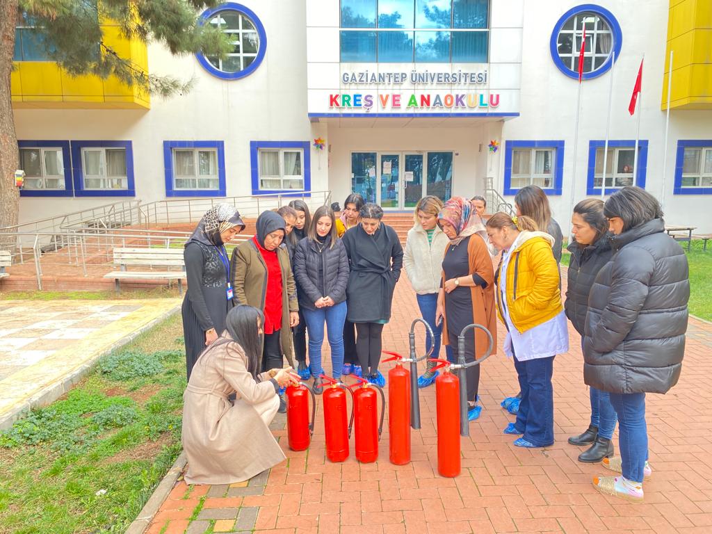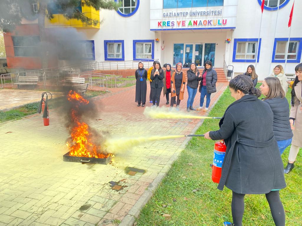 Gaziantep Üniversitesi (GAÜN) Kreş ve Anaokulu Müdürlüğü personeline Sivil Savunma Uzmanı Hanife Eyyüp tarafından yangın eğitimi verilerek, yangın tatbikatı çalışması yapıldı.