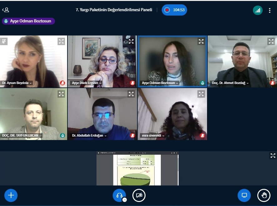Panelin ilk bölümünde, 7. Yargı Paketi kapsamında İcra İflas Hukuku alanındaki değişiklikleri irdelemek üzere konuşan Dr. Öğr. Üyesi Aysun Beydola; “Konutta Haciz Uygulanması” ile “Taşınır ve Taşınmaz Malların Haczinin Kapsamına Getirilen Sınırlandırmalar” konuları üzerinde durdu. İkinci bölümde Ticaret Hukuku alanındaki değişiklikleri ele alan Doç. Dr. Tayfun Ercan; “Basit Yargılama Usulündeki Parasal Sınırın Artırılması” ile “Taşınır ve Taşınmaz Malların Haczinin Kapsamına Getirilen Sınırlandırmalar” konu başlıkları üzerinden değerlendirmelerini paylaştı. Üçüncü bölümde Ceza ve Ceza Muhakemesi Hukuku alanındaki değişiklikler hakkında; “Türk Ceza Kanununda Yapılan Değişiklikler” , “İnfaz Kanununda Yapılan Değişiklikler” ve “Ceza Muhakemesi Kanununda Yapılan Değişiklikler” başlıkları çerçevesinde Doç. Dr. Ahmet Bozdağ görüşlerini dile getirdi. Panelin 4. bölümünde Arabuluculuk alanındaki değişiklikler hususunda; “Arabuluculuk Alanındaki Değişikliklerin Uygulamaya Etkileri” konu başlığı çerçevesinde Uzman Arabulucu Avukat Ayşe Dilek Ergüler tarafından, “Arabuluculuk Alanında Yapılan Değişikliklerin Alman Hukuku ile Karşılaştırmalı Değerlendirilmesi” konusunda ise Dr. Öğr. Üyesi Abdullah Erdoğan tarafından açıklamalar yapıldı.
