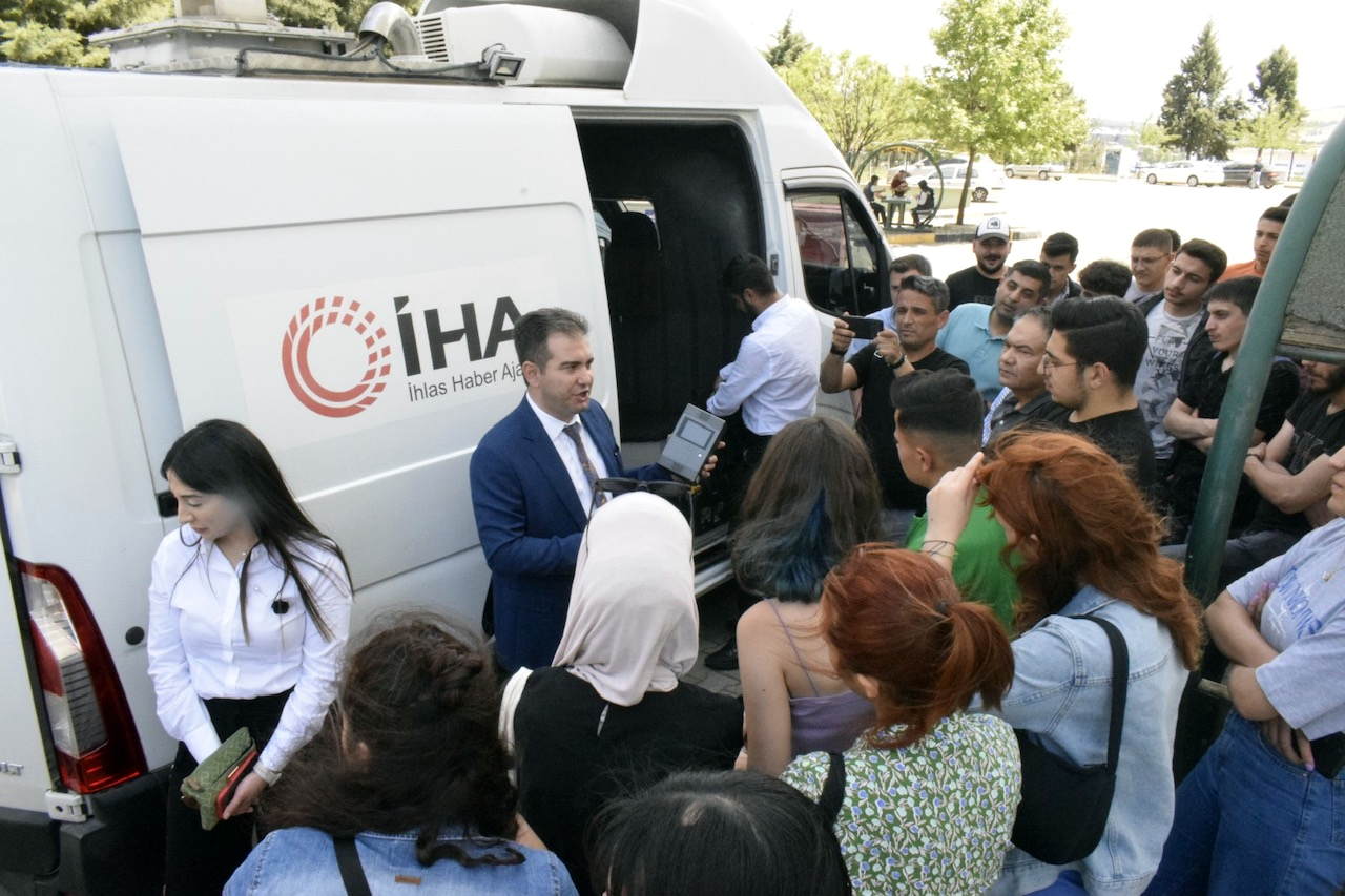 Canlı yayın aracında bulunan teknik cihazlar, canlı yayın sürecinde takip edilen aşamalar, röportaj teknikleri, muhabirin beden dili vb. konularda bilgiler veren İHA Bölge Müdürü A. Orhan Akın, öğrencilere tek tek uygulama da yaptırdı. İlk defa bir canlı yayın aracını yakından görme ve inceleme imkanı bulan öğrencilerin heyecanlı oldukları gözlendi.