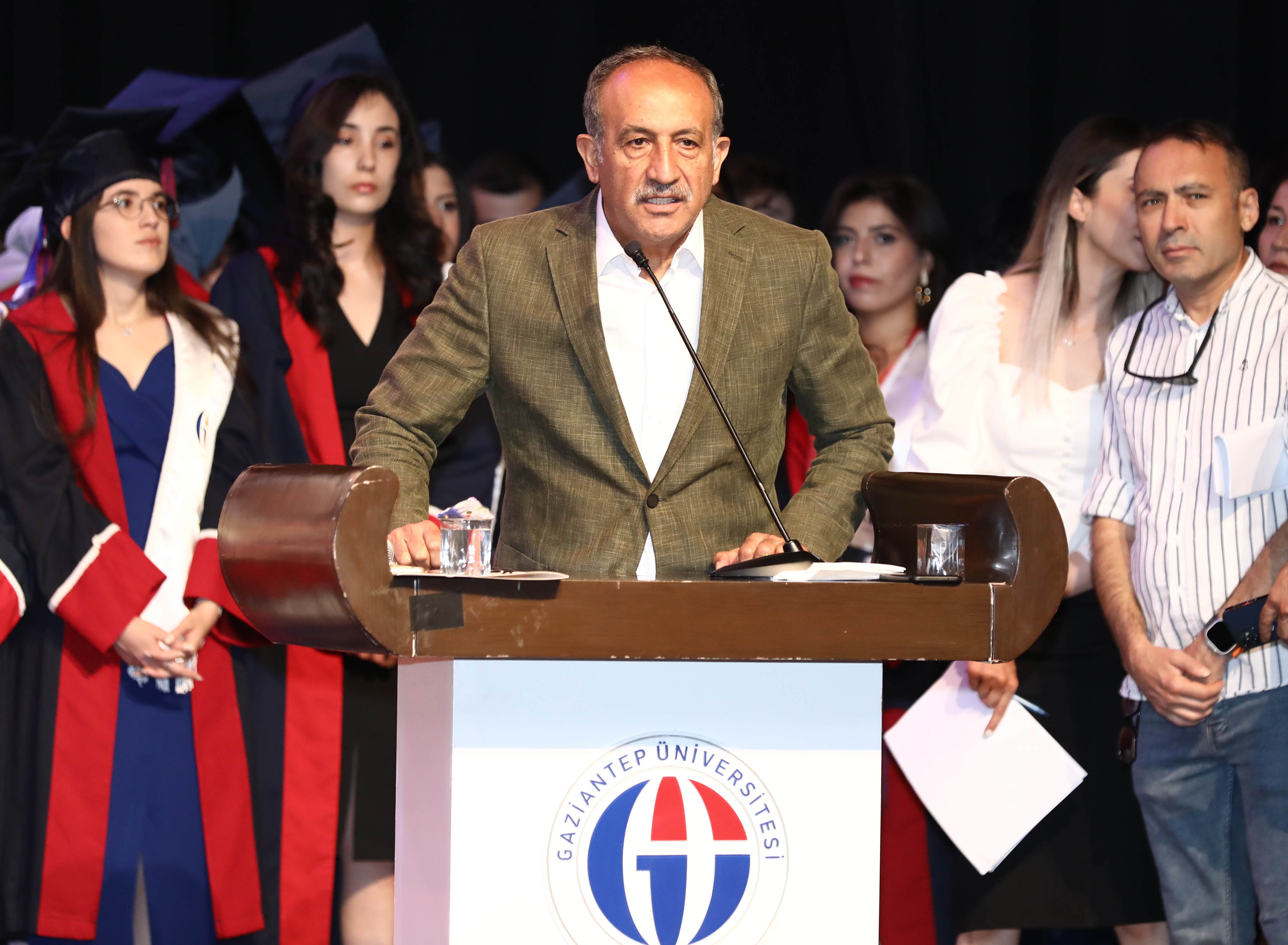 Mezuniyet töreninin açılışında konuşan GAÜN Rektör Yardımcısı Prof. Dr. Mustafa Sarıbıyık, mezun öğrencilerin Türkiye’deki güçlü üniversitelerin birinden mezun olmalarının haklı gururunu ve mutluluğunu yaşadıklarını belirterek, eğitim hayatını başarıyla tamamlayan mezun öğrencileri tebrik etti. Prof. Dr. Sarıbıyık, “Ailelerin mürüvveti olduğu kadar, bizimde eğitim ve öğretim açısından mürüvvetimizdir. Üniversiteler bilimi inşa etmek, öğrenci yetiştirmek, insan yetiştirmek noktasında olduğu kadar şehirle, şehrin sanayisiyle bütünleşmek, halkın içinde halkla var olmak gibi gaye ve hedefleri vardır. Yaşanılan depremler sonrası üniversitemiz eğitim yuvası olmanın yanı sıra Gazianteplilerin sığındığı bir yuvaya dönüşerek halka karşı olan sorumluluğunu en iyi bir şekilde yerine getirdi” şeklinde konuştu.