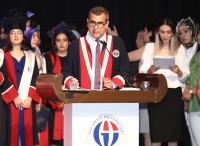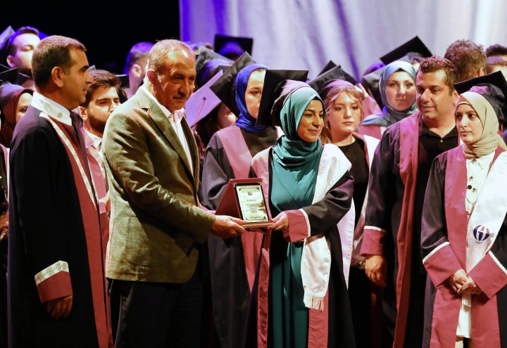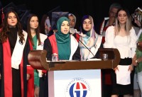 Mezun öğrenciler adına konuşan dönem birincisi Büşra Çelik ise, “Mustafa Kemal Atatürk’ün ‘Eğitimdir ki bir milleti ya özgür, bağımsız, şanlı, yüksek bir topluluk halinde yaşatır; ya da esaret ve sefaletle terk eder’ sözünde de vurguladığı gibi milletimizin şanlı ve yüksek bir topluluk halinde yaşaması için biz gençlere büyük görevler düştüğünün bilincindeyim. İnanıyorum ki, Türk ulusu dili, kültürü, tarihi ve saygın kimliğiyle aydınlık yarınlara el ele güçlü biçimde girecektir. Bizim başarılarımız ülkemizin başarıları olacaktır” ifadelerini kullandı.