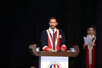 Eğitim Fakültesi Dekanı Prof. Dr. Bayram Çetin konuşmasında öğrencilere seslenerek şu ifadeleri kullandı: “Bugün sizin için farklı bir anlam taşıyor. Fakültemizden mezun olarak yaşamınızın bir dönemini kapatarak hayatınızda yeni bir dönemi başlatmış oluyorsunuz. Bu kapanan dört yıllık dönemde sizin üzerinizde birçok birimin ve kişinin emeği vardır. Siz hocalarınızla muhatap oldunuz daha çok ama perde gerisinde işlerin yolunda gitmesi için çalışan büyük bir sistem var. Rektörlüğümüz, öğrenci işleri, yemekhane hizmetleri, kütüphane hizmetleri, kampüsün alt yapı hizmetleri ve daha sayamadığım birçok ilgili kişi sizin için çalıştı. Ayrıca fakültemizde danışmanlarınız, idari personellerimiz, bölüm sekreterlerimiz, dekanlık personelleri tüm arkadaşlarımıza teşekkür ediyorum.”