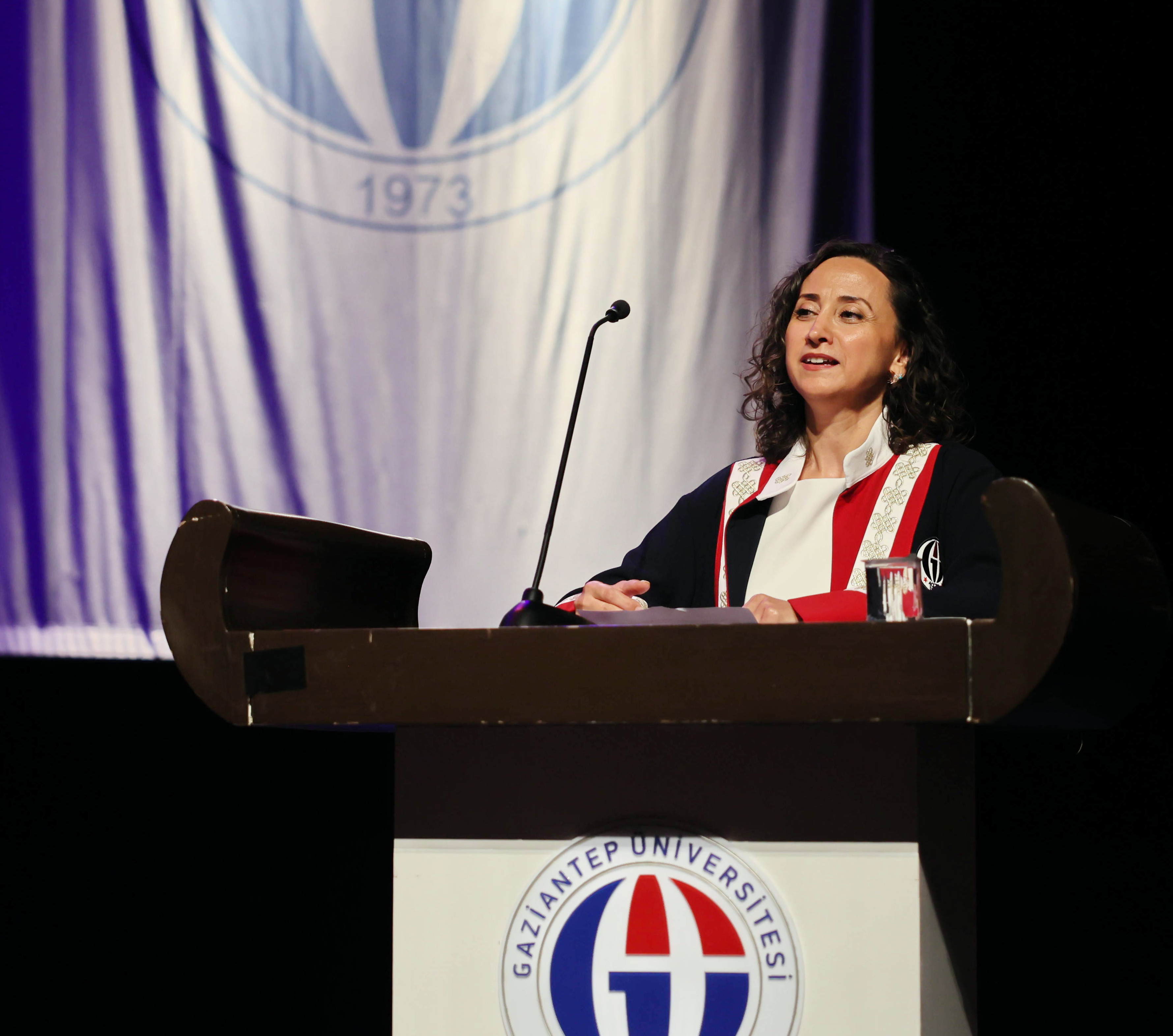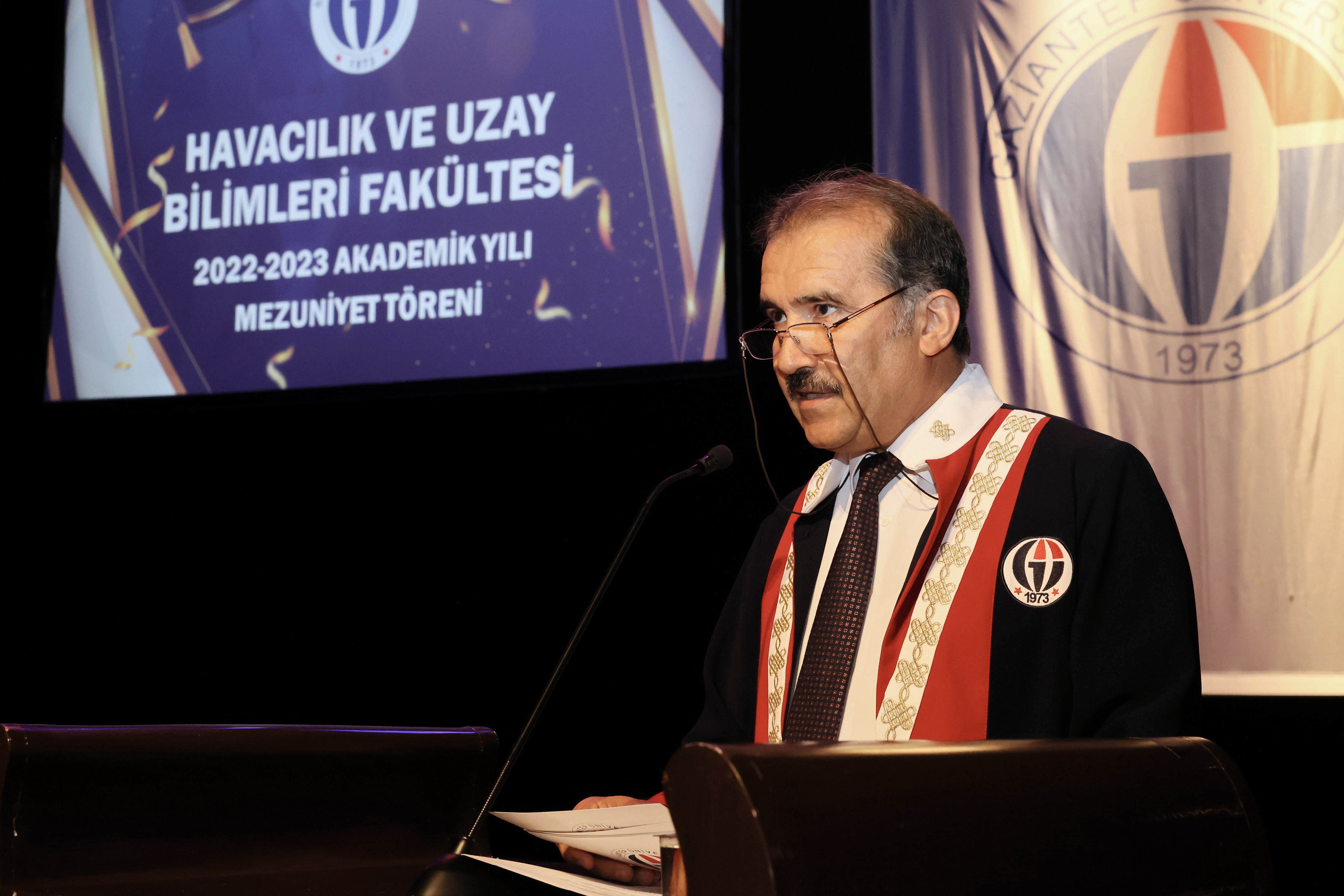 GAÜN Atatürk Kültür Sahnesi’nde gerçekleştirilen mezuniyet töreninin açılışında konuşan GAÜN Rektör Yardımcısı ve Havacılık ve Uzay Bilimleri Fakültesi Dekanı Prof. Dr. Recep Yumrutaş, mezun öğrencilerin Türkiye’nin en iyi fakültelerinden biri olan Gaziantep Üniversitesi Havacılık ve Uzay Bilimleri Fakültesinden mezun olduklarını ifade ederek, mezun olma başarısını gösteren öğrencileri tebrik etti. Prof. Dr. Yumrutaş, “Mezun öğrencilerimiz fakültemizde aldıkları eğitim, sahip oldukları bilgi birikimi ve kazandıkları tecrübeyle kendilerine daha güzel bir gelecek hazırladılar. Öğrencilerimiz eğitim süresince TEKNOFEST ve benzeri yarışmalara, etkinliklere ve uygulamalı eğitimlere katılıyorlar. Bizler üniversite olarak öğrencilerimizden maddi ve manevi desteğimizi esirgemiyoruz. Netice olarak, öğrencilerimiz havacılıkla ilgili son teknolojileri öğreniyor, önemli dereceler alıyor ve hayata daha özgüvenli hazırlanıyorlar. Bunun sonucu olarak Türk Hava Yolları, TUSAŞ, ASELSAN, HAVELSAN, Roketsan gibi ülkemizin saygın kurumlarından iş teklifi alıyorlar. Bu durum üniversitemiz fakültemiz ve hepimiz için gurur verici bir durum. Bundan sonra onlara güveniyor, destekliyor ve arkalarında duruyoruz” şeklinde konuştu.